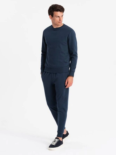 Męska dresowa bluza kangurka z kapturem i naszywką w stylu college – granatowa V2 OM-SSNZ-0144