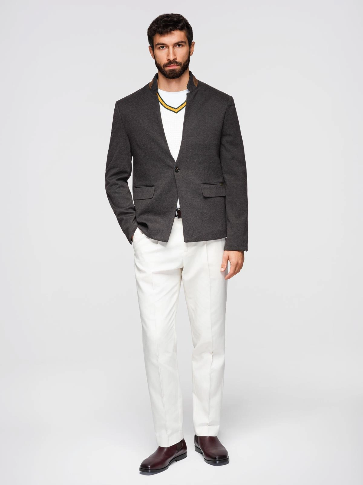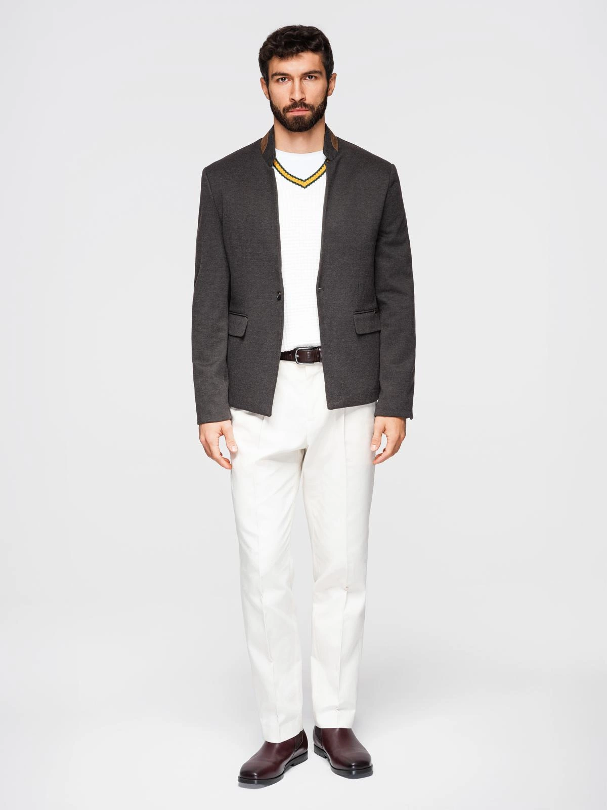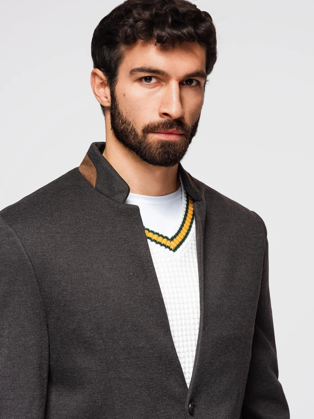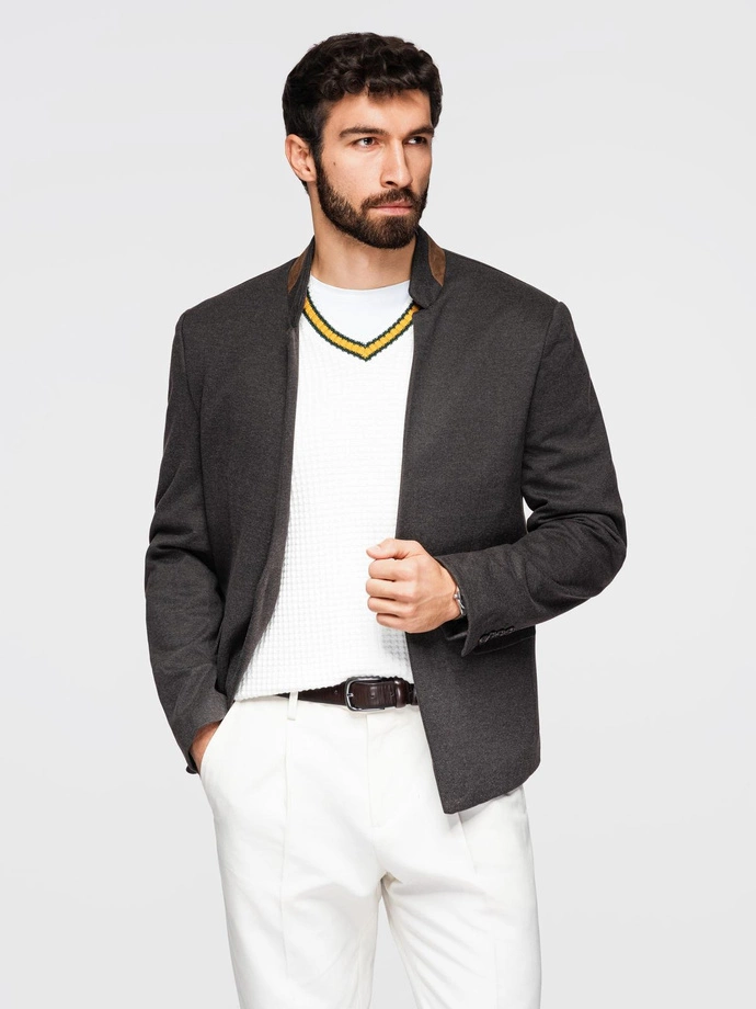 This model from the Ombre Quintessence collection redefines the classic men's jacket. Its unusual cut will work well both in smart casual conventions and in more formal settings. Here, the classic collar is replaced by a stand-up collar with soft eco leather trim. The jacket delights with a delicate structure of materials, and nobility is given by a melange fabric with rayon