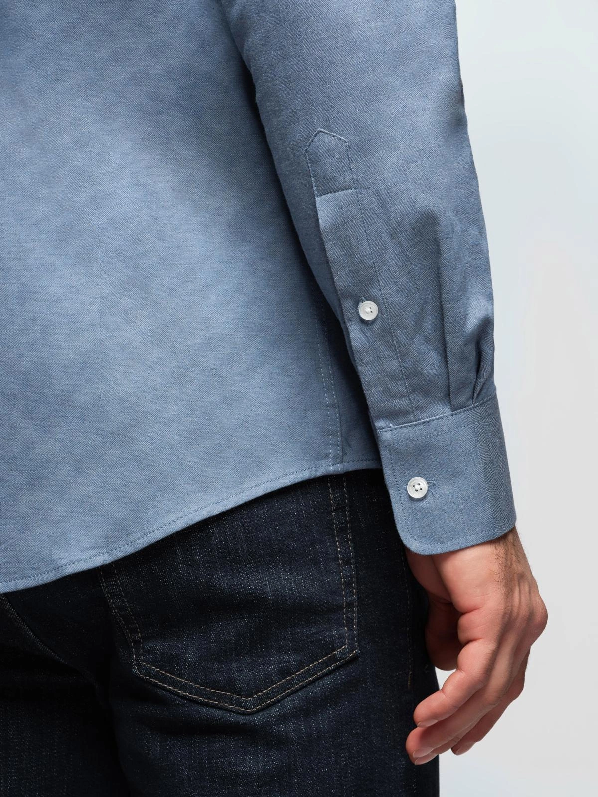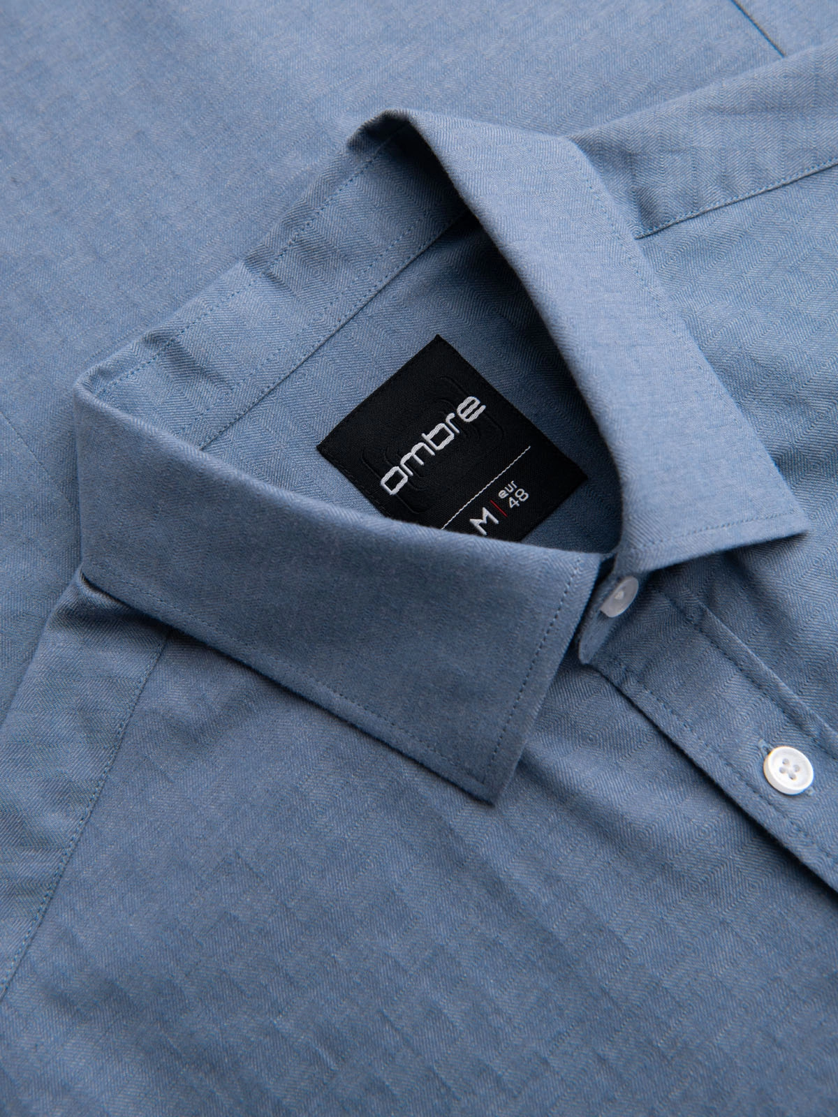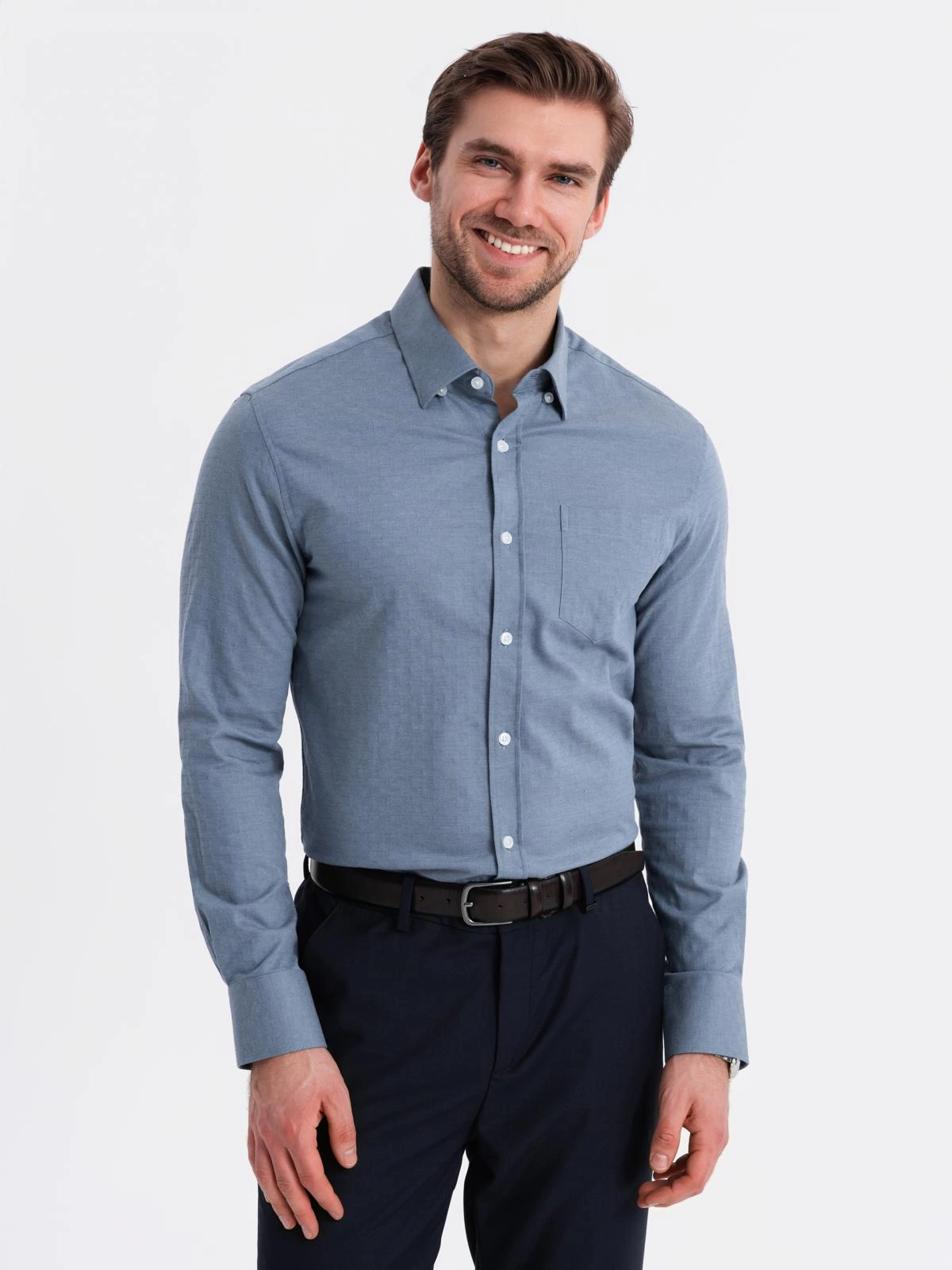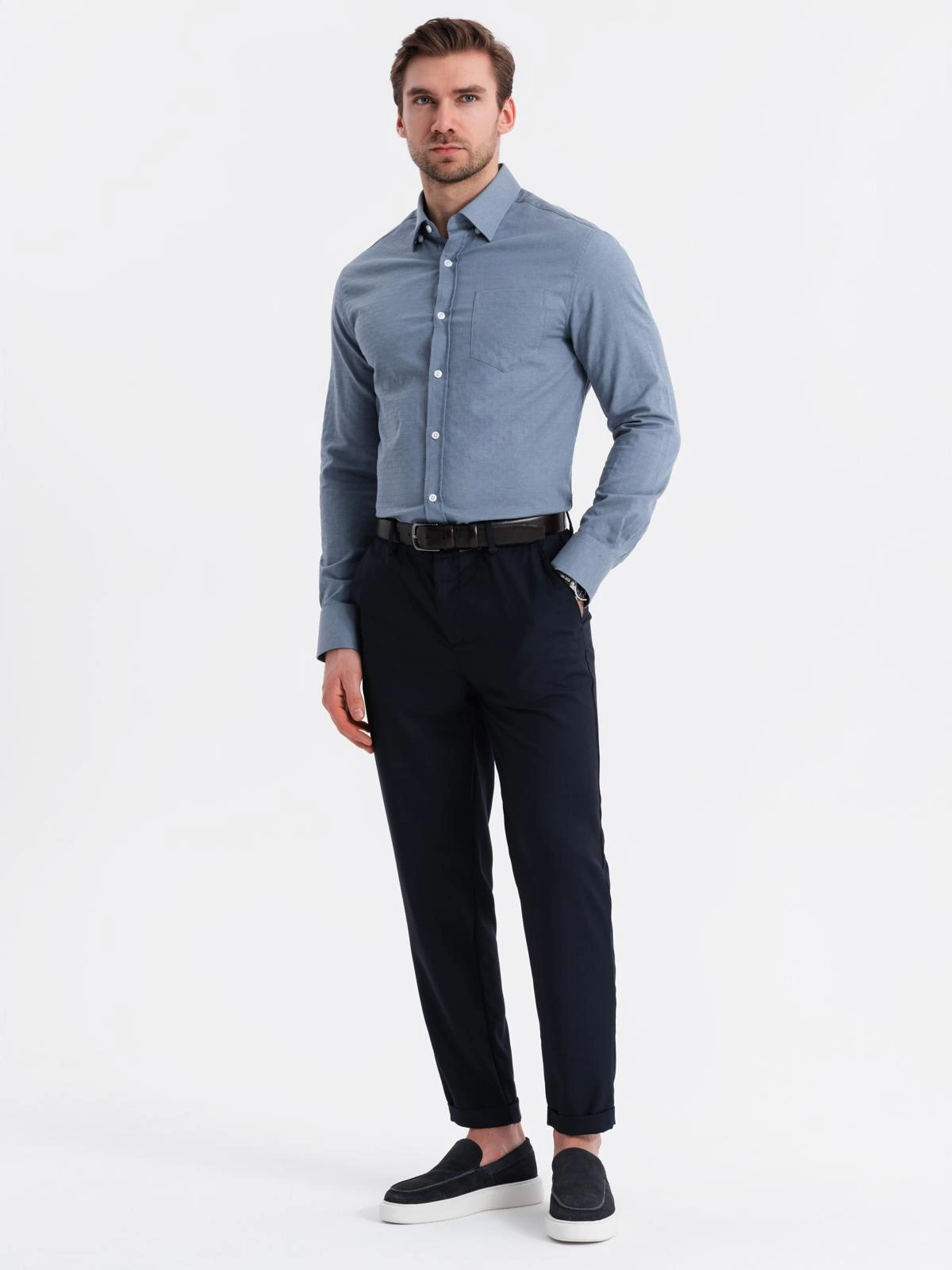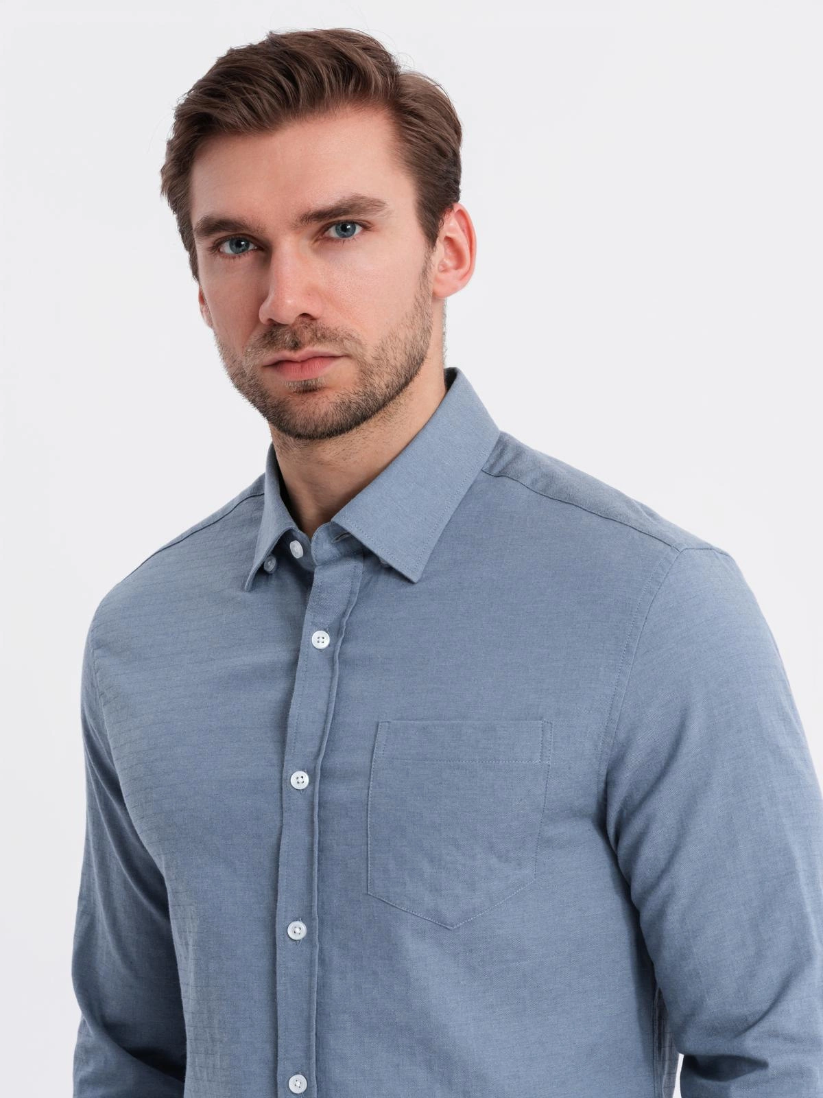 A delicate shirt made of fabric with an unusual weave will add elegance to many casual sets, especially outfits for work. The fitted cut subtly accentuates the male silhouette, while the soft cotton with a blend of spandex ensures freedom of movement. The classic collar with hidden button closure makes the shirt look neat and impeccable. The overall look is enhanced by tasteful details in the form of a practical breast pocket and decorative embroidery inspired by handwriting.