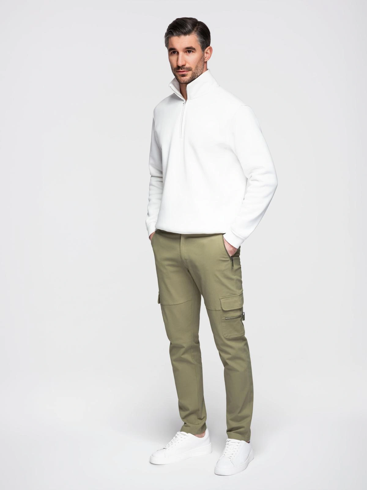 This model of cargo pants was designed to meet the expectations of practical men. The trousers have a large number of capacious pockets with thoughtfully designed fasteners. Zippers here perform not only a functional role - expressive fasteners finished with stylish tags are also responsible for their unusual design. The pants are comfortable to put on and wear, thanks to airy and soft cotton with added elastane