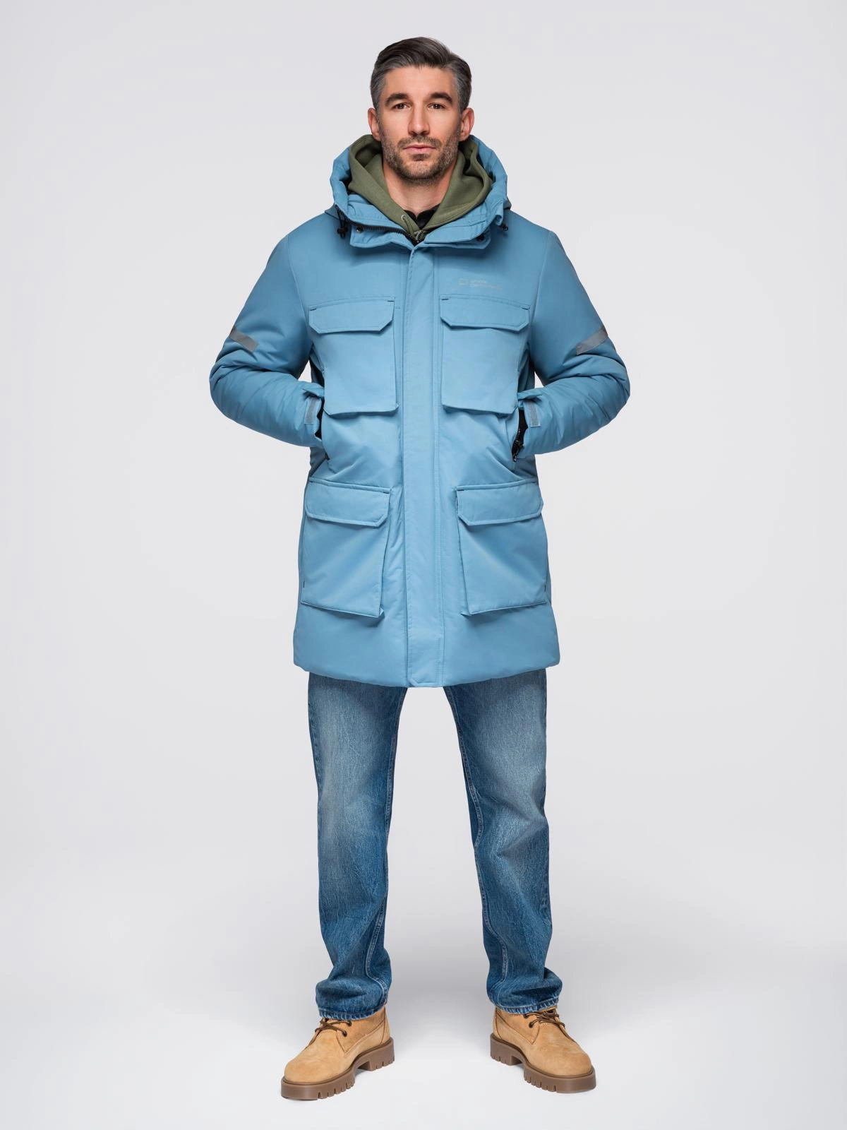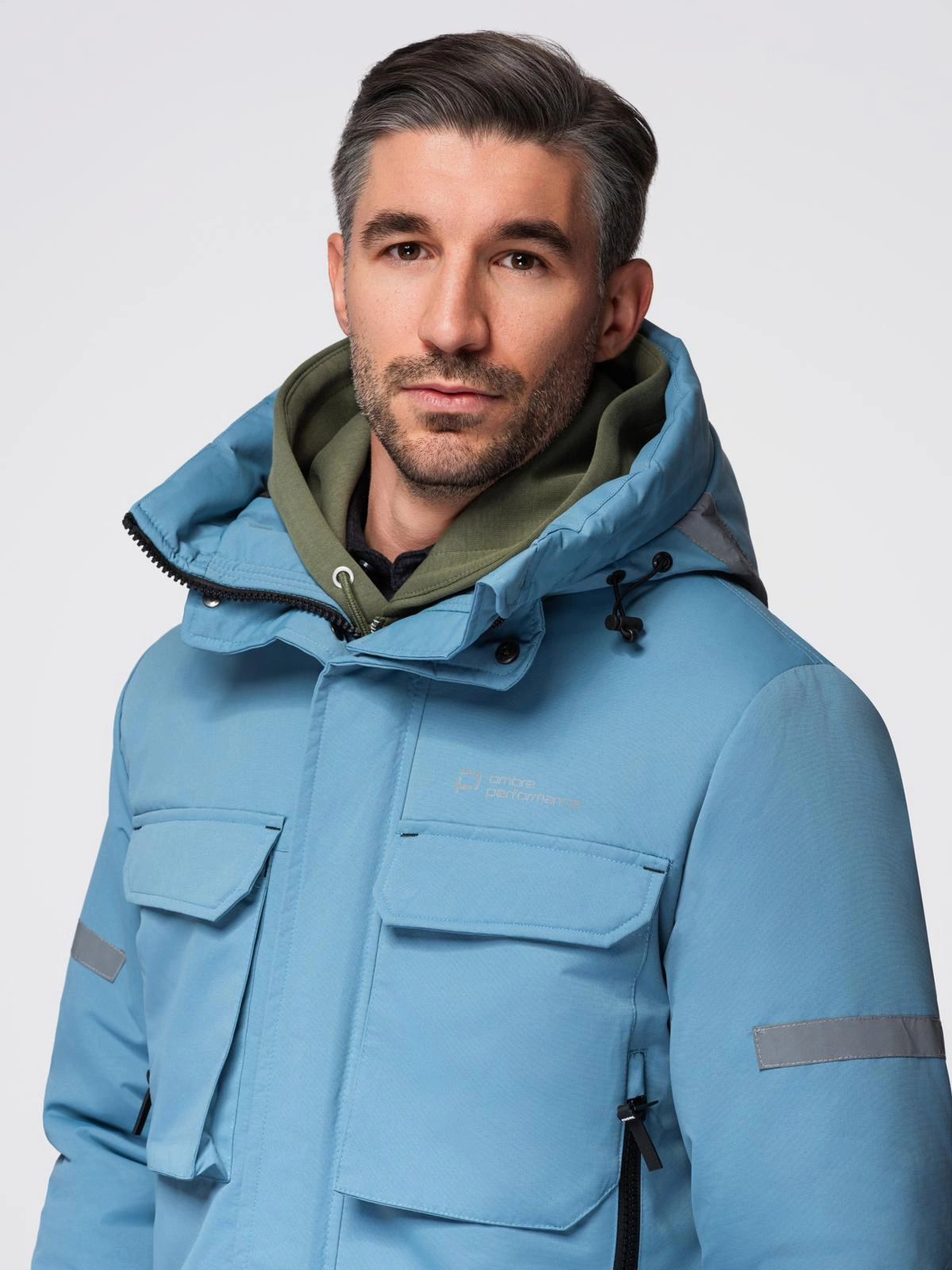 Down jacket with lightweight insulation is often worn by men at the turn of the seasons. The dark color scheme and stylish quilting filled with lightweight synthetic down are responsible for its timeless character. The shiny, smooth-textured fabric is very easy to clean and has a reduced susceptibility to water. A sturdy zippered neck closure and an adjustable hood with a stand-up collar create a physical shield against strong wind and rain