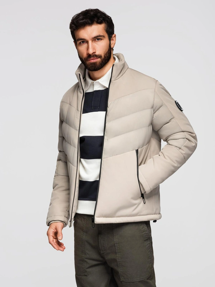 Men's quilted jacket in muted colors will appeal to lovers of simplicity and functionality. The high collar and light synthetic filling effectively protect against the cold, which translates into wearing comfort. The jacket can be worn with everyday and sporty outfits - freedom of styling is provided by a detachable hood. A rubber patch attached with Velcro gives the jacket a unique character