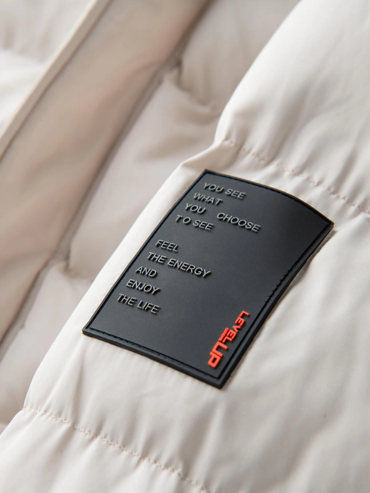 - large rectangular patch with wording on sleeve