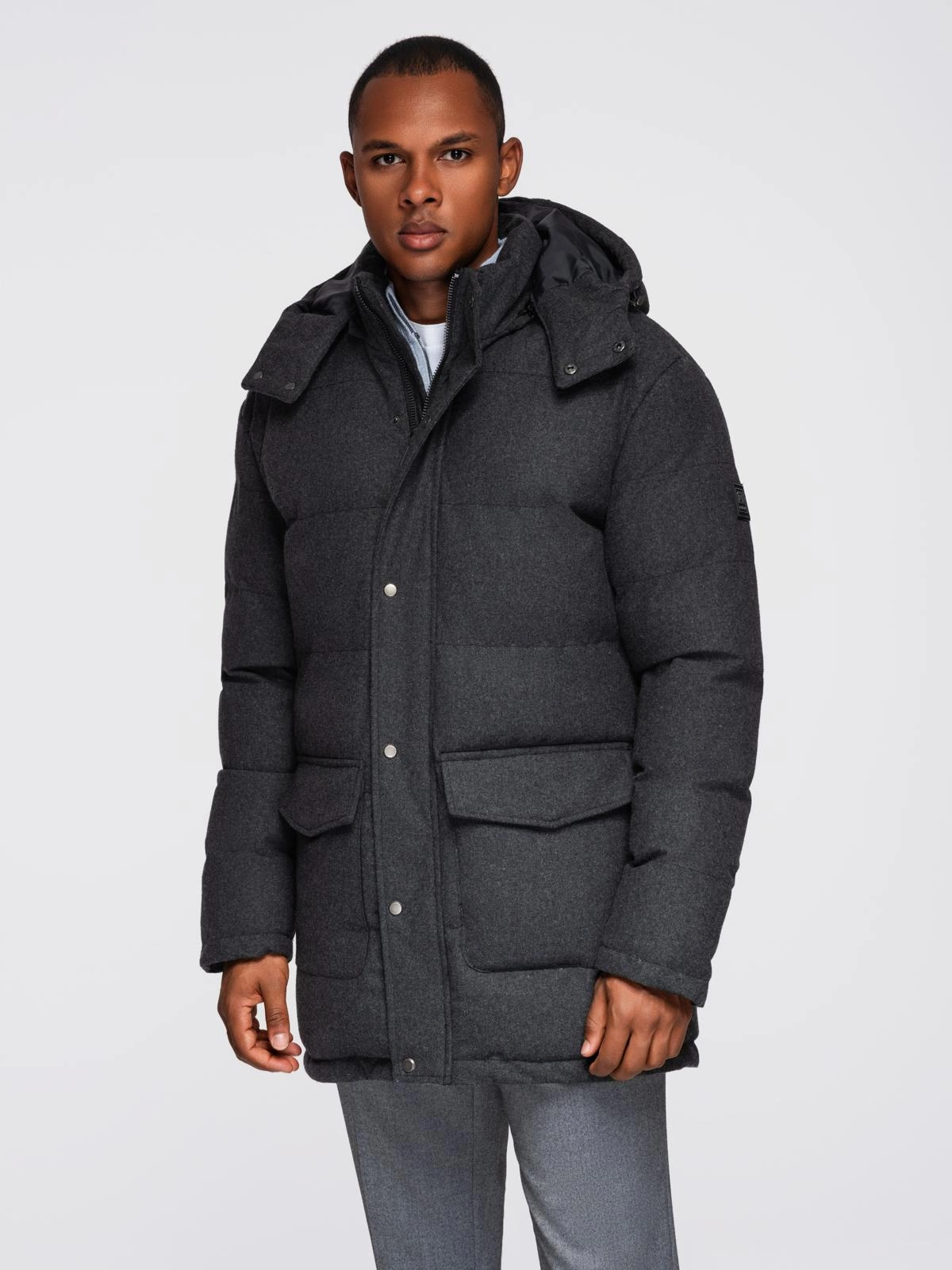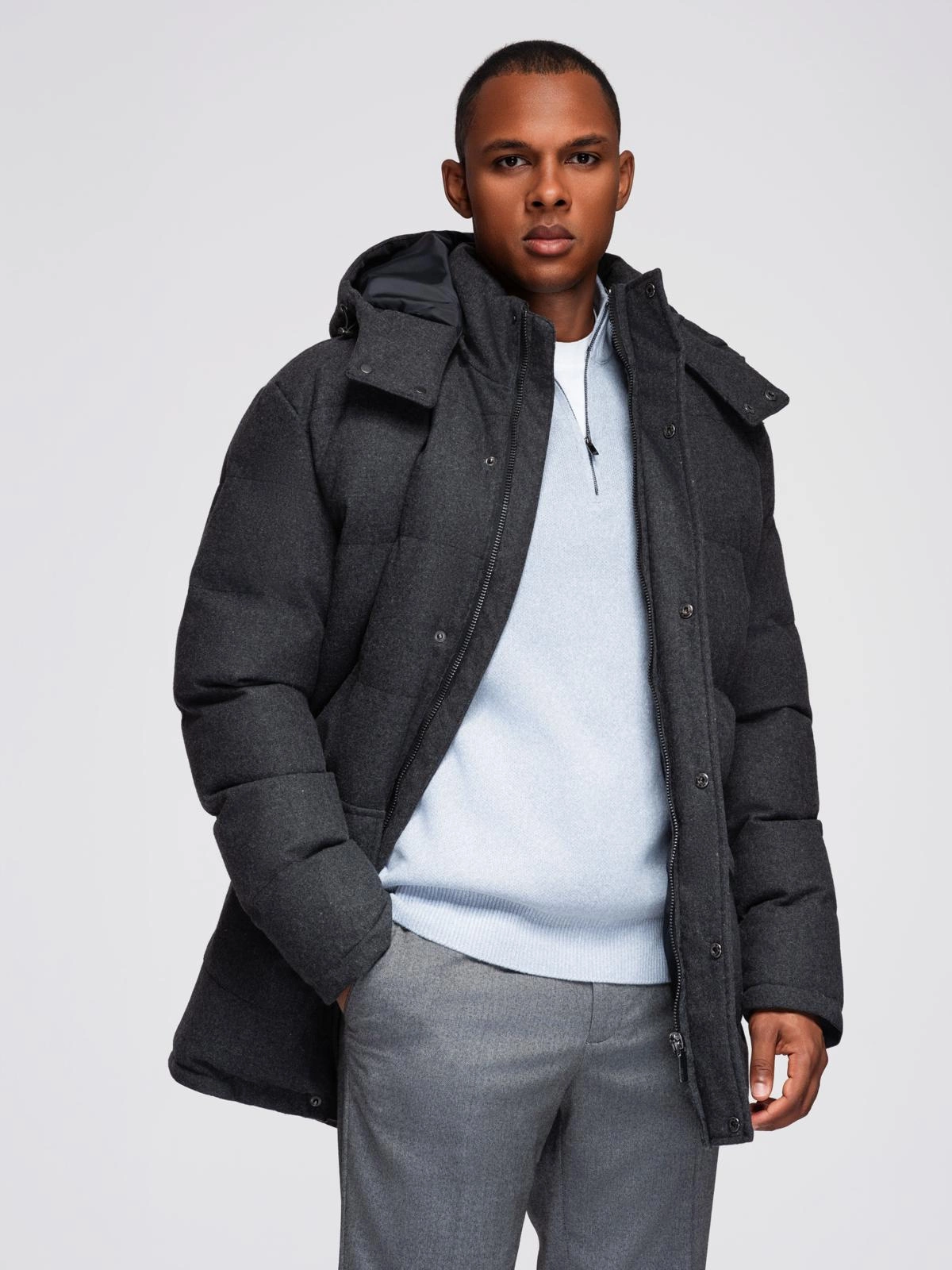 The wool parka jacket from the Ombre Quintessence collection will warm up even the biggest frostbite. The structured fabric with visible wool fibers and solid filling keeps you warm for a long time, giving you comfort especially in sub-zero temperatures. The jacket also has the advantage of large capacious pockets with flaps, testifying to the functional use of the garment. The jacket can be properly fastened at the neck, and the hood with patches allows you to effectively shield your face and neck from the cold