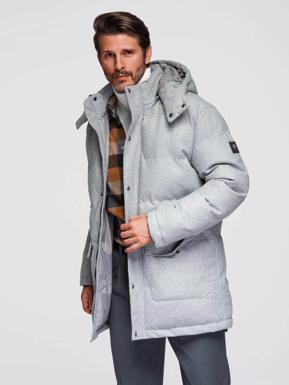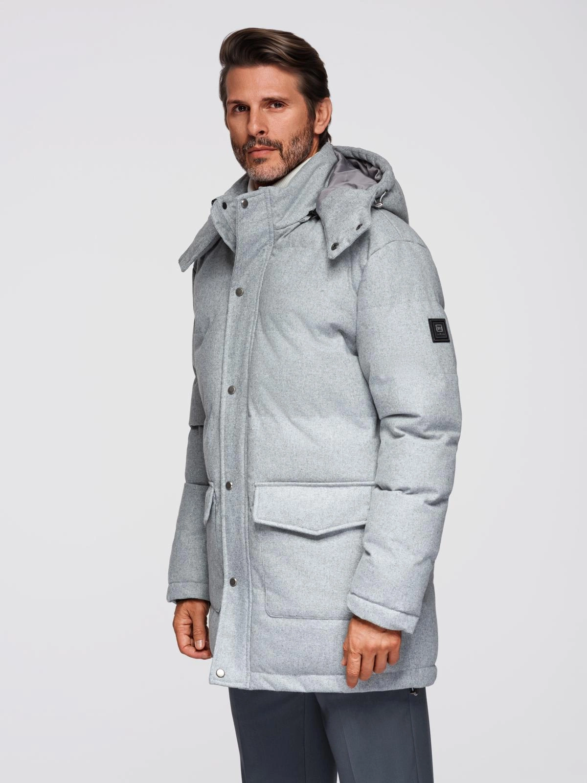 The wool parka jacket from the Ombre Quintessence collection will warm up even the biggest frostbite. The structured fabric with visible wool fibers and solid filling keeps you warm for a long time, giving you comfort especially in sub-zero temperatures. The jacket also has the advantage of large capacious pockets with flaps, testifying to the functional use of the garment. The jacket can be properly fastened at the neck, and the hood with patches allows you to effectively shield your face and neck from the cold