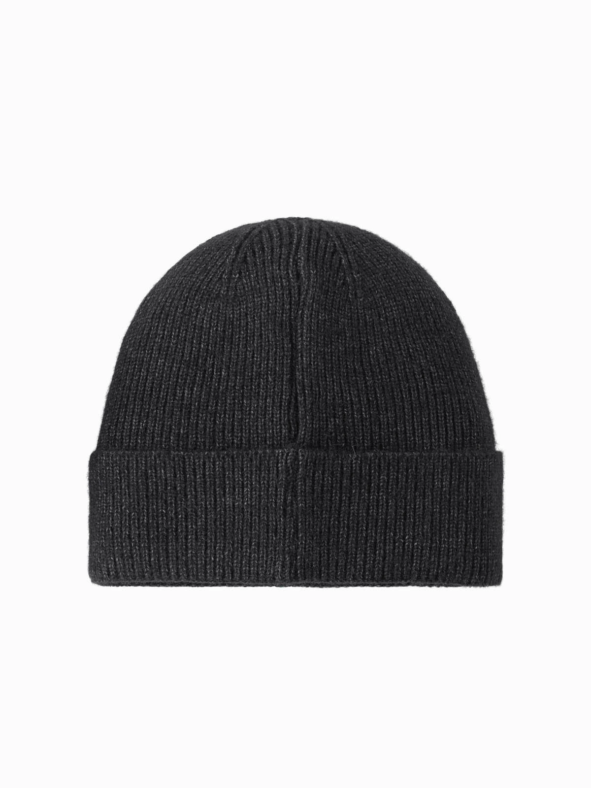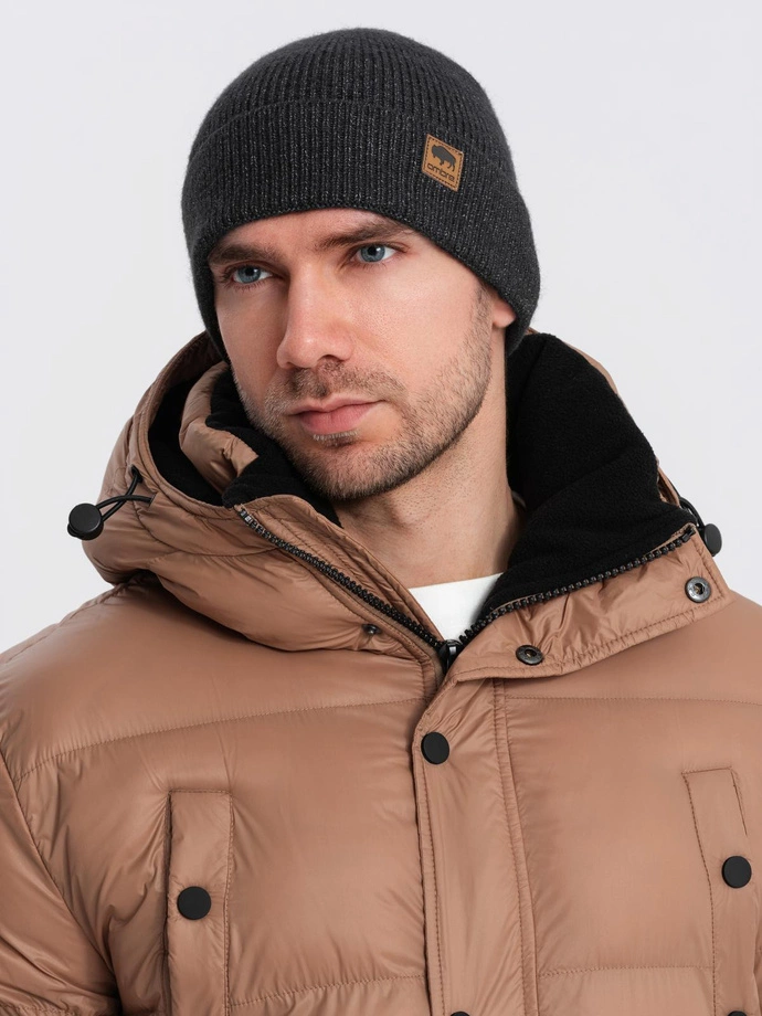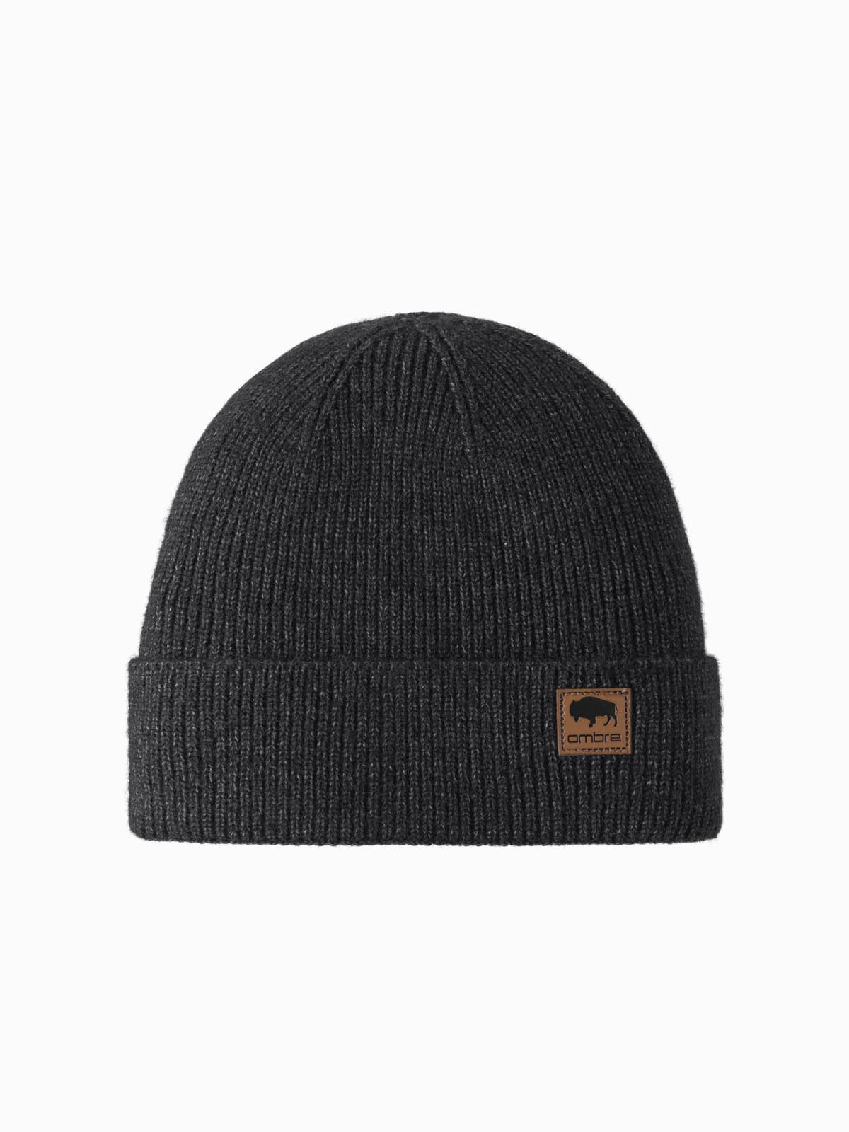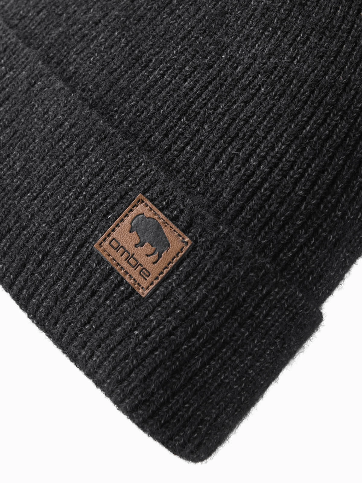 Men's knitted beanie cap with patch - black melange V1 OM-ACWH-0123