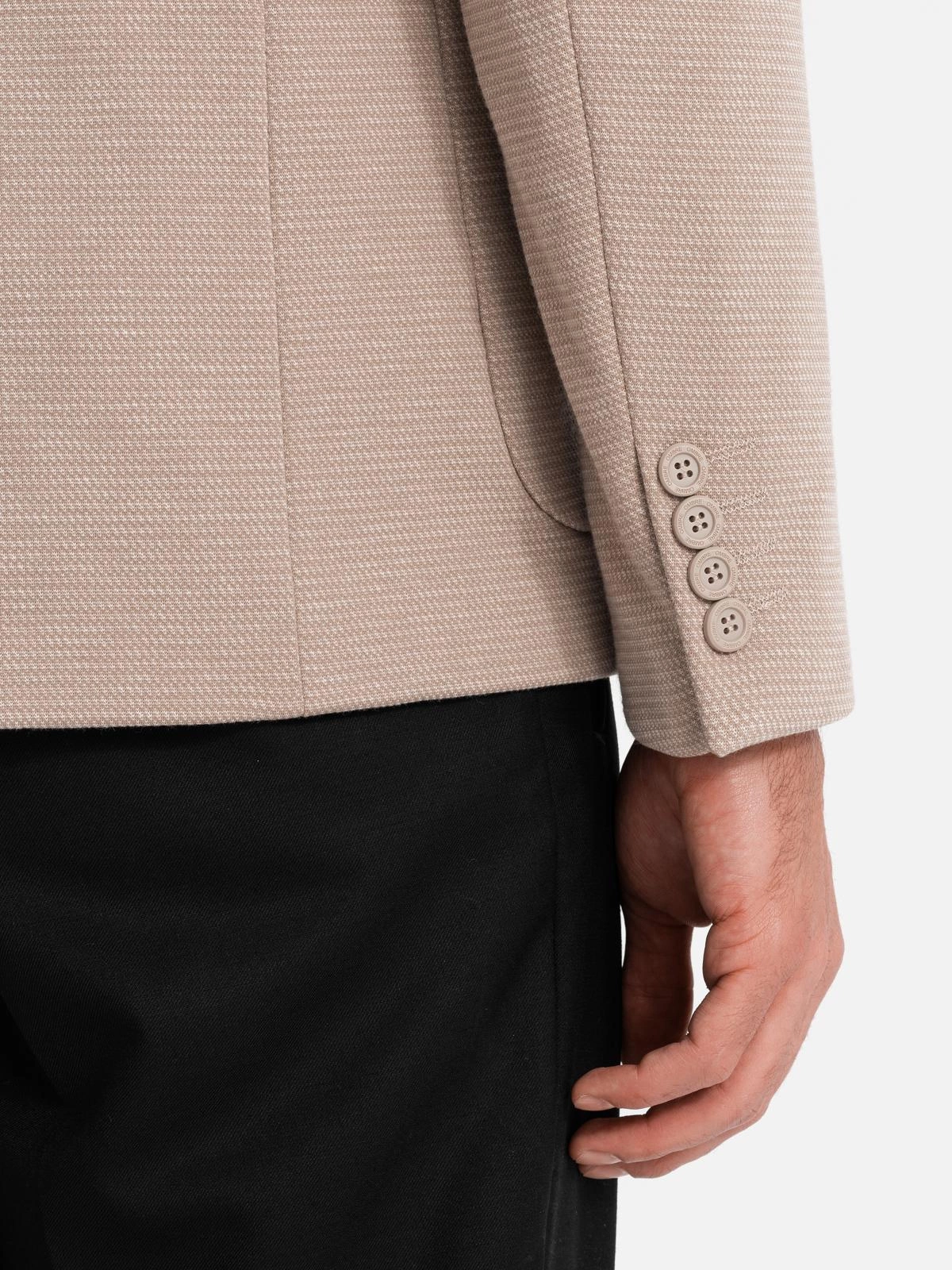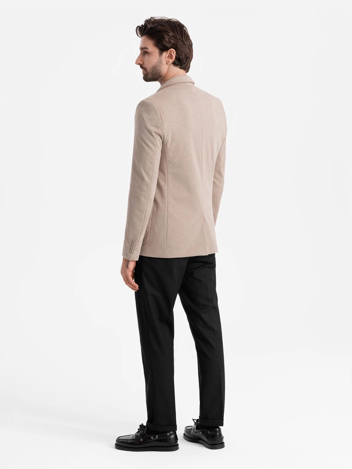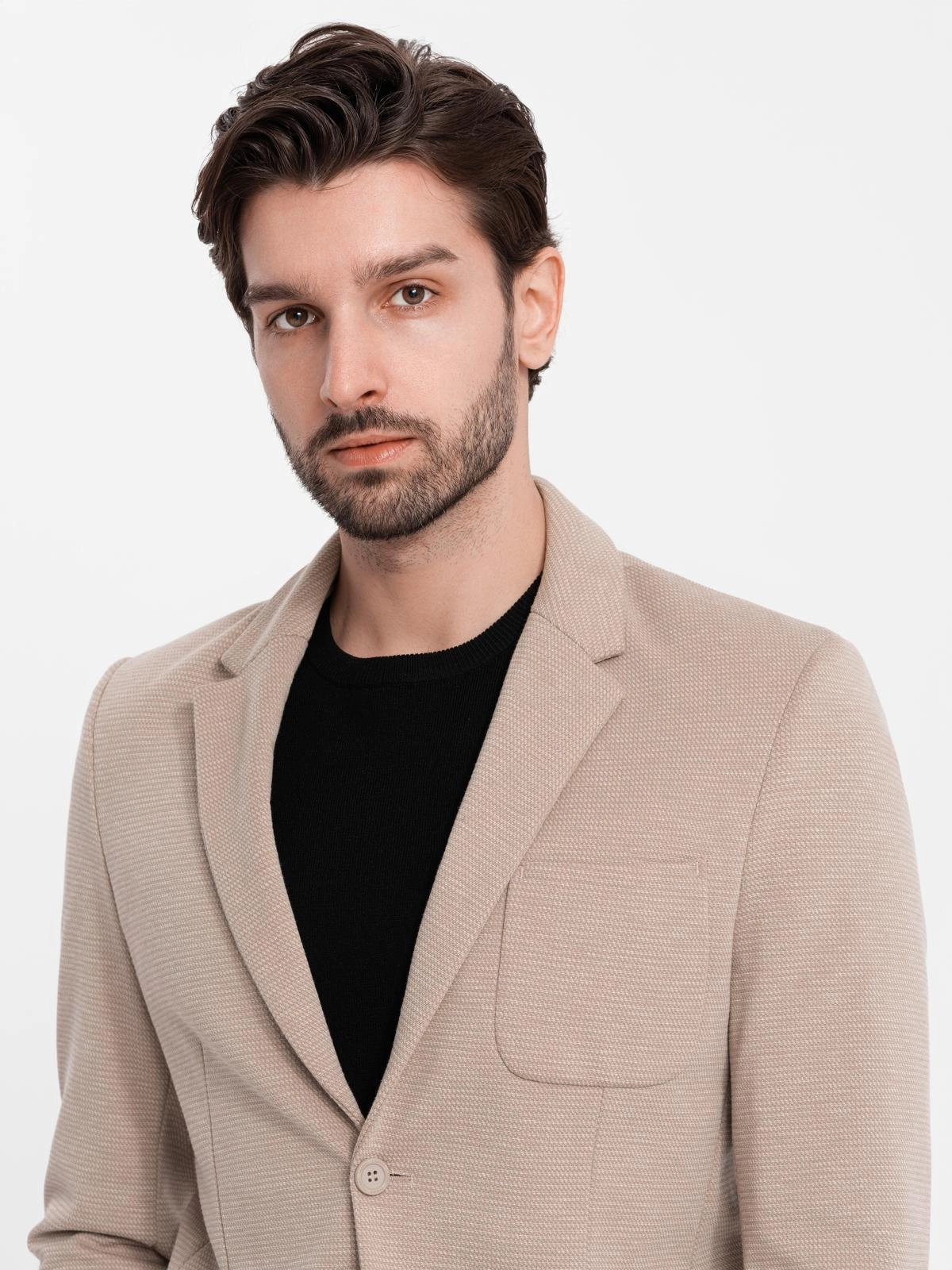 A jacket made of structured melange knit will visually enhance any elegant styling. This model from the Ombre Quintessence collection is made for men who like an offbeat approach to classics. It will effectively balance the composition, adding some nonchalance to sets in a semi-formal tone. The attractive look of the jacket is built by eye-catching details in the form of patch pockets and engraved buttons.