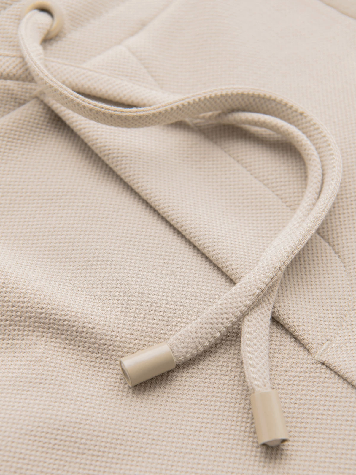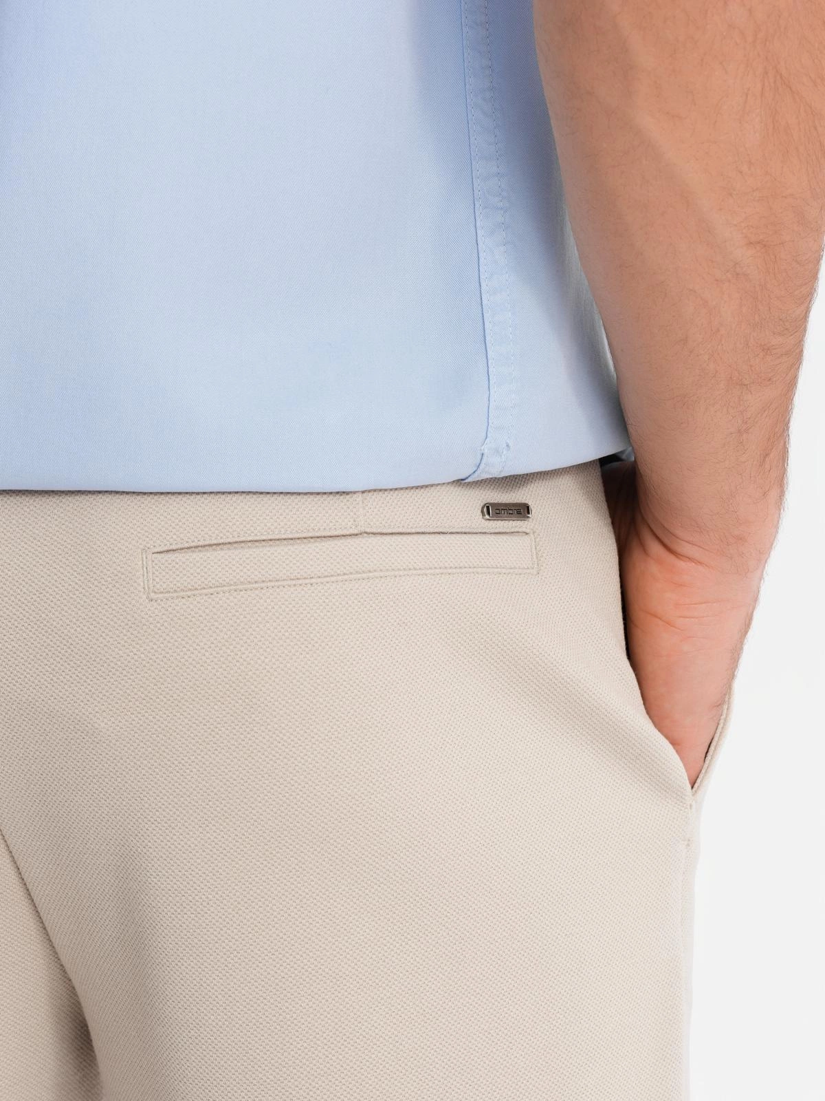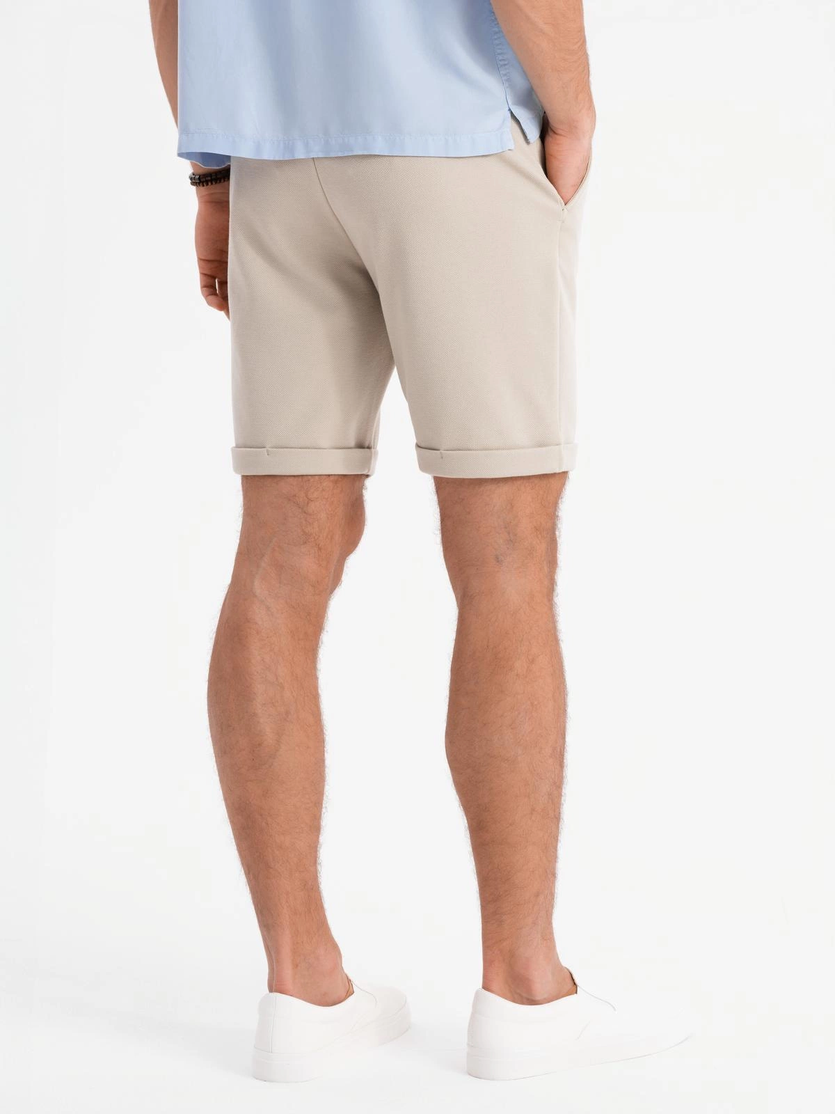 Men's pre-knee-length shorts from the Ombre Quintessence collection will fit perfectly with casual outfits. Uniform color and classic cut are highlighted by delicate details, giving the shorts a unique character. The mixed-fiber knit is responsible for the tactile texture of the material. The turned-up leg trim and pleats resembling back pockets and opening add to the style. The whole is completed with a decorative drawstring at the waist and subtle branding.