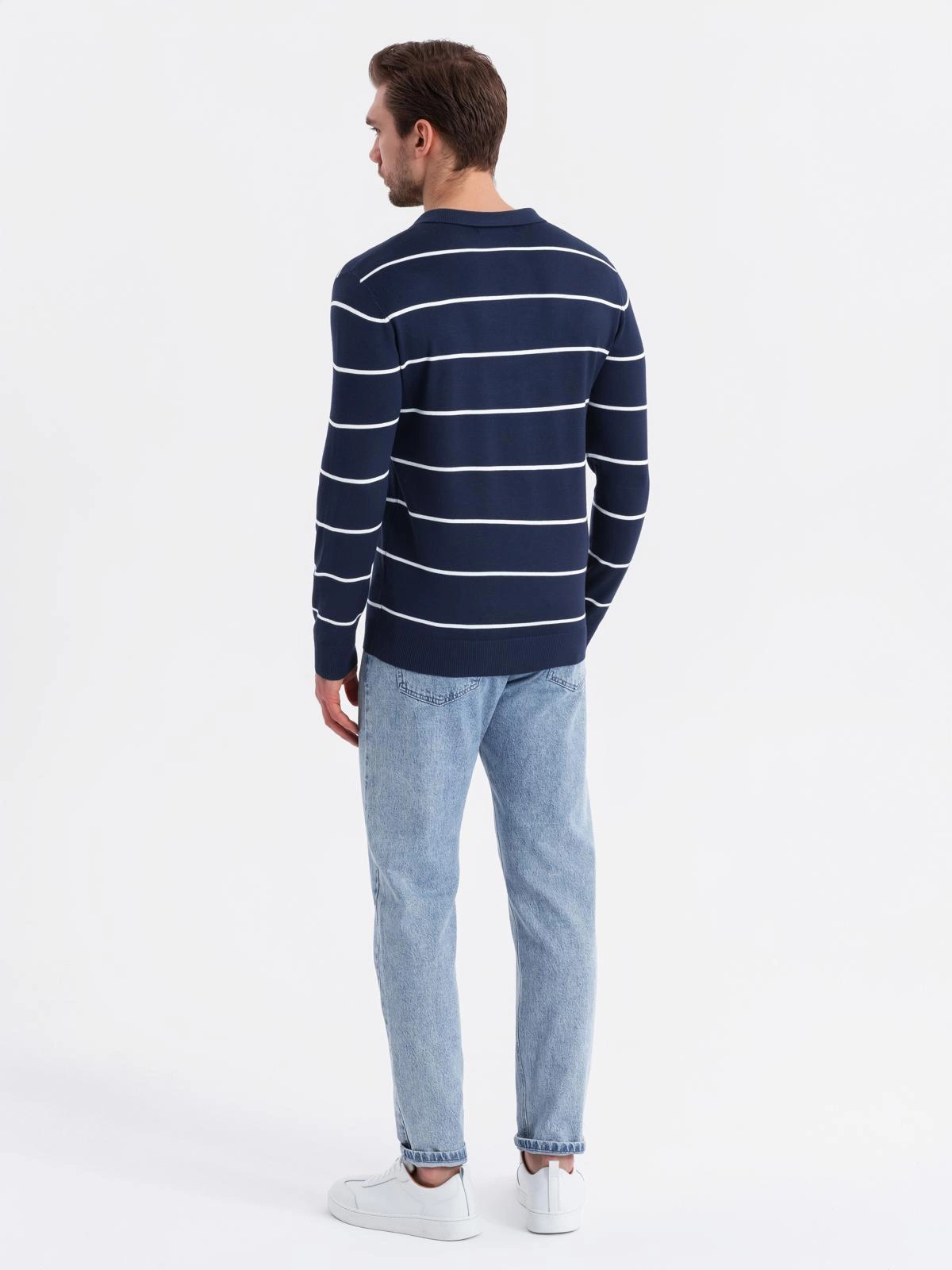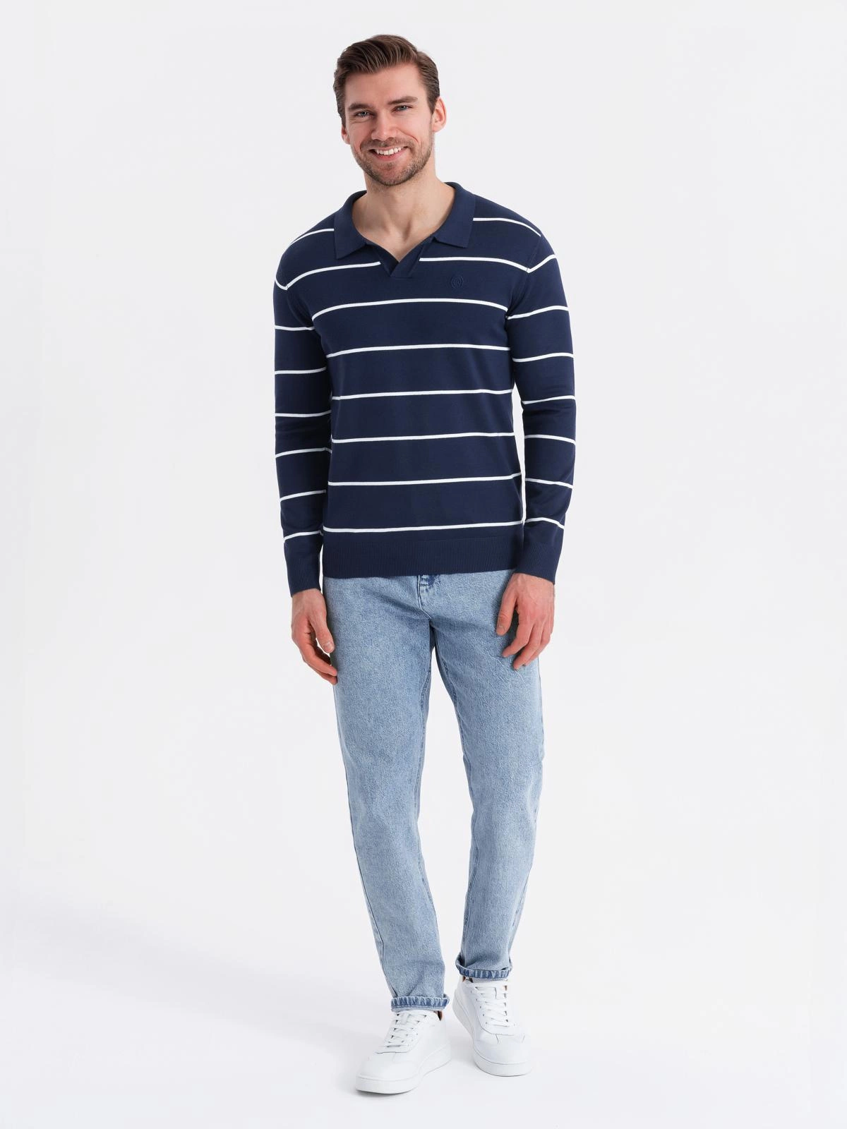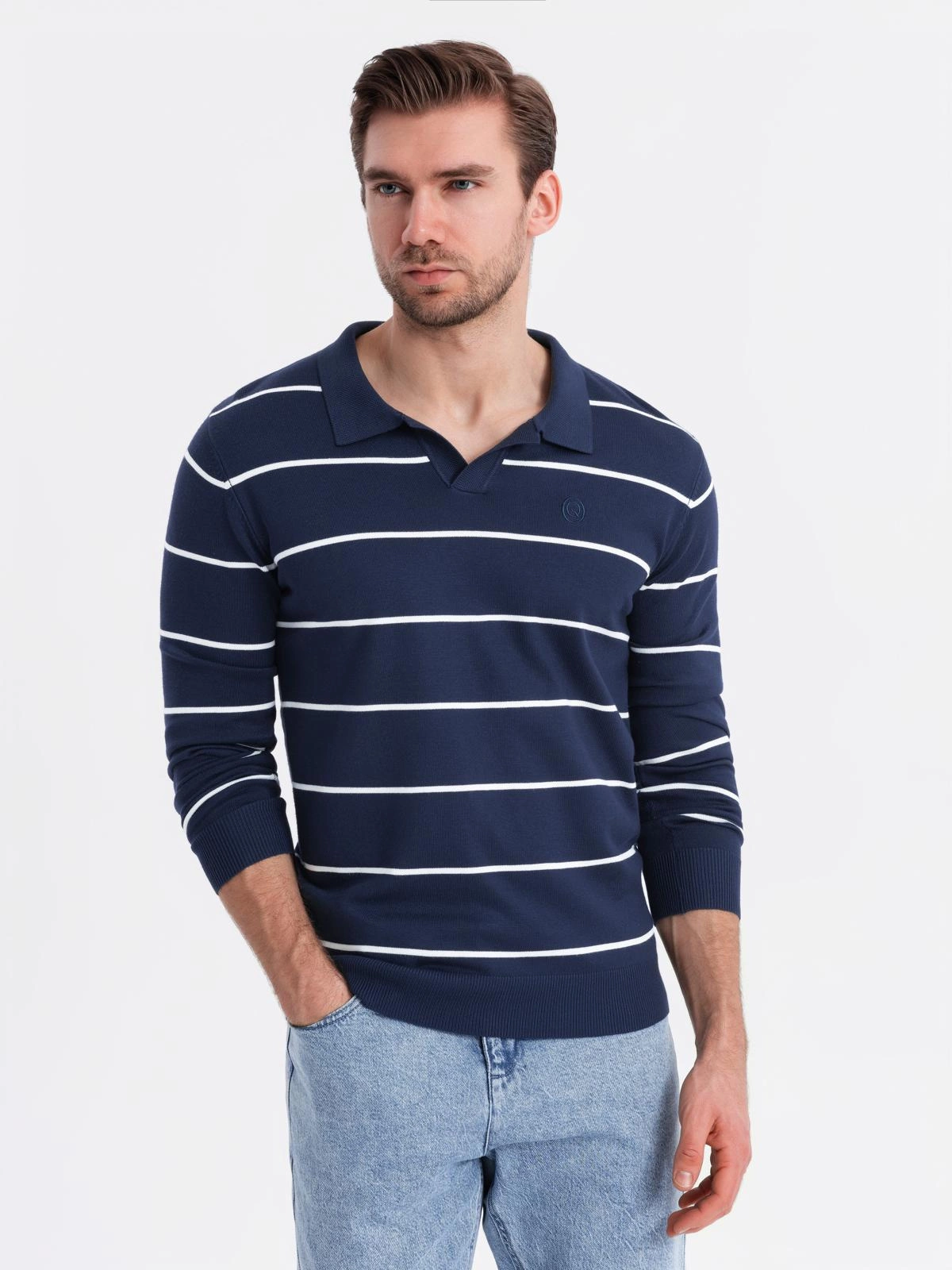 Striped longsleeve with polo collar is a good way to break the fashion routine in styling in smart casual aesthetics. Contrasting stripes will match sets with chinos or a blazer, giving the whole look a casual chic look. The fine viscose knit adds elegance and refinement to the shirt, while the embroidery on the chest emphasizes the stylish character of the longsleeve. This makes it an ideal choice for work or family gatherings.