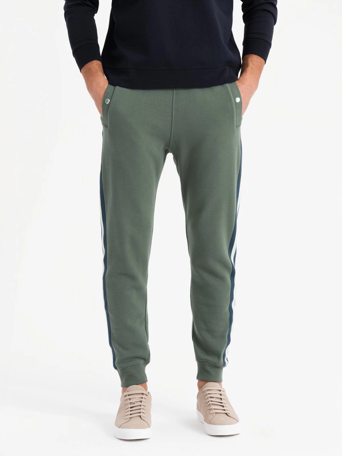 Sweatpants with stripes will appeal to men who like to play with fashion. Their intriguing design will not leave anyone indifferent - wide stripes and a stylish patch bring to mind retro aesthetics. Colorful elements combined with shiny details give the joggers a unique character. Elastic drawstrings on the waist and legs, as well as fastened pockets with press studs are responsible for the comfort of wearing.