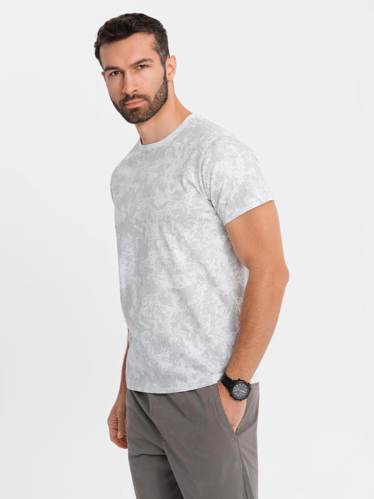 This T-shirt model is a modern take on the classic T-shirt, in which the main role is played by a dynamic print that covers the entire surface of the material. With its regular cut and round neckline, it fits perfectly into everyday styling. The soft cotton knit fabric ensures full wearing comfort, while delicate details - such as a small label with branding - emphasize the refined style. This is a proposition for men who like simplicity, but with a touch of distinctiveness.