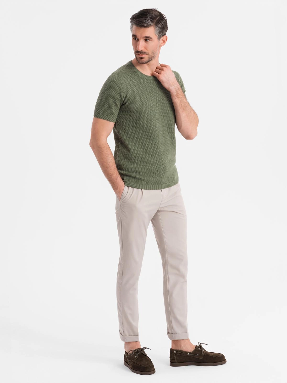 T-shirt with a subtly sweater-like texture is an excellent choice for men who appreciate elegant casualness. The lightweight knit fabric with a fine weave provides comfort in both everyday and more outgoing styling. The metal detail on the sleeve emphasizes the modern character of the model, while the elastic trims give a structured look.