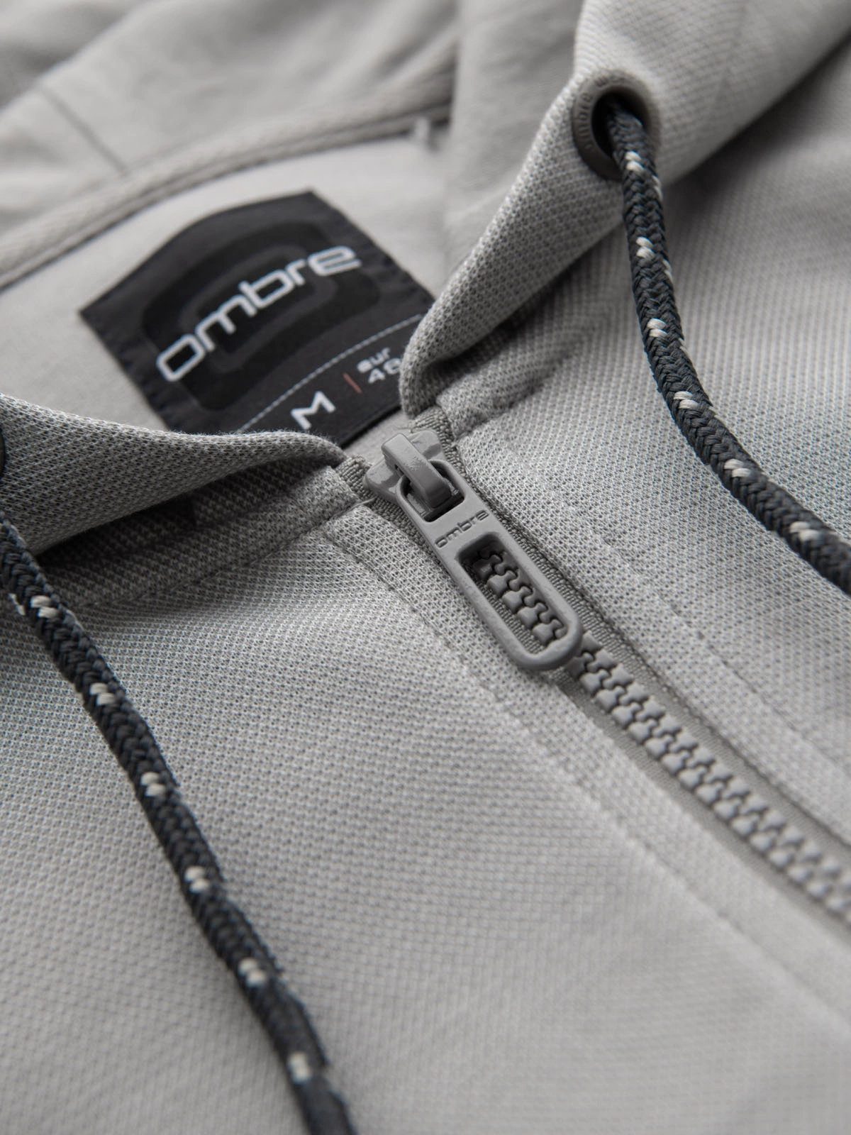 The regular-fit zippered sweatshirt, made of two-tone pique knit, provides comfort and a fashionable everyday look. An adjustable hood and an unusually shaped pocket add a sporty touch. The sweatshirt is enriched with subtle details, such as logoed eyelets and drawstring ends. Contrasting welts add to its character and style.