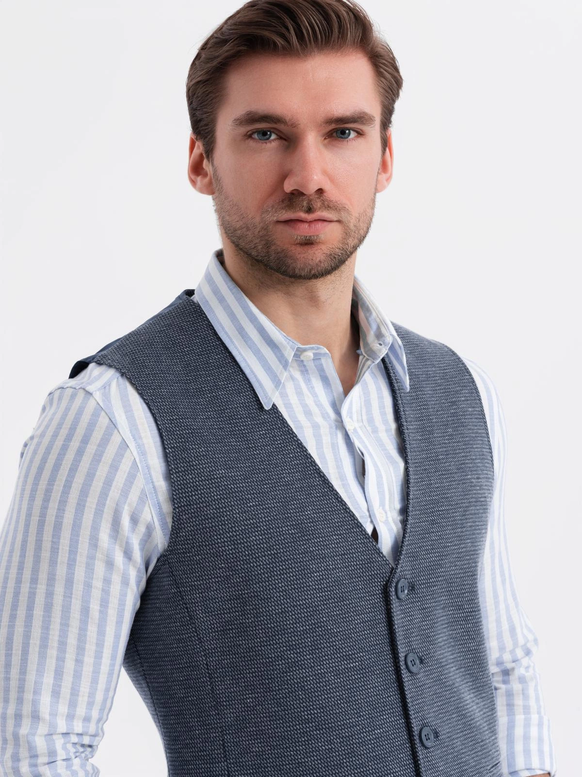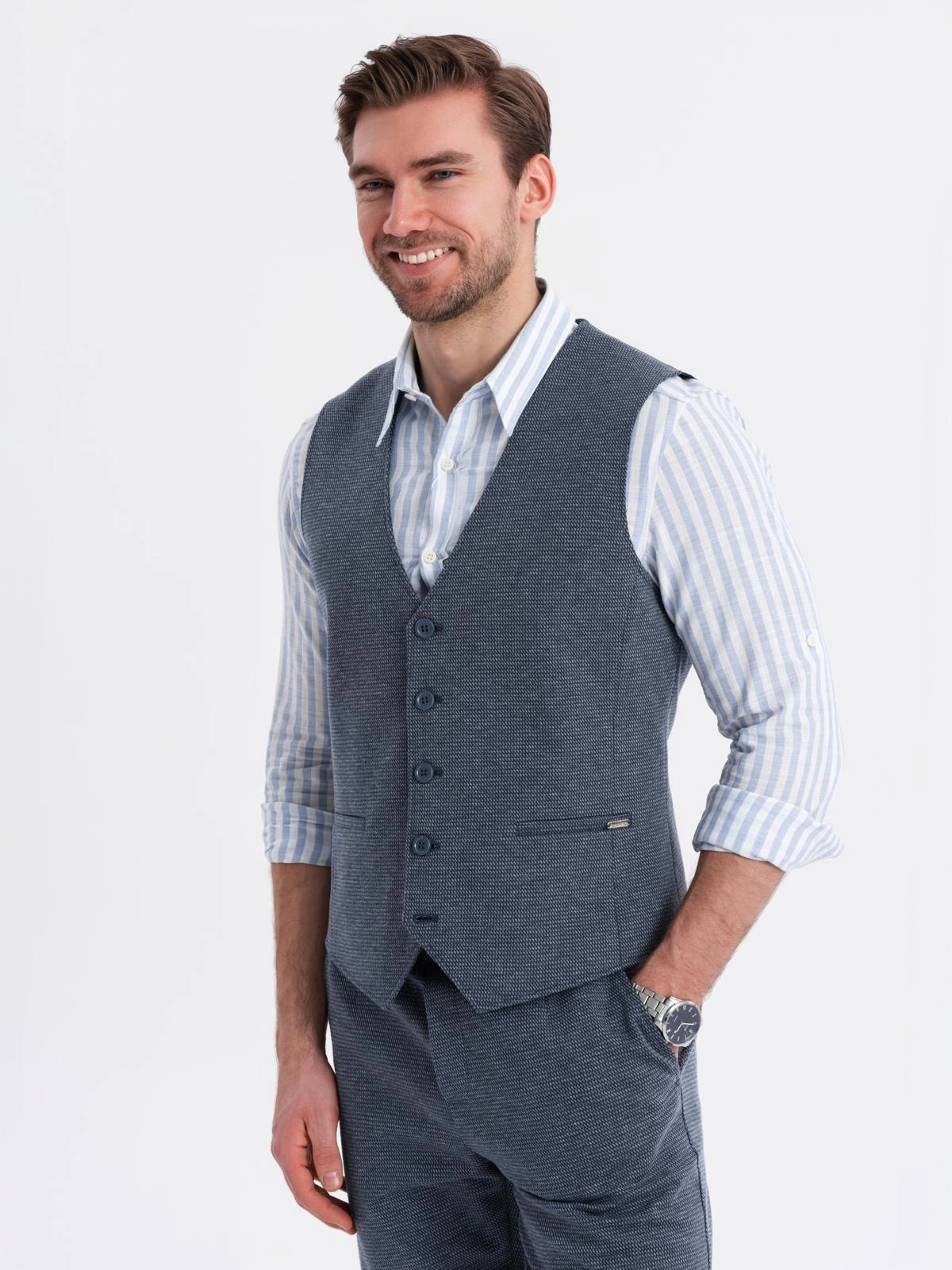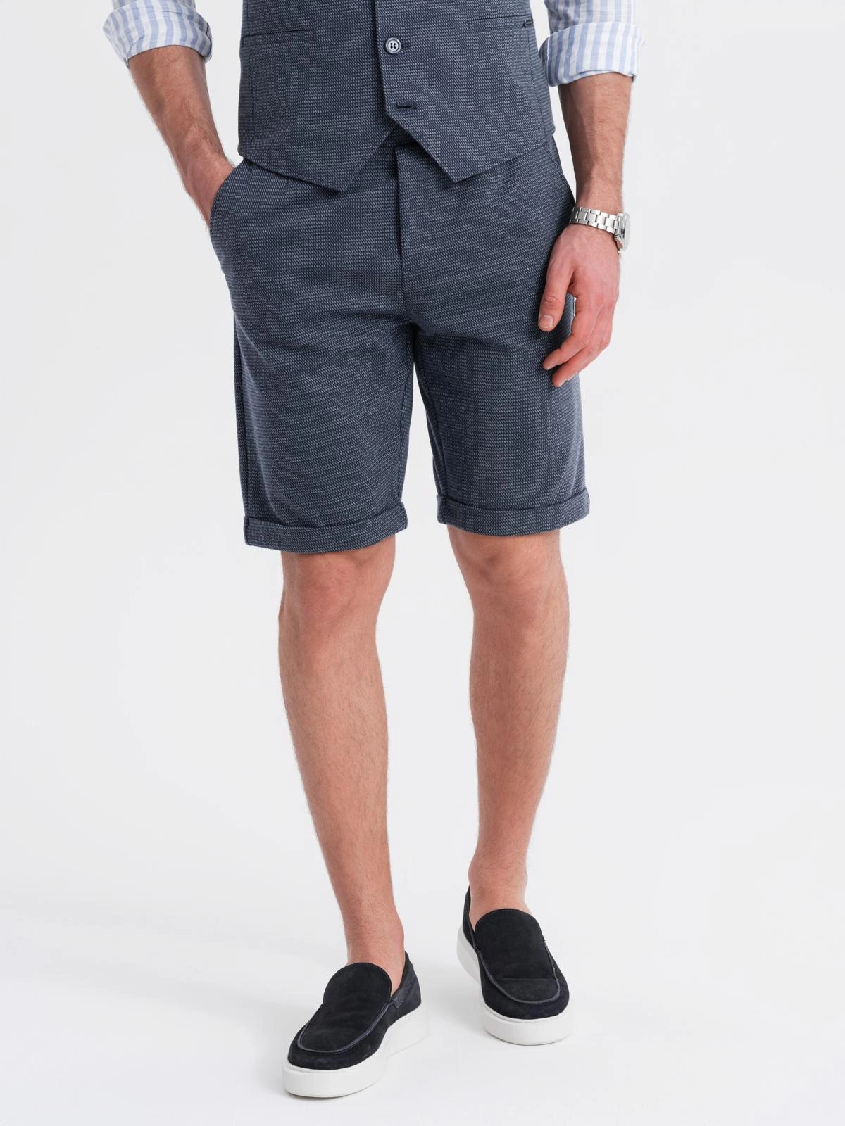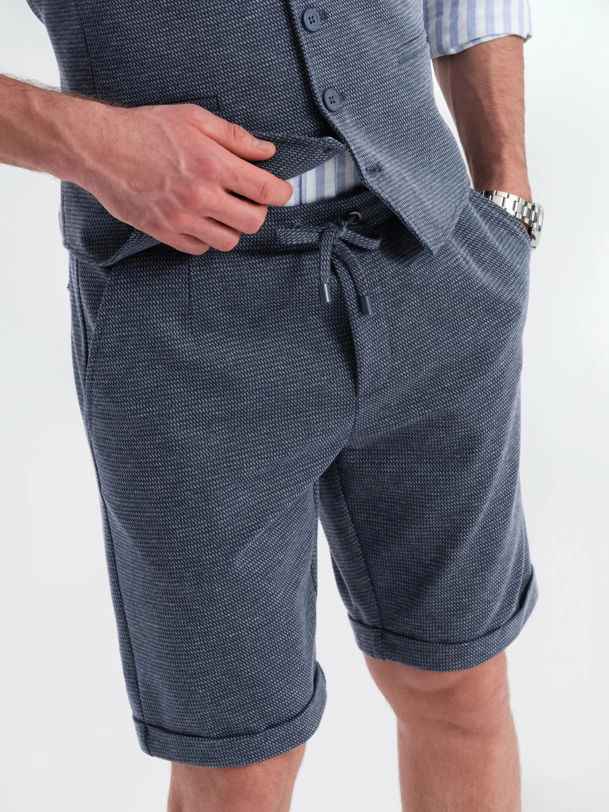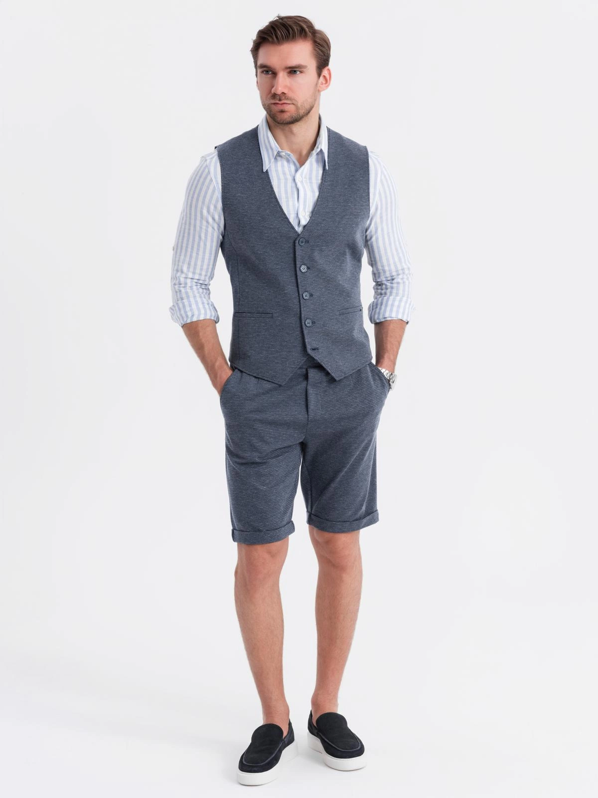 Elegance and casualness in a modern edition - this set from the QUINTESSENCE collection is a proposal for men who appreciate class without giving up comfort. A tailored vest and classic shorts create a cohesive, stylish whole. The characteristic structure of the knitwear and subtle details make the set perfect for both everyday wear and informal summer occasions.