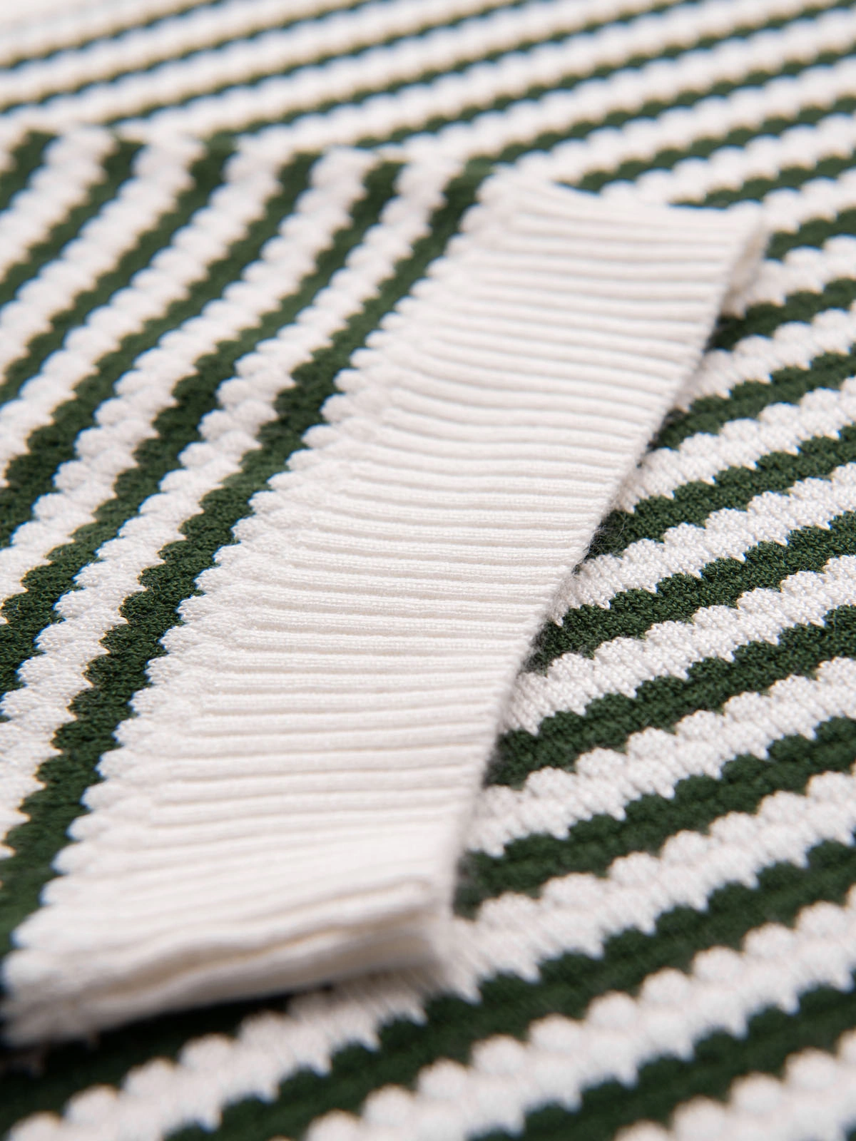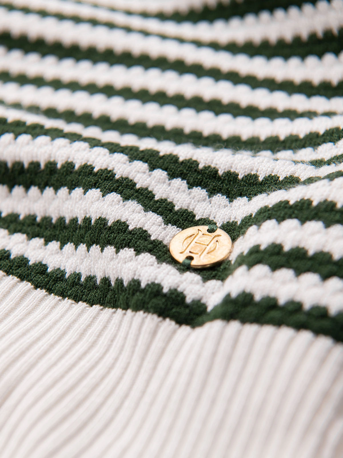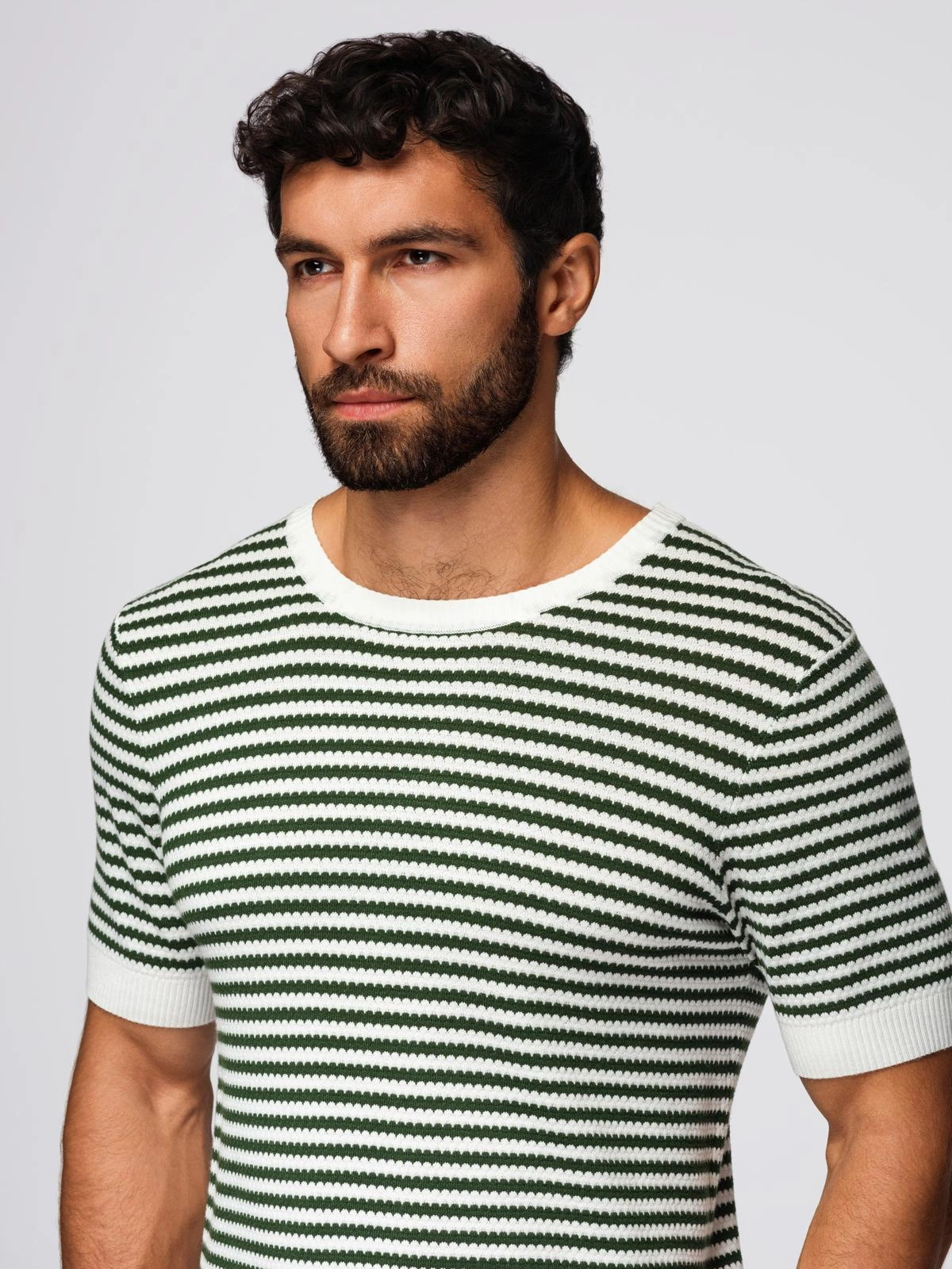 A knitted t-shirt that defines a summer style classic. The distinctive knit weave and contrasting stripes in a navy spirit give it a fresh and unique look. The fitted slim cut provides freedom of movement and a stylish silhouette. It's an ideal choice for men for sunny days - both for urban styling and seaside strolls.