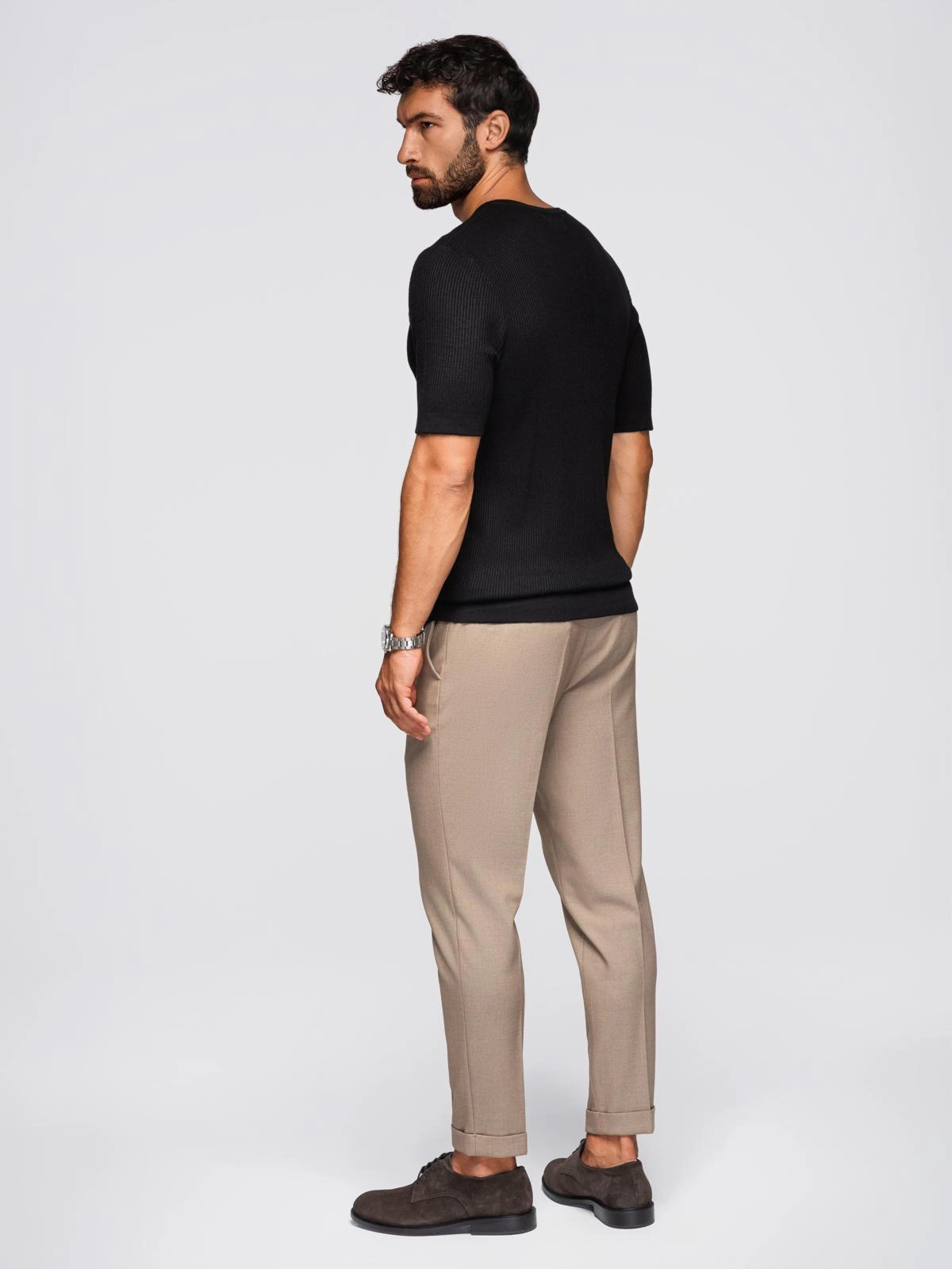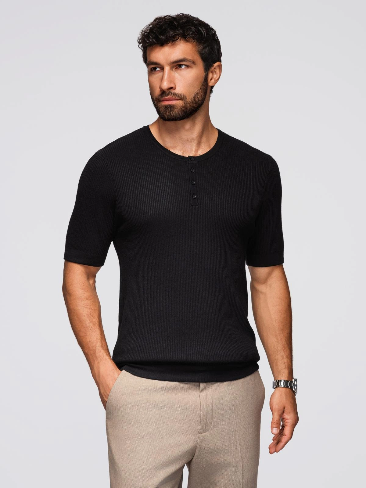 Subtle yet distinctive - this knit t-shirt is the perfect combination of minimalist form and refined detail. The distinctive texture of the fabric creates striking stripes that add depth and texture. The model is buttoned at the neckline, perfect for warmer days in smart casual style. Finished with fine branding - it remains elegant and modern at the same time.