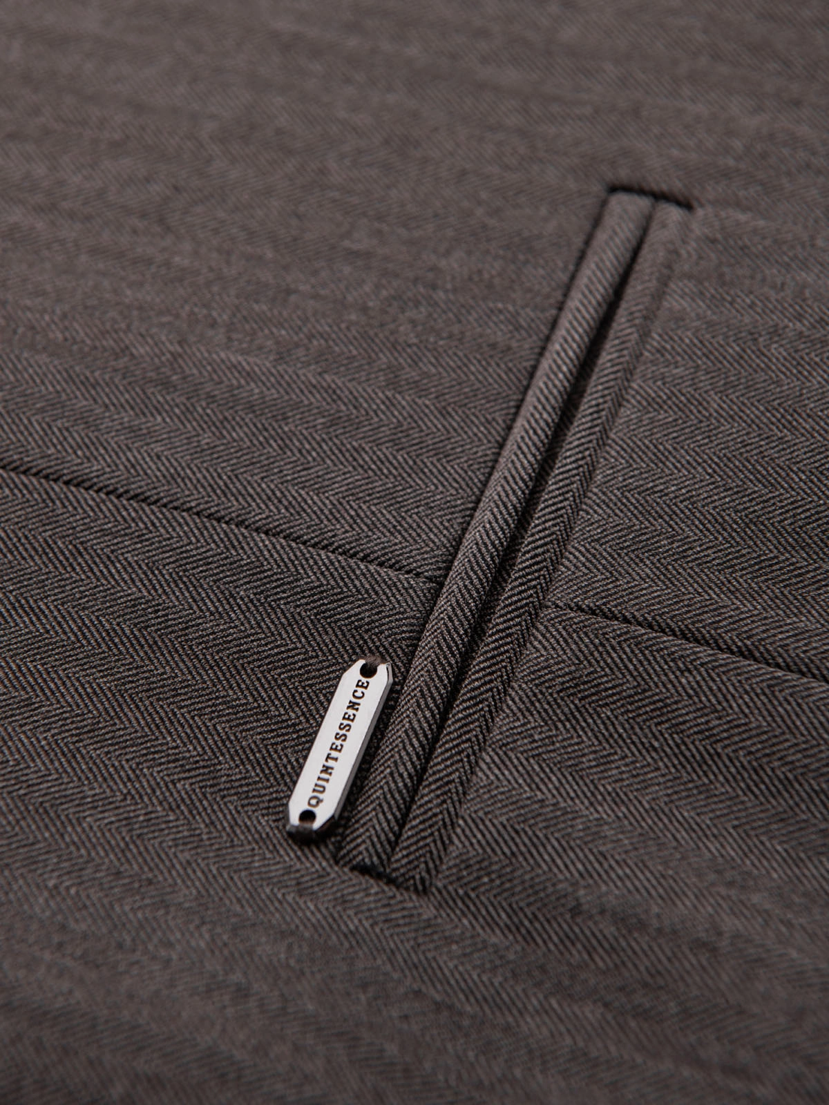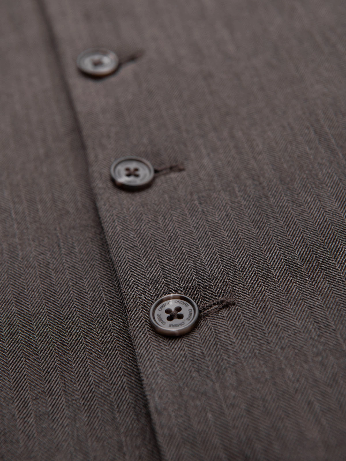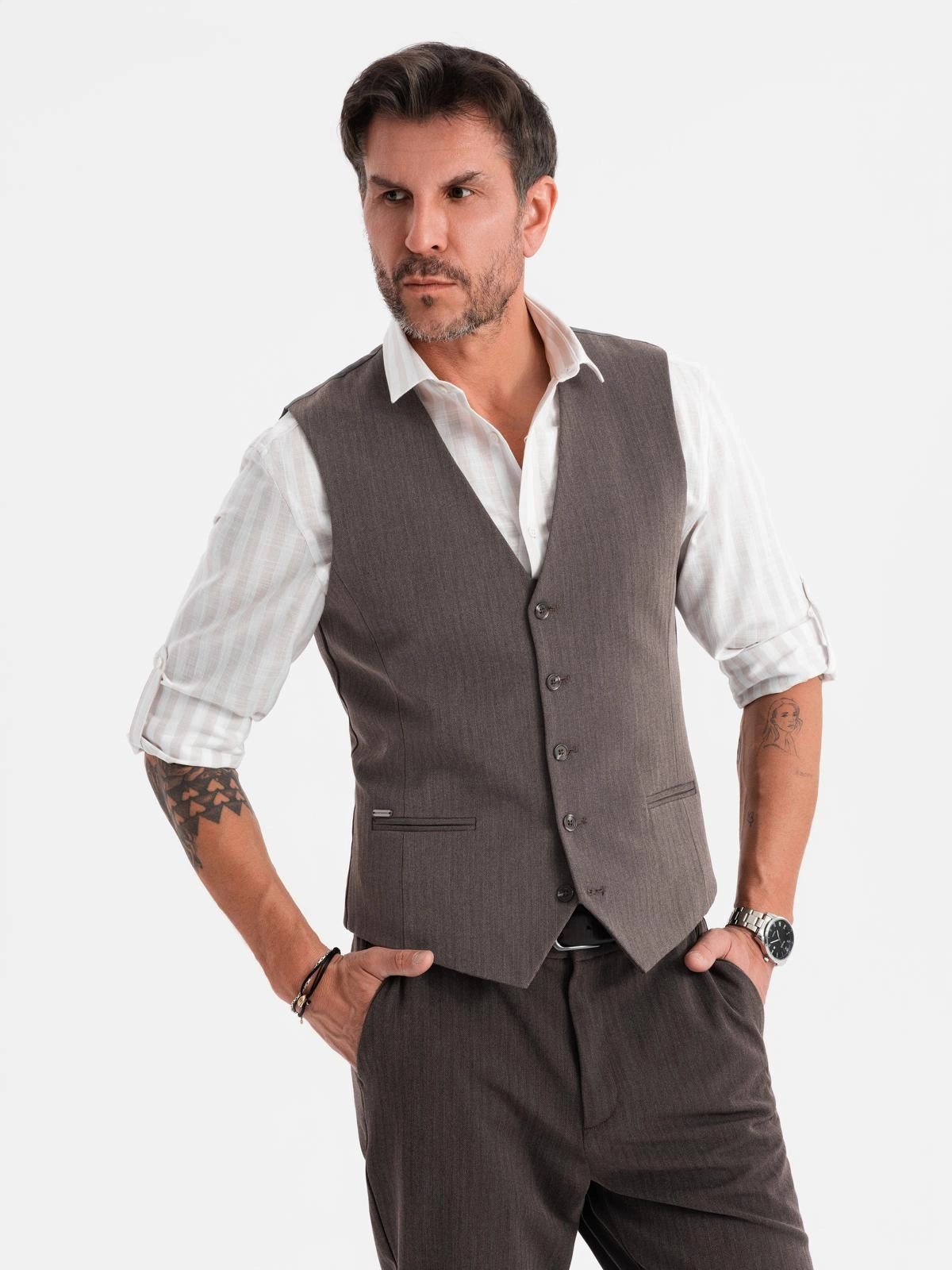 A stylish men's vest with a tailored fit, made of fabric in a classic herringbone pattern, is the perfect complement to smart casual styling. With a modern slim fit cut, it accentuates the silhouette and provides an elegant yet casual look. Subtle branding and thoughtful details make it a versatile choice for both the office and social gatherings. Pairs well with both a shirt and turtleneck. A versatile base for smart casual and more formal outfits. - Create a complete look with it!