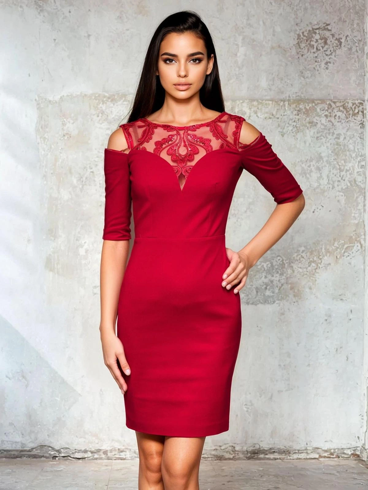This striking women's mini dress is a proposal that impresses with its elegance and feminine character. The decorative round neckline with lace inserts subtly emphasizes the shoulder line, giving the whole dress a unique chic look. The dress is made of pleasant to the touch fabric, so it guarantees comfort and a perfect fit to the figure. It will be perfect for a wedding, a date or an evening out, when you want to look elegant and sensual. It is a classic cut, which you can easily match with delicate stilettos and elegant jewelry.