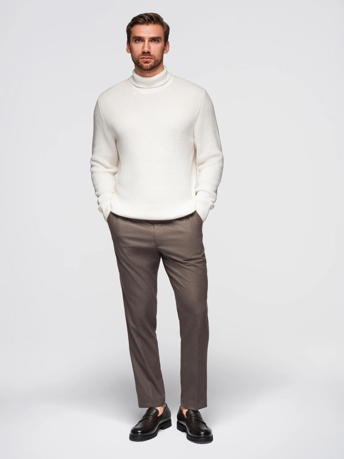 The timeless classic men's turtleneck sweater from the Ombre Quintessence line is a must-have for the autumn-winter season. It was made of high-quality 100% cotton with a thicker ribbed weave, which ensures both thermal comfort and an elegant look. The regular cut fits the silhouette perfectly, while the ribbed cuffs and hem add functionality and class. A subtle metal pin with branding at the bottom edge emphasizes the unique character of the product. The turtleneck will be perfect for styling for the office, as well as for less formal occasions.
