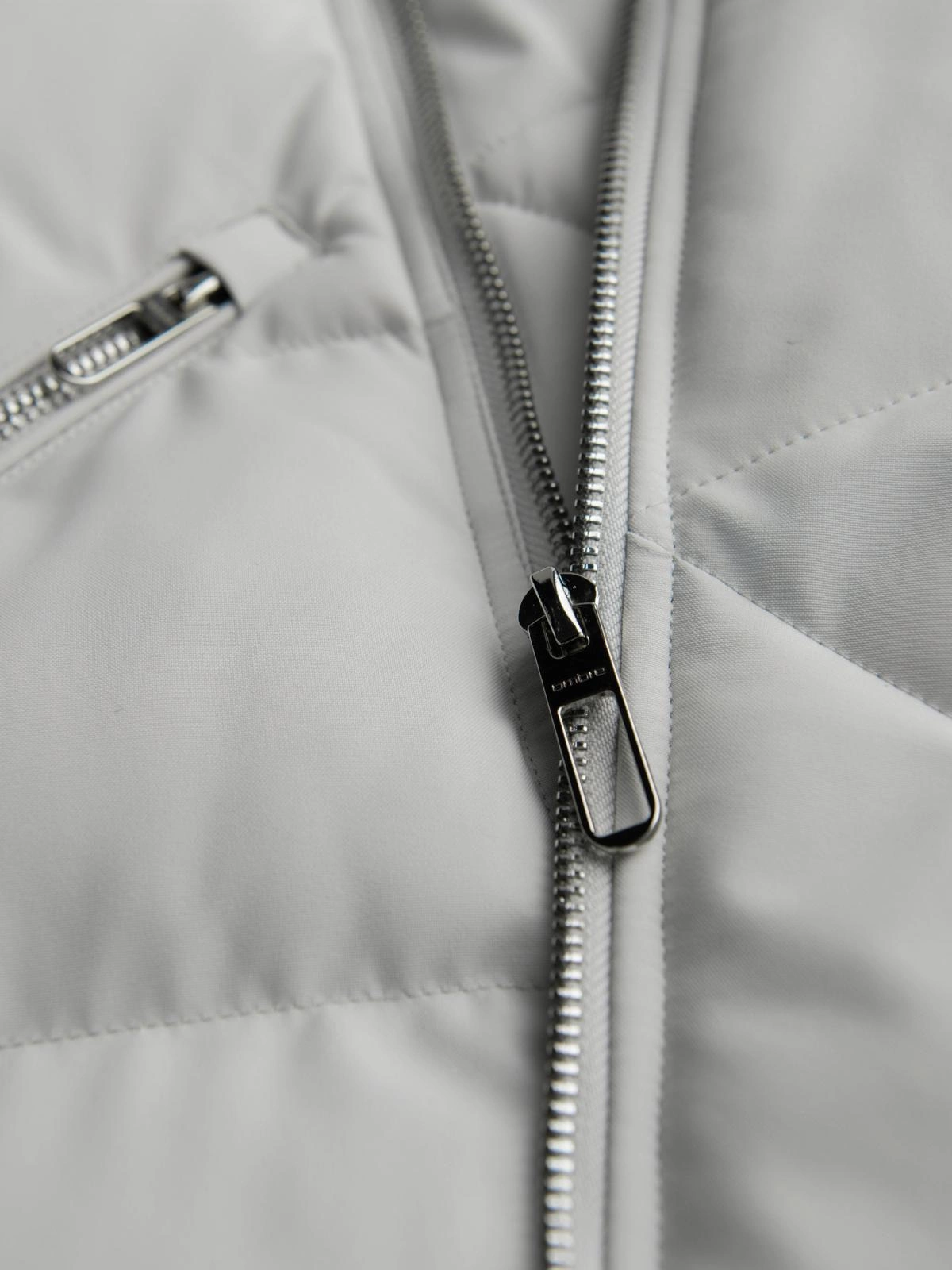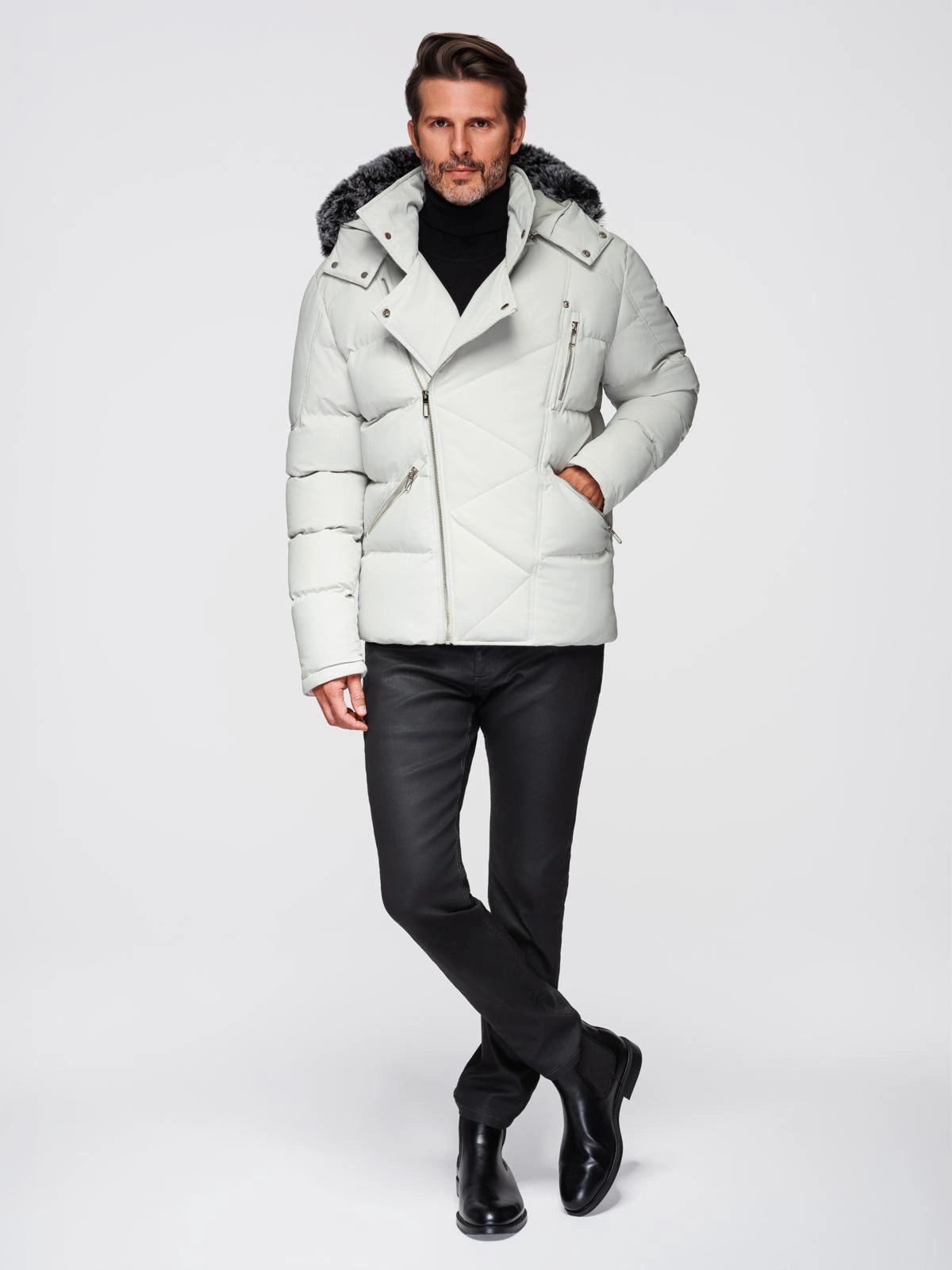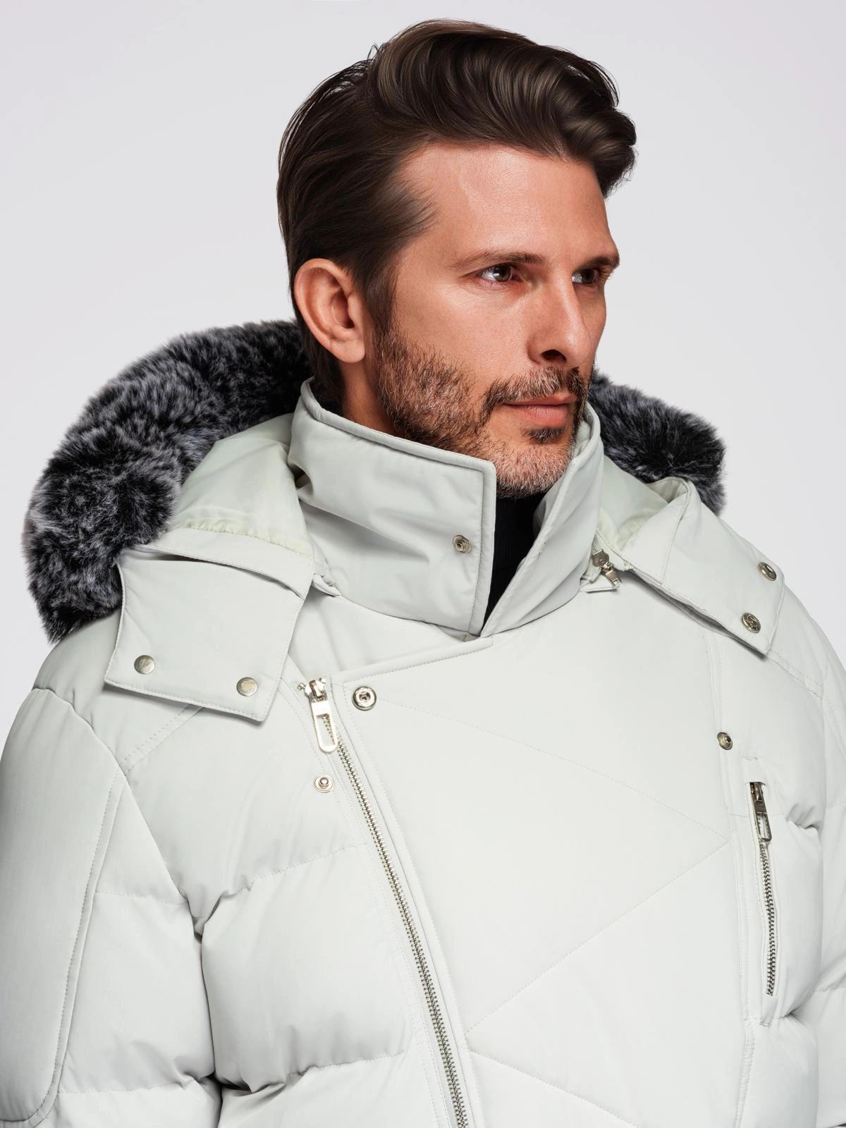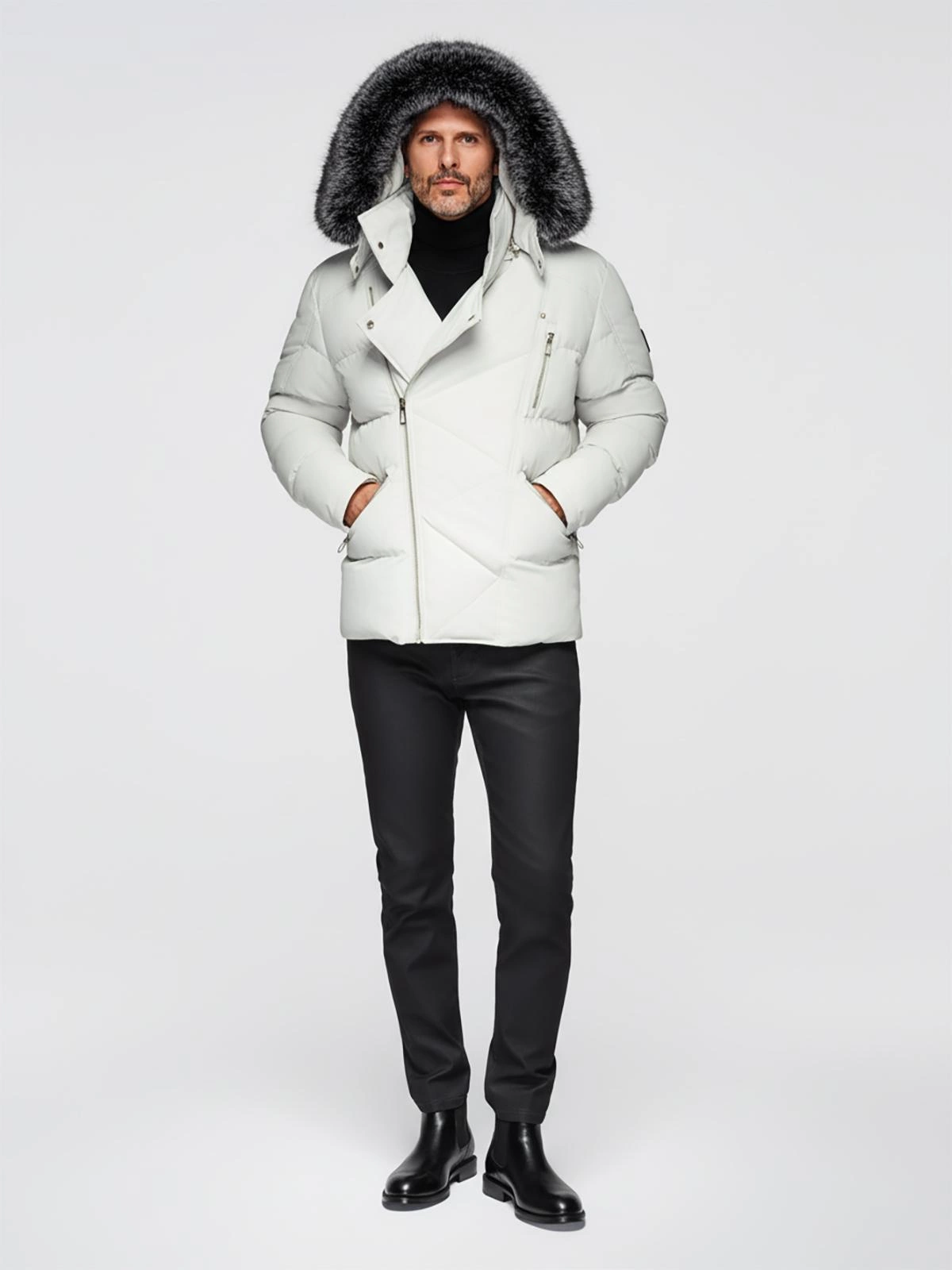 Stylish and distinctive - this jacket from the LEVEL UP collection was designed for modern men who appreciate original combinations of functionality and fashion flair. Quilted puffer construction, expressive silver details and asymmetrical closure inspired by the classic ramonese create a unique winter look. The model attracts attention thanks to the hood with fur and distinctive stitching on the lapel.