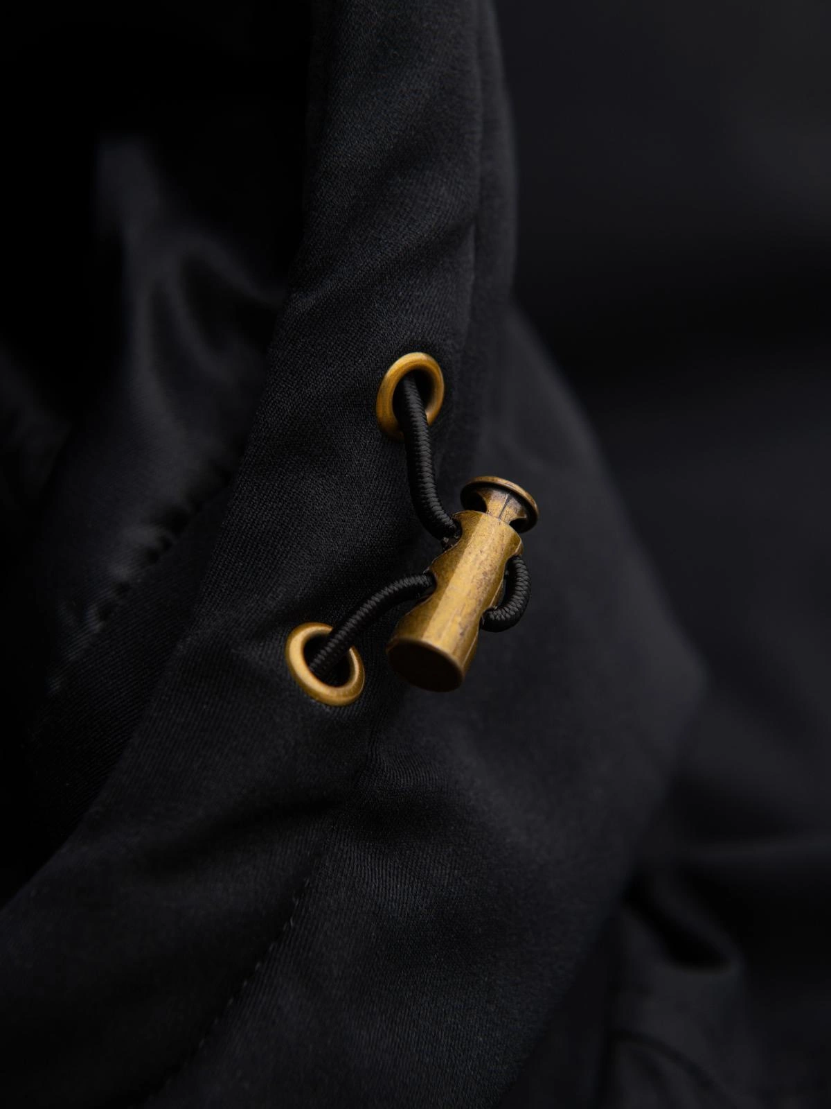 - subtle branding in gold color: zipper, pin and elements on the hood