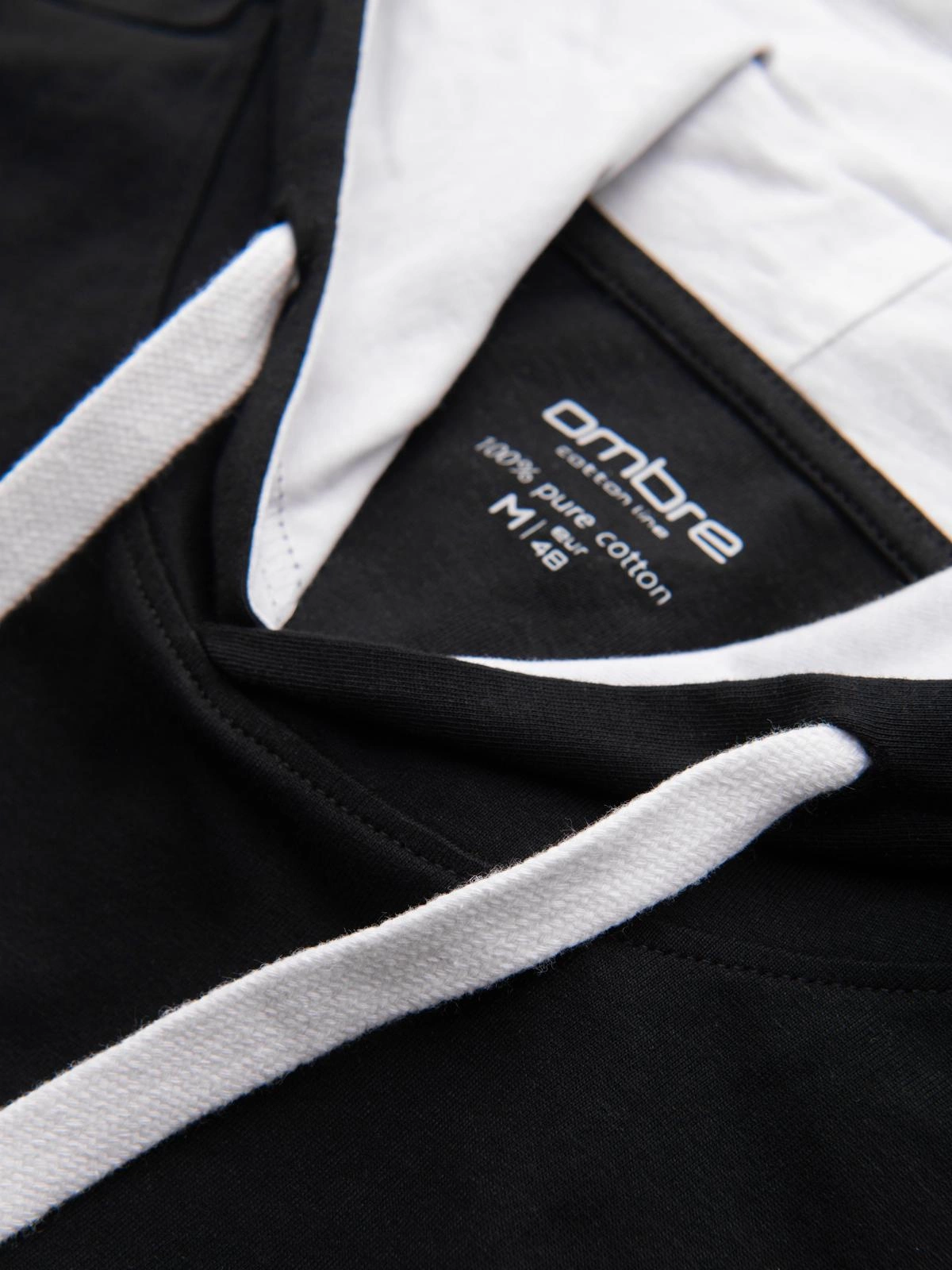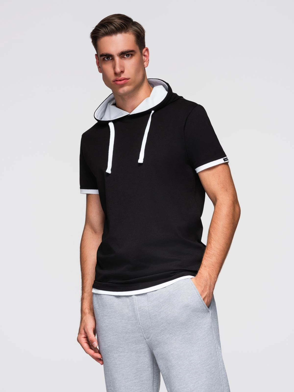This stylish hooded T-shirt will bring a breath of fresh air to a man's closet. The T-shirt was sewn from cotton jersey, as it was designed to maximize wearing comfort. The original look of the T-shirt is highlighted by intriguing double trims in contrasting colors and a comfortable hood with a flat drawstring. The practical combination of a hoodie and a classic t-shirt is sure to appeal to lovers of unobvious everyday solutions.