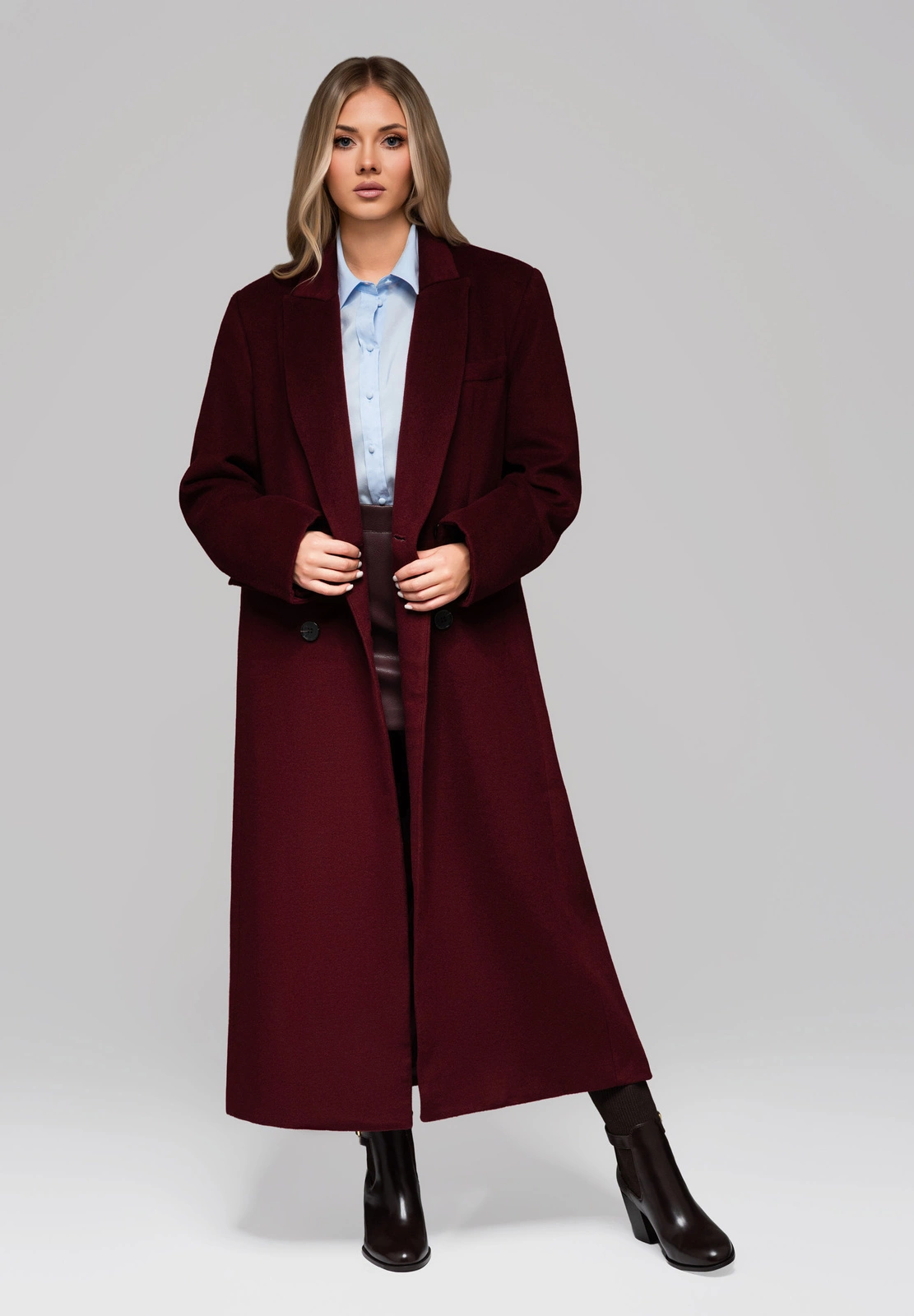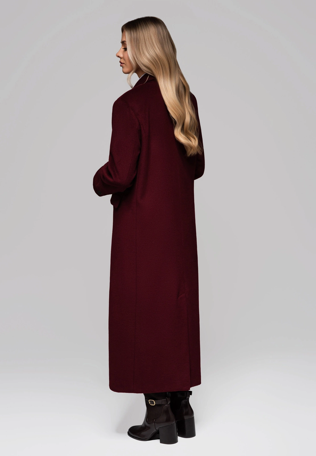 - coat fastened with logo buttons, hidden under the trim