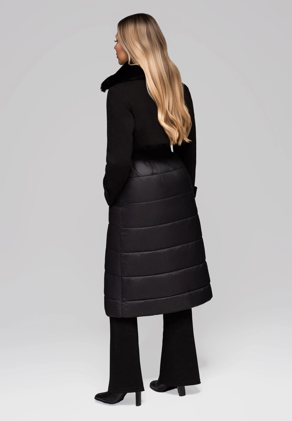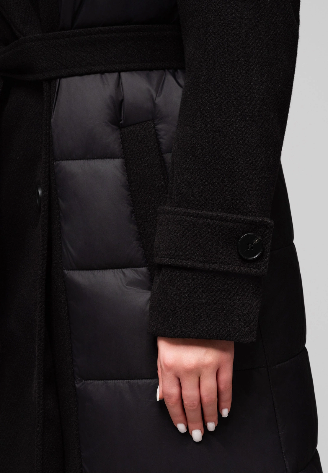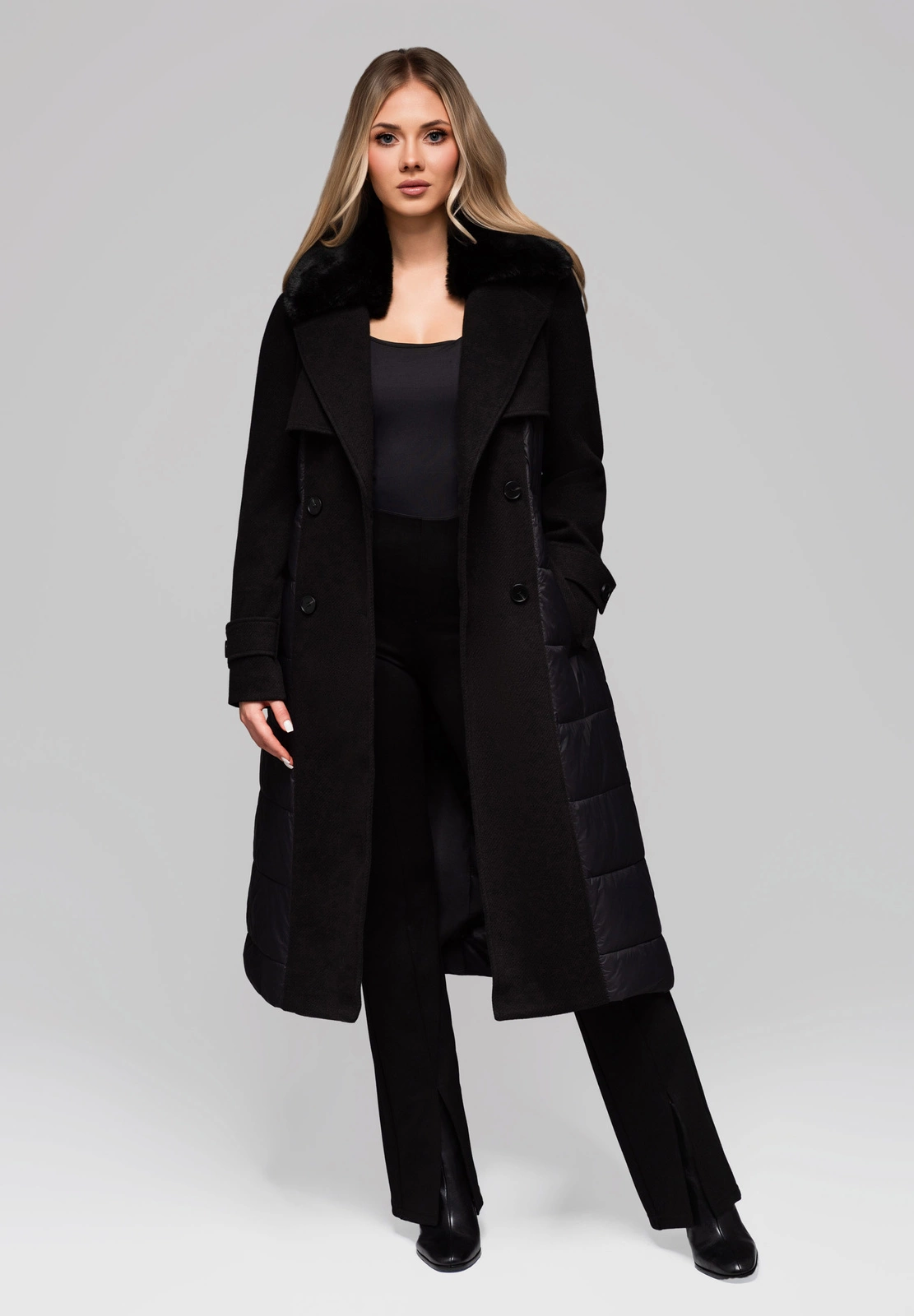 A unique, waisted coat that combines elegance with the functionality of an insulated jacket. The cut has a classic collar enriched with detachable fur. The outer material is a combination of two different fabrics: elegant twill fabric and smooth quilted polyester. The whole, including the lining, is made of 100% polyester and has a small amount of artificial filling. The coat fastens with buttons, and there is a tie belt at the waist to accentuate the silhouette. Details include buttoned patches at the sleeves and two practical pockets.
