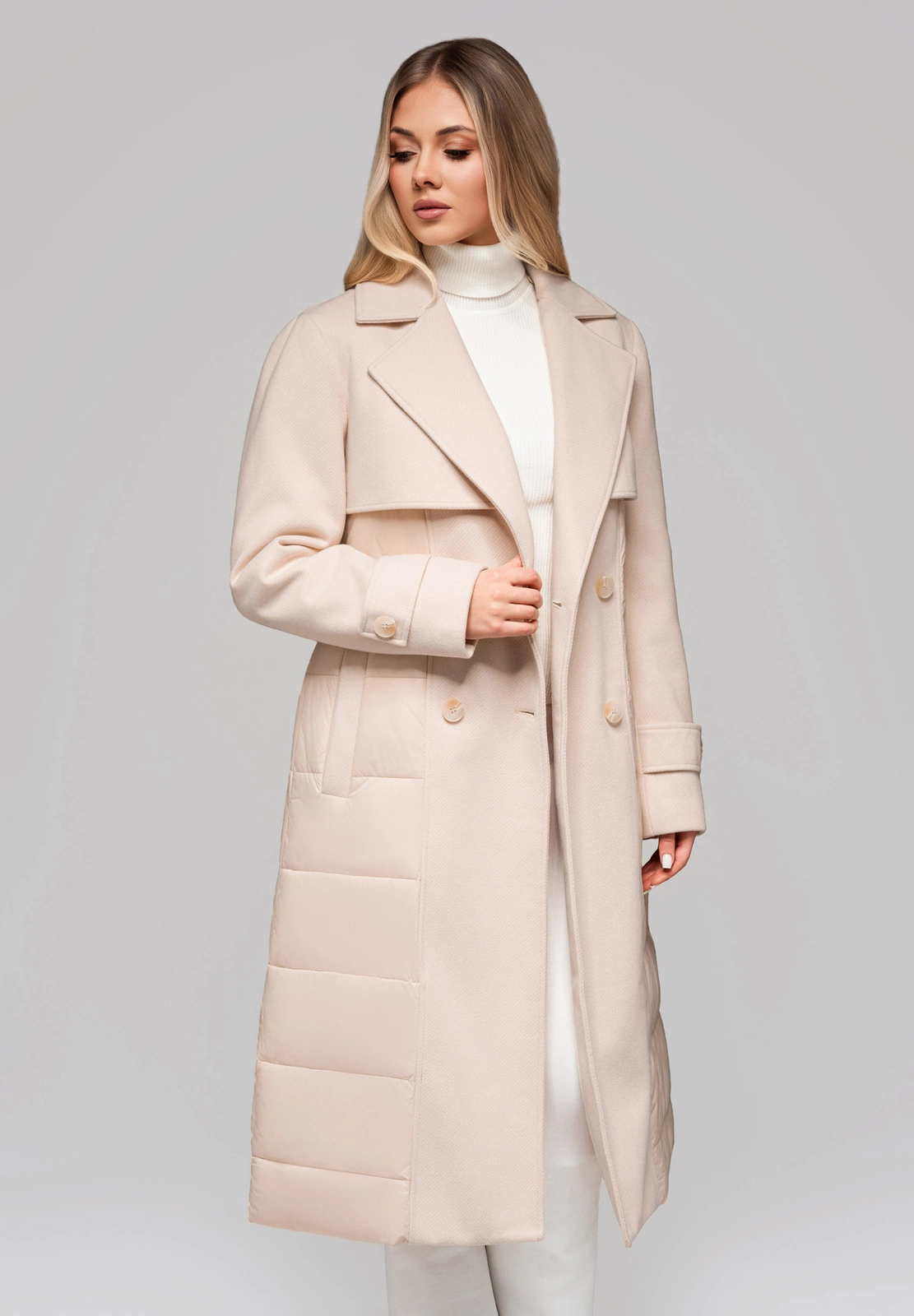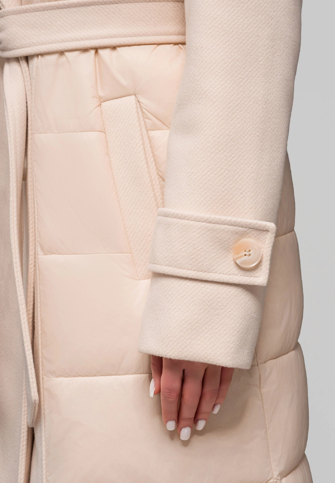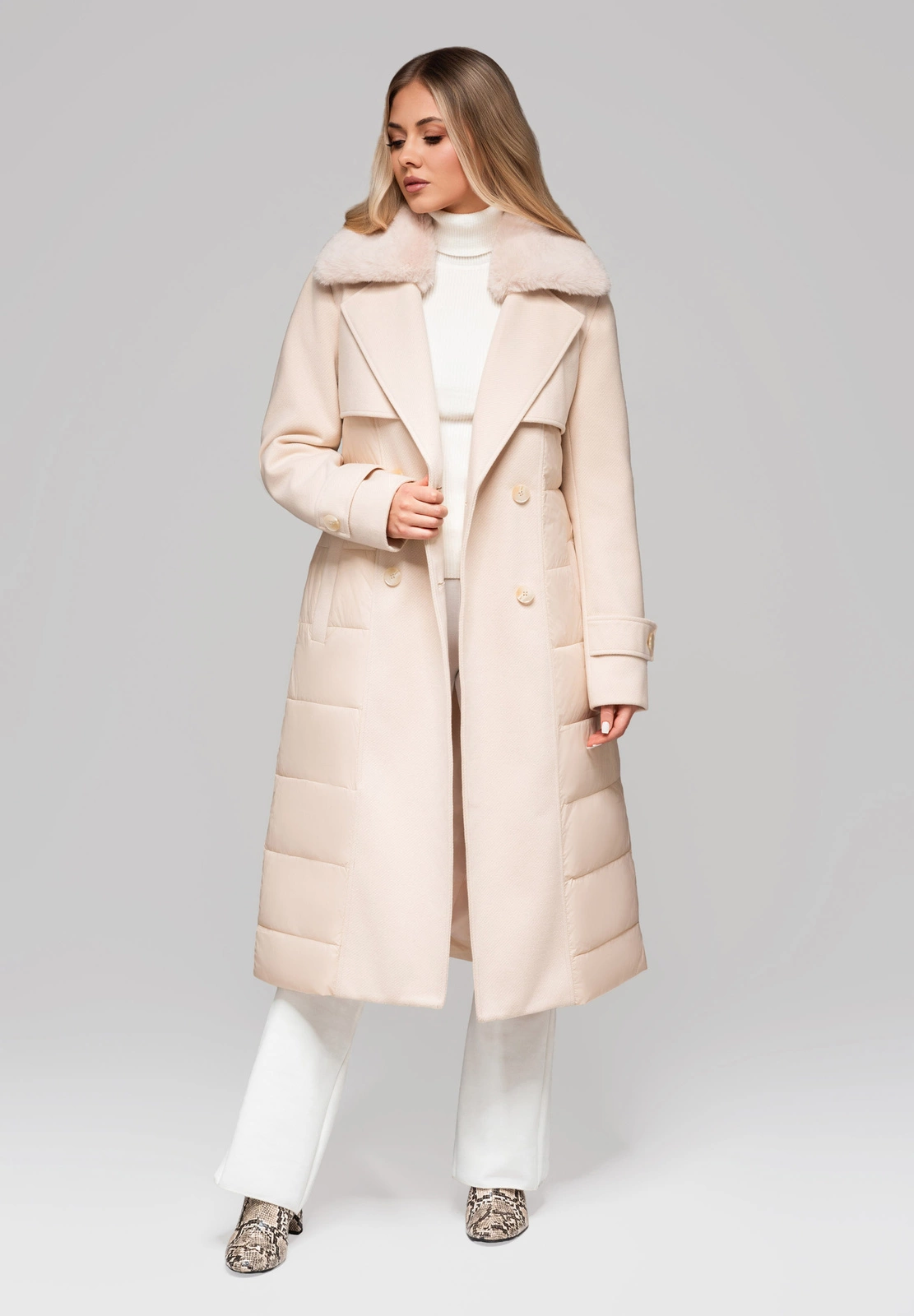 A unique, waisted coat that combines elegance with the functionality of an insulated jacket. The cut has a classic collar enriched with detachable fur. The outer material is a combination of two different fabrics: elegant twill fabric and smooth quilted polyester. The whole, including the lining, is made of 100% polyester and has a small amount of artificial filling. The coat fastens with buttons, and there is a tie belt at the waist to accentuate the silhouette. Details include buttoned patches at the sleeves and two practical pockets.