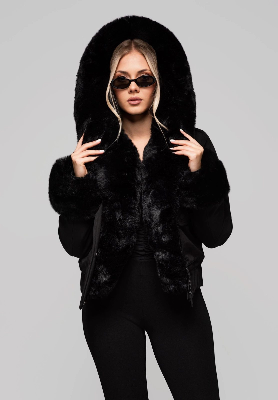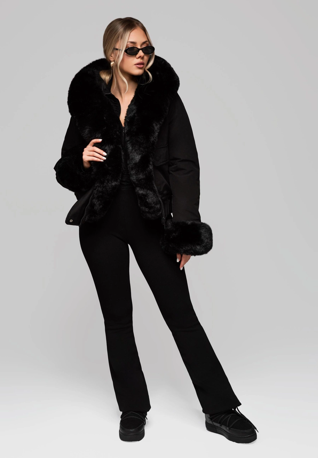 A functional short jacket with a classic cut, finished with a ribbed hem for a better fit and wind protection. The jacket has a large amount of artificial filling, which guarantees a high level of warmth. It is made of smooth, matte polyester fabric. The model is equipped with a deep hood and numerous practical details: detachable fur is located at the hood, along the closure trim and at the cuffs of the sleeves. The closure is a sturdy ankle zipper, additionally covered by a trim. Functionality is enhanced by two spacious patch pockets with snap fasteners, and the whole is complemented by decorative shoulder epaulettes, also fastened with snaps.