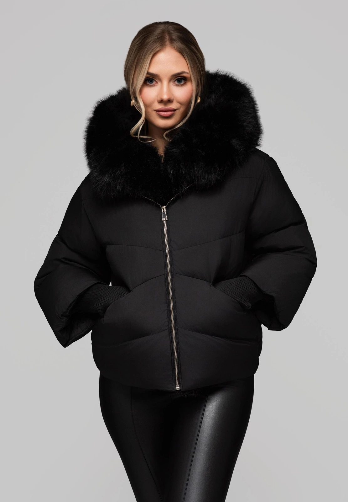 Functional short jacket with a classic cut, with a spacious hood. It is characterized by a large amount of artificial filling, providing high thermal comfort. The model has a unique 3/4-length sleeve, finished with a high hem, which is both a decorative and practical element. The outer and inner material is 100% polyester, with a smooth, matte finish. The jacket fastens with a sturdy metal zipper. Details include a detachable fur trim at the hood and a fur trim along the zipper. Functionality is enhanced by two pockets fastened with a covered zipper.