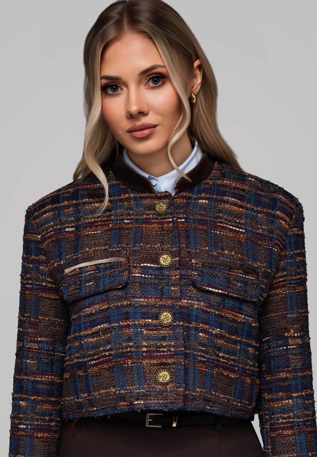 Elegant short jacket with classic sleeves. Made of fashionable channeled fabric, enriched with gold interlacing, which gives it a luxurious character. The entire fabric, including the lining, is 100% polyester. The jacket is distinguished by a collar and gold decorative buttons, which it is fastened with. Additional details include cuffs, collar and pocket patches made of velour, which creates a sophisticated contrast of textures. The cuffs are further decorated with buttons, and functionality is provided by two pockets with patches.