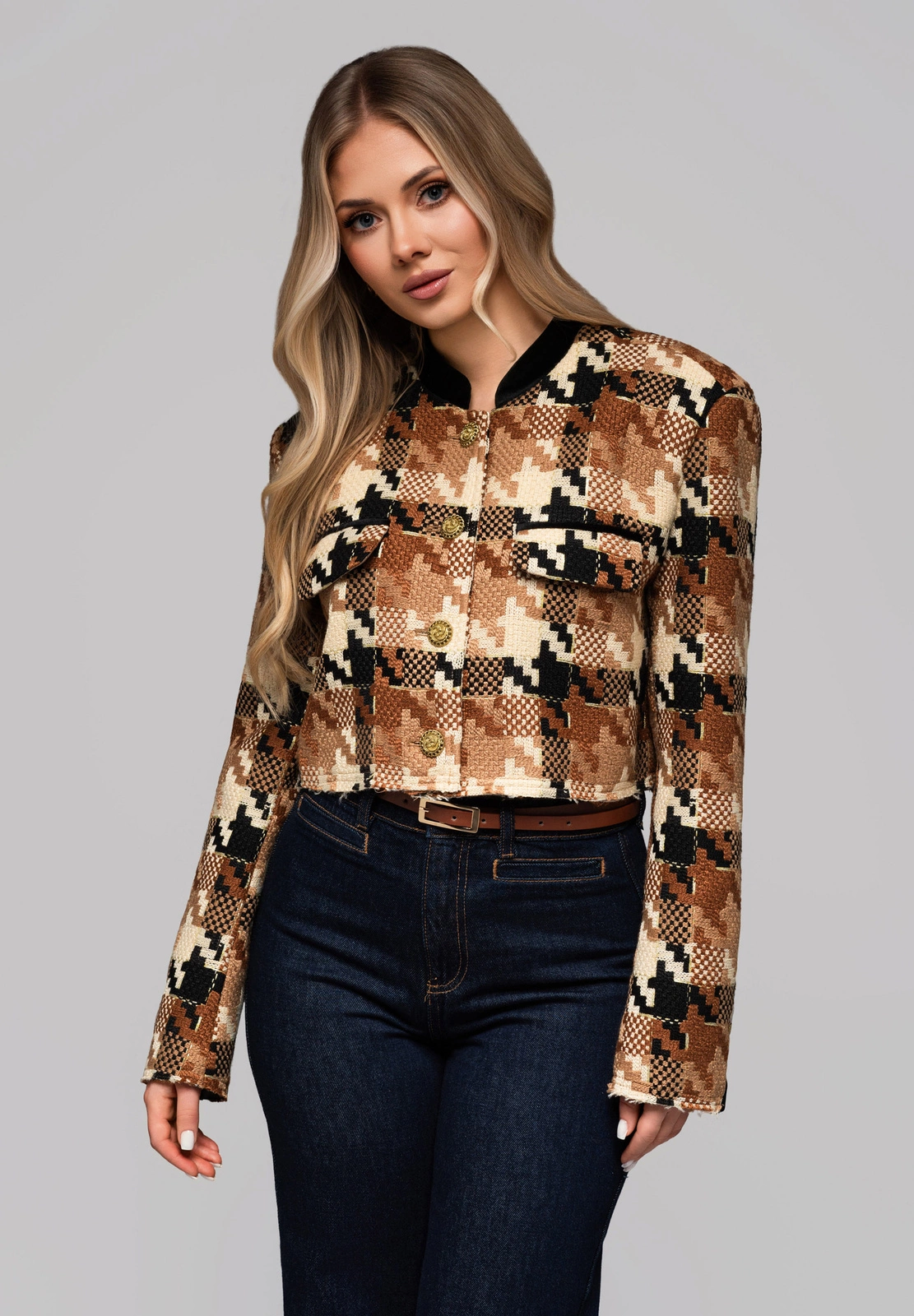 Elegant short jacket with classic sleeves. Made of high-quality fabric with 10% natural wool, woven in a modern pattern. The interior of the jacket is finished with a 100% polyester lining. The model has a fashionable collar and is fastened with gold decorative buttons. A detail that enhances the aesthetics are velour trims on the collar, cuffs and patches of two pockets. The cuffs are additionally decorated with buttons, which gives the whole look a chic touch.