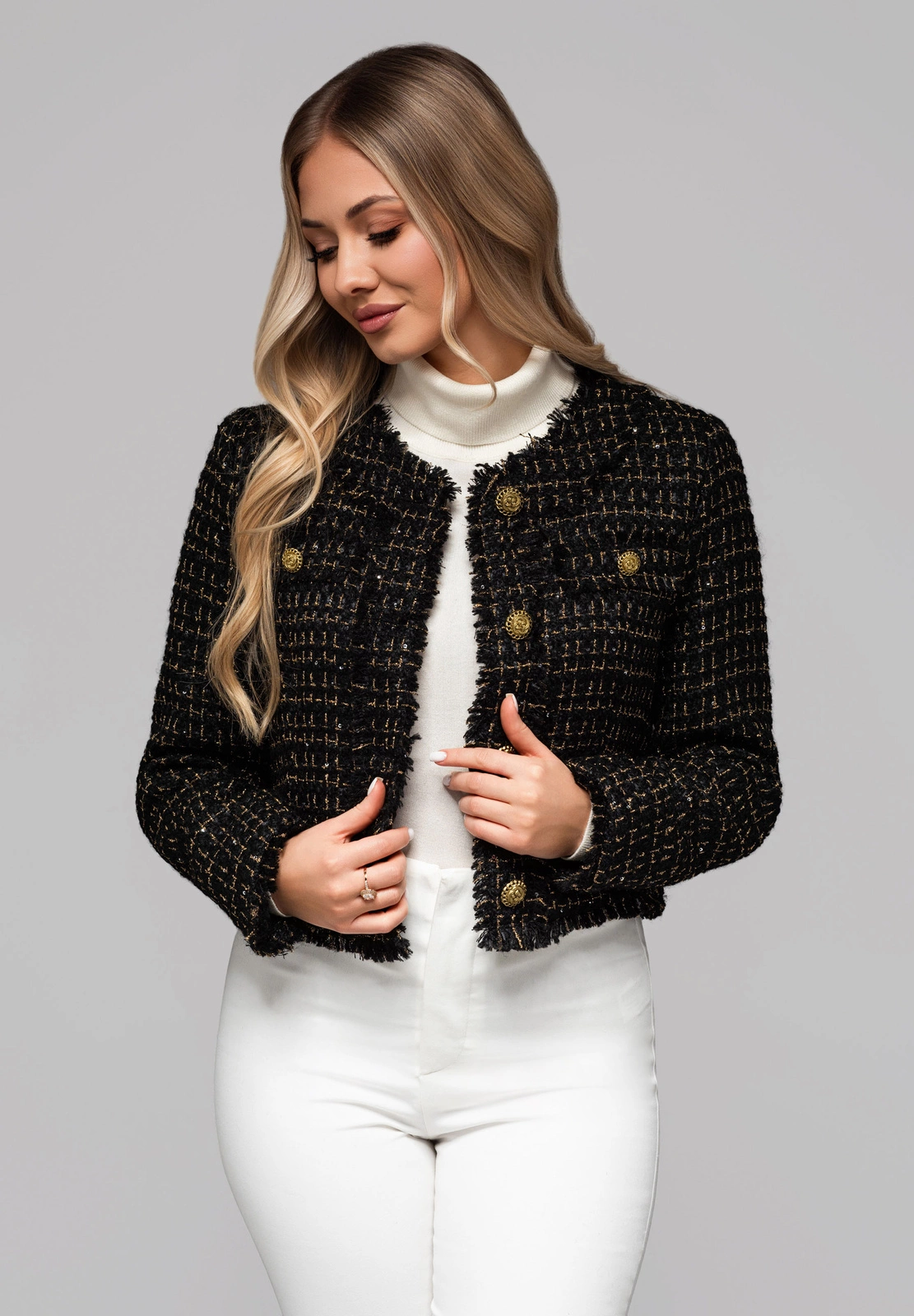 Elegant short jacket with classic sleeves. Made of fashionable channeled fabric, enriched with gold interlacing, which gives it a luxurious character. The entire fabric, including the lining, is 100% polyester. The jacket is distinguished by a collar and gold decorative buttons, which it is fastened with. Additional details include cuffs, collar and pocket patches made of velour, which creates a sophisticated contrast of textures. The cuffs are further decorated with buttons, and functionality is provided by two pockets with patches.