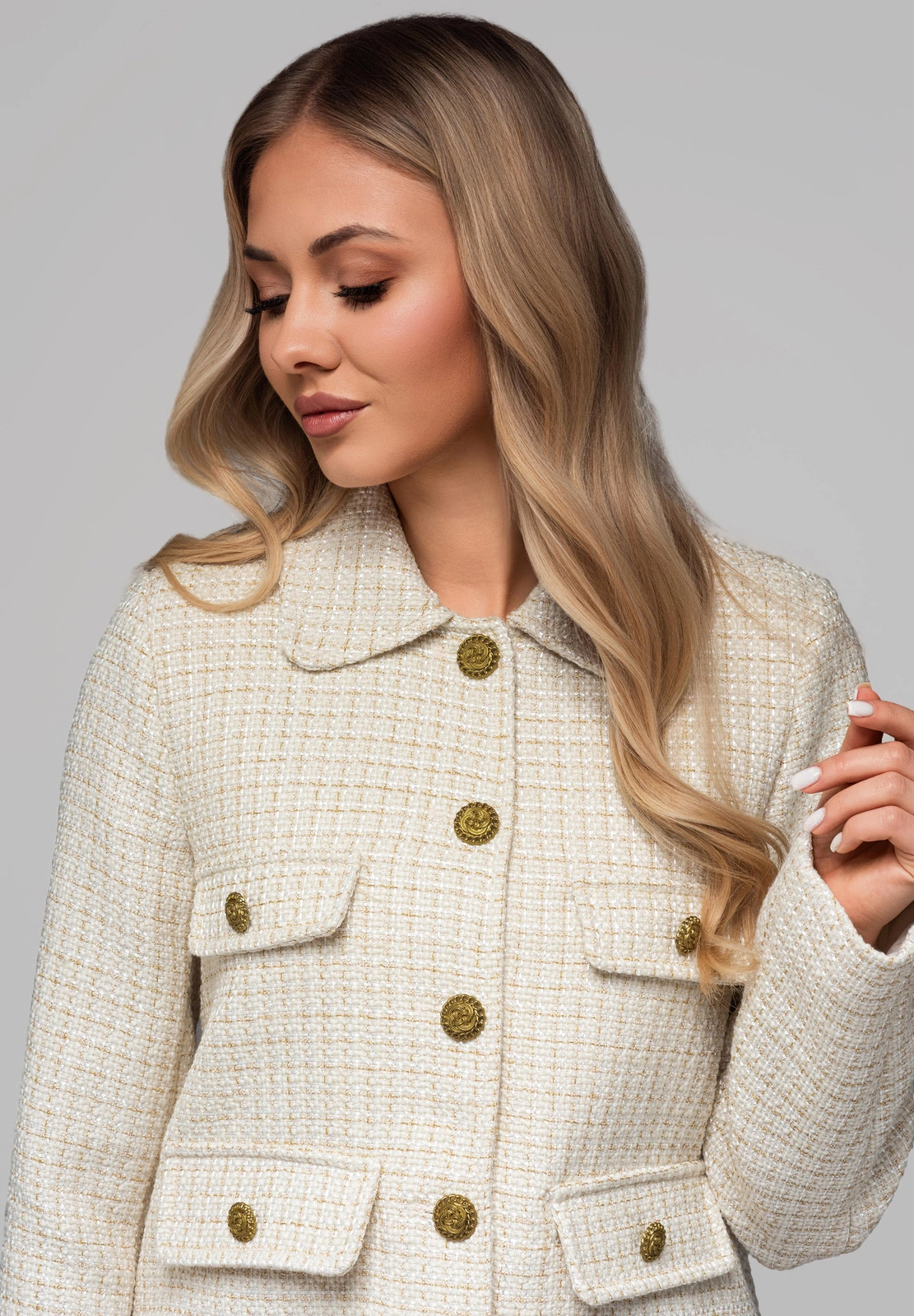 Gold decorative buttons on the fastening and pockets.