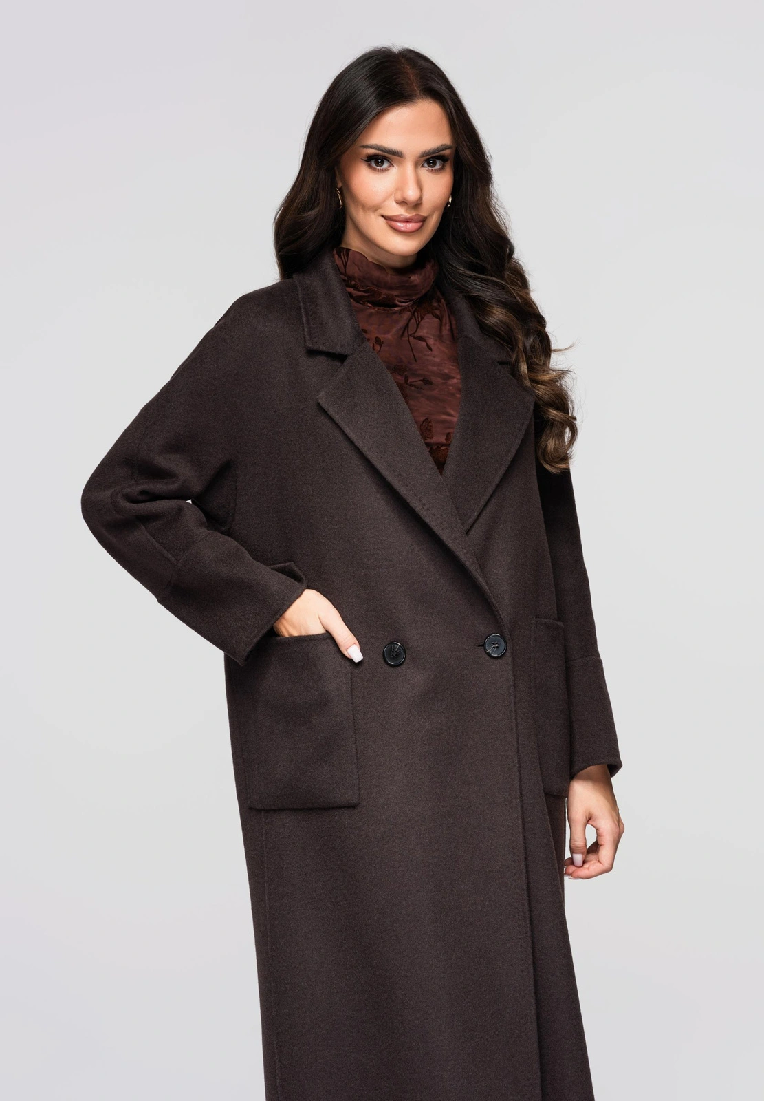 A comfortable long coat with a fashionable oversized cut that guarantees freedom of movement. It is a double-breasted, buttoned model. The outer material is a warm blend with dominant wool (52.4%), polyester, viscose, acrylic and polyamide, which has a fine bristle. The coat has a classic reverse (navy) collar and is finished on the inside with a polyester and viscose lining. The design includes an opening at the back for better walking comfort and two practical pockets with flaps. Distinctive details include decorative tortoiseshell buttons at the cuffs and imitation pockets located on the chest