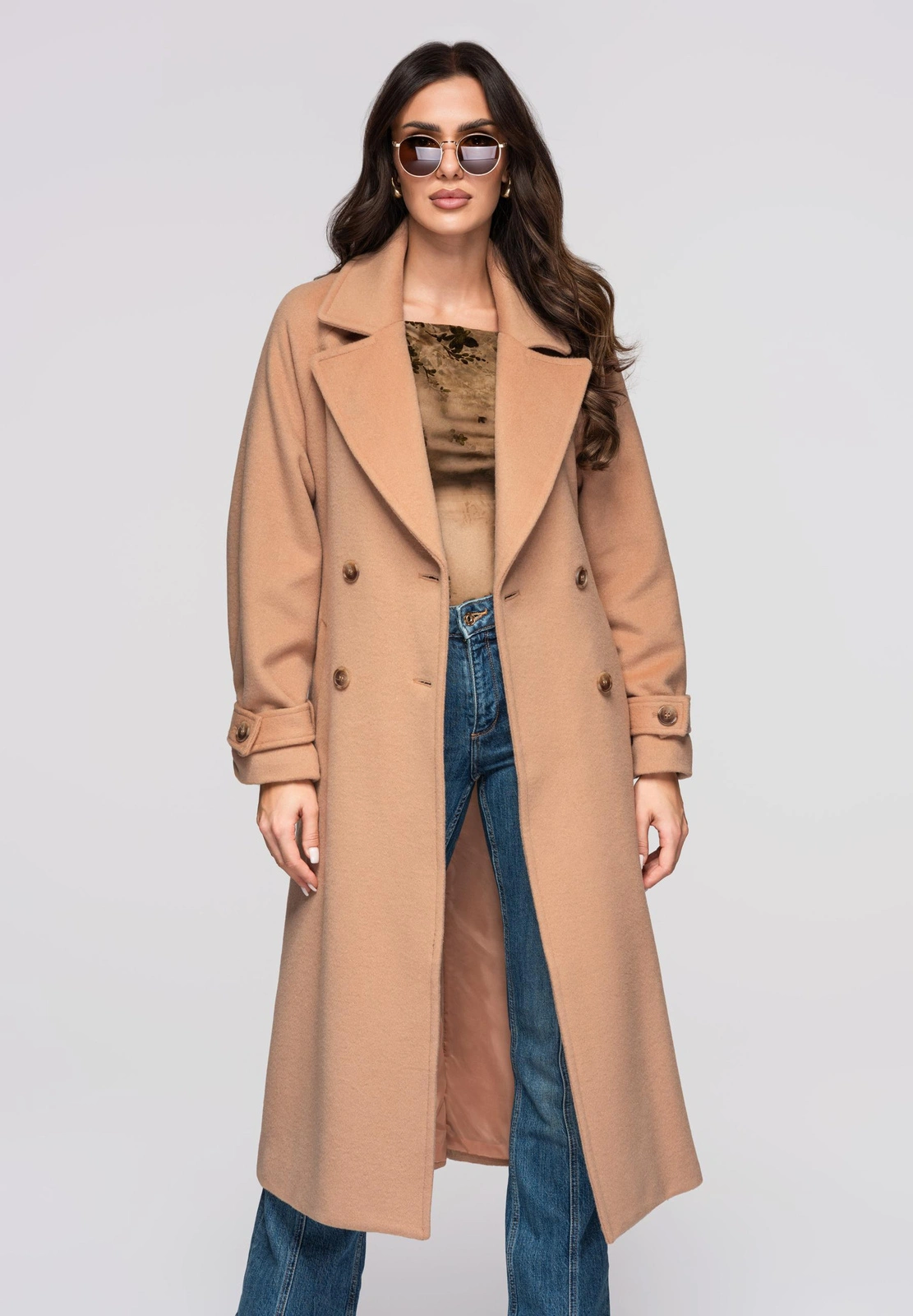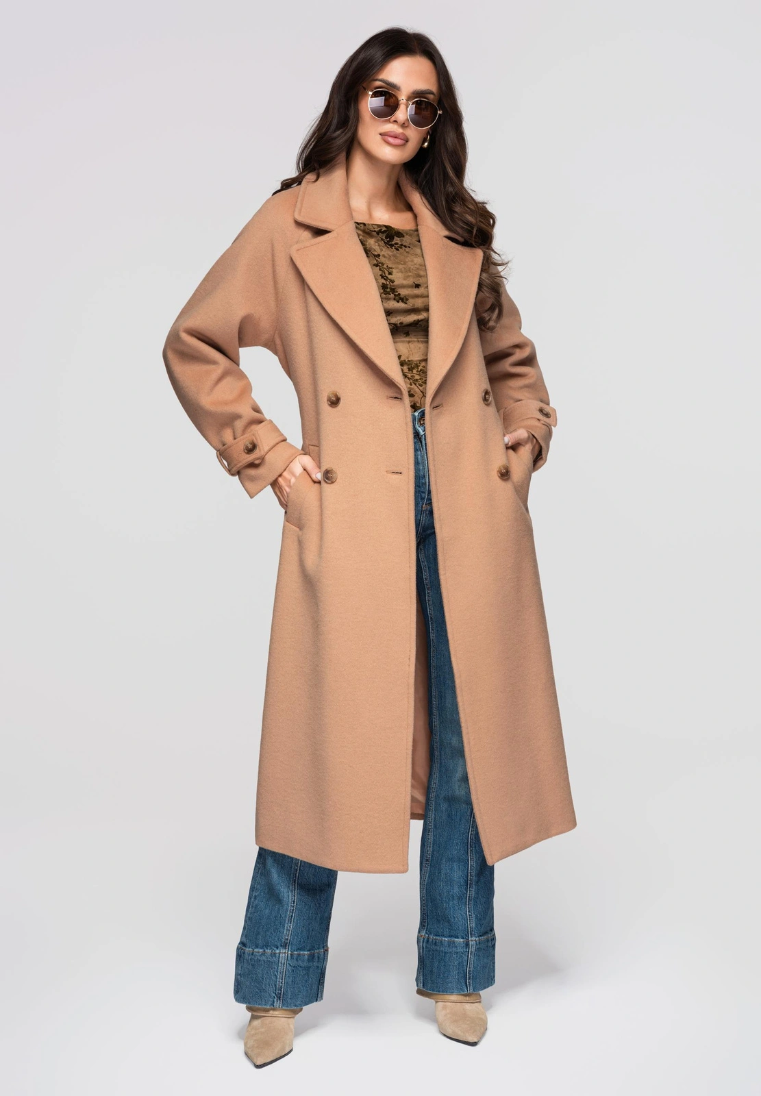 A comfortable long coat with a fashionable oversized cut that guarantees freedom of movement. It is a double-breasted, buttoned model. The outer material is a warm blend with dominant wool (52.4%), polyester, viscose, acrylic and polyamide, which has a fine bristle. The coat has a classic reverse (navy) collar and is finished on the inside with a polyester and viscose lining. The design includes an opening at the back for better walking comfort and two practical pockets with flaps. Distinctive details include decorative tortoiseshell buttons at the cuffs and imitation pockets located on the chest
