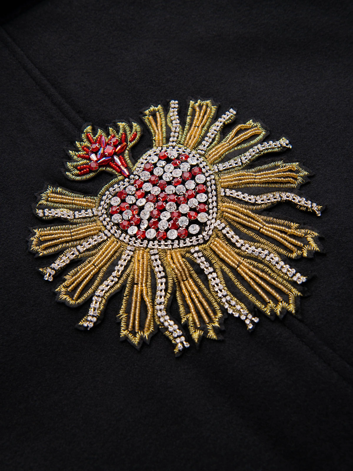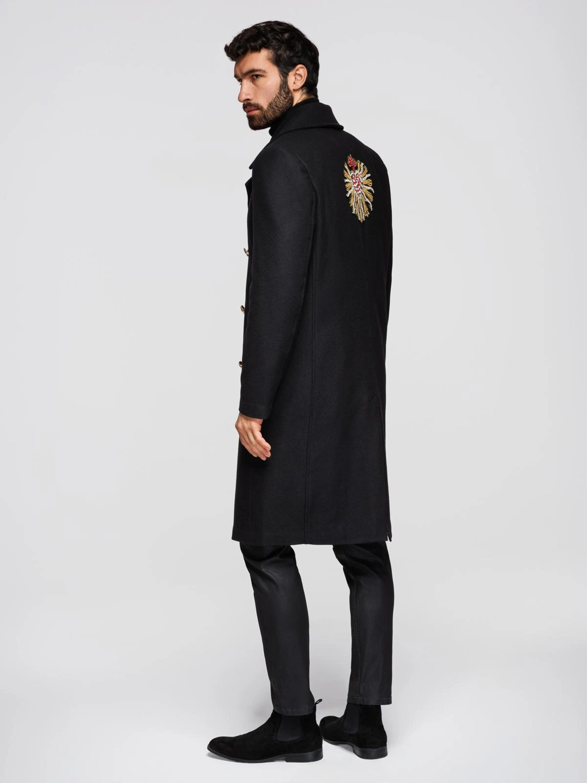 Men's coat from the Heritage line with a regular cut, sewn from smooth fabric. Model with double-breasted gold button closure with coat of arms motif, back zipper and wide collar lapels. Outside, two side pockets, inside a practical chest pocket. The center is finished with a jacquard quilted lining in a diamond pattern. The whole is slightly insulated with polyester filling. There are decorative beaded appliqués on the front and back.
