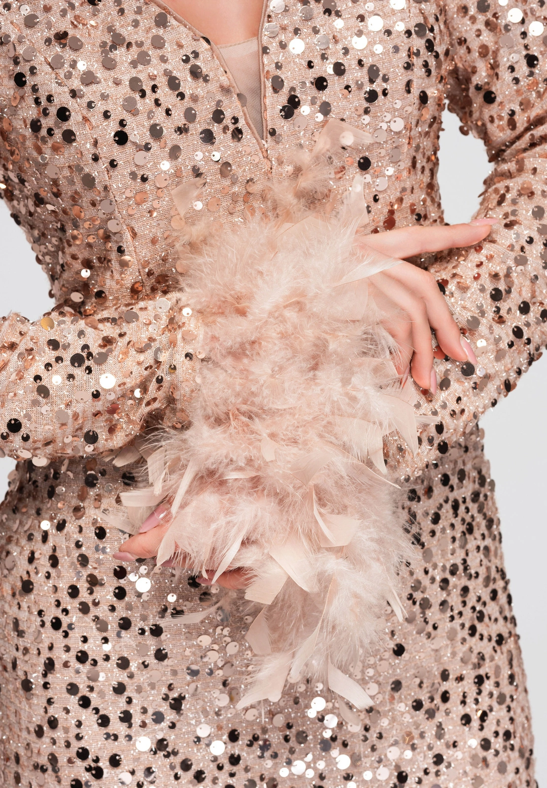 - decorative feathers at the sleeves
