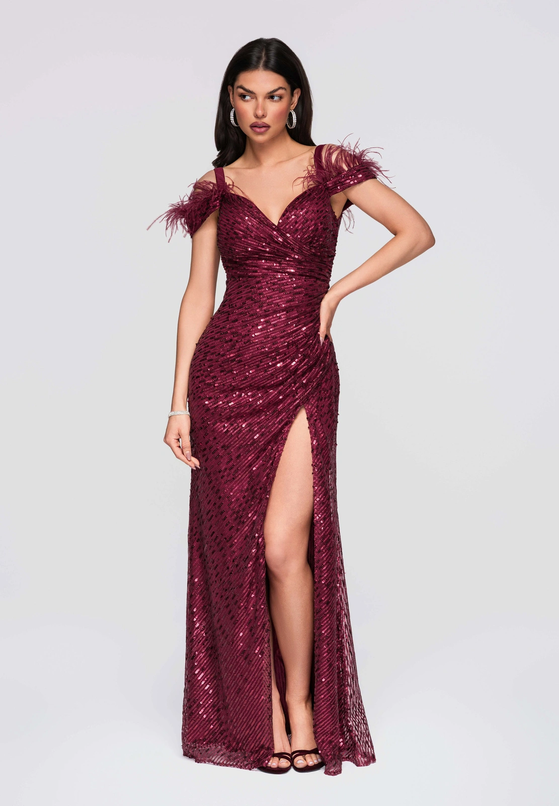 A maxi length evening dress, designed in a simple, fitted cut that emphasizes the silhouette. The model set on straps with an additional decorative layer, with a deep neckline and a striking draping at the waist, which stabilizes the arrangement of the fabric. The design is based on an elastic knit with an opaque inner layer and an outer layer richly decorated with sequins. The whole is complemented by an asymmetrical front slit and a zipper closure, ensuring comfort and a good fit. The model features decorative feather appliqués and full sequin coverage over the entire surface of the dress.