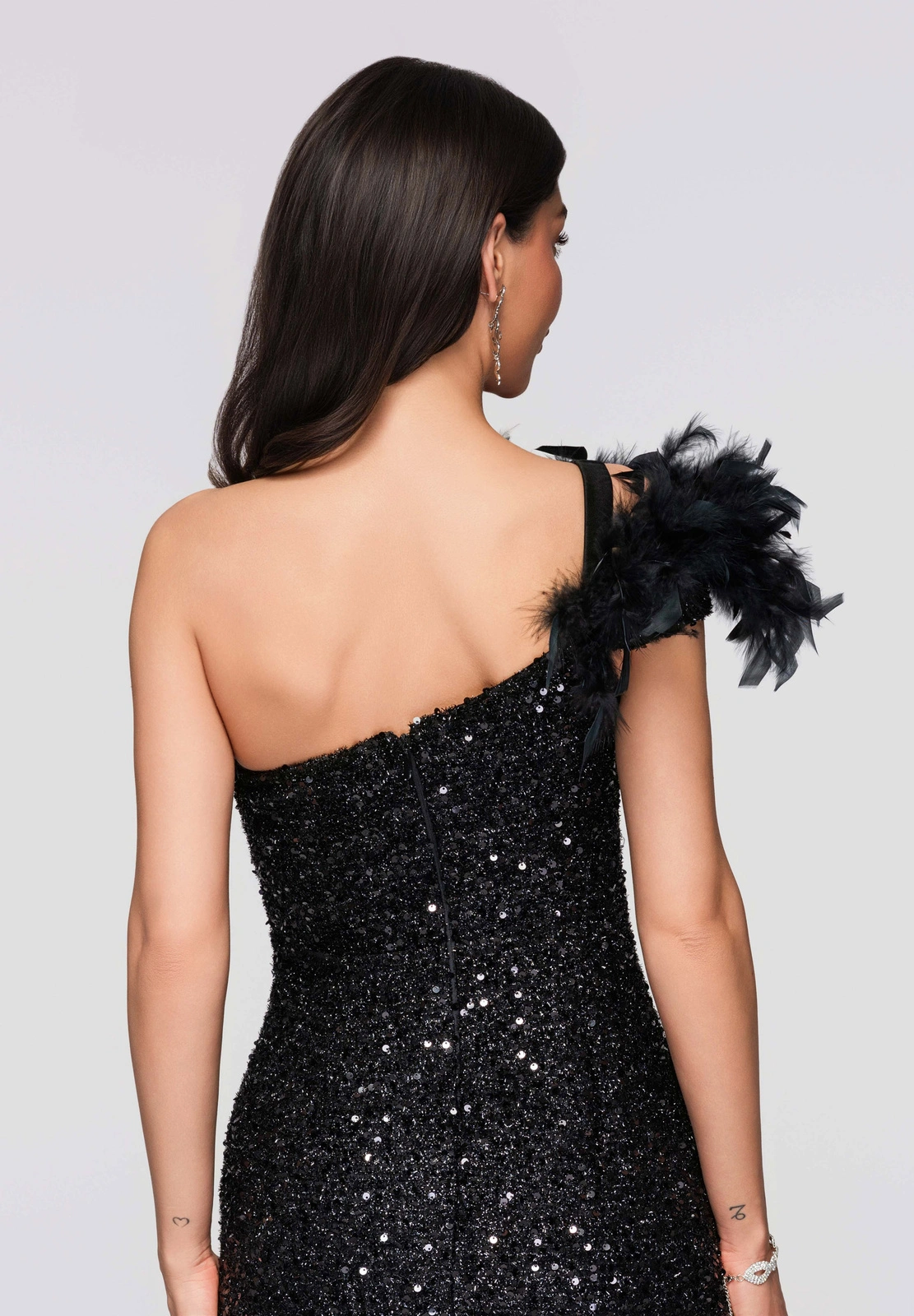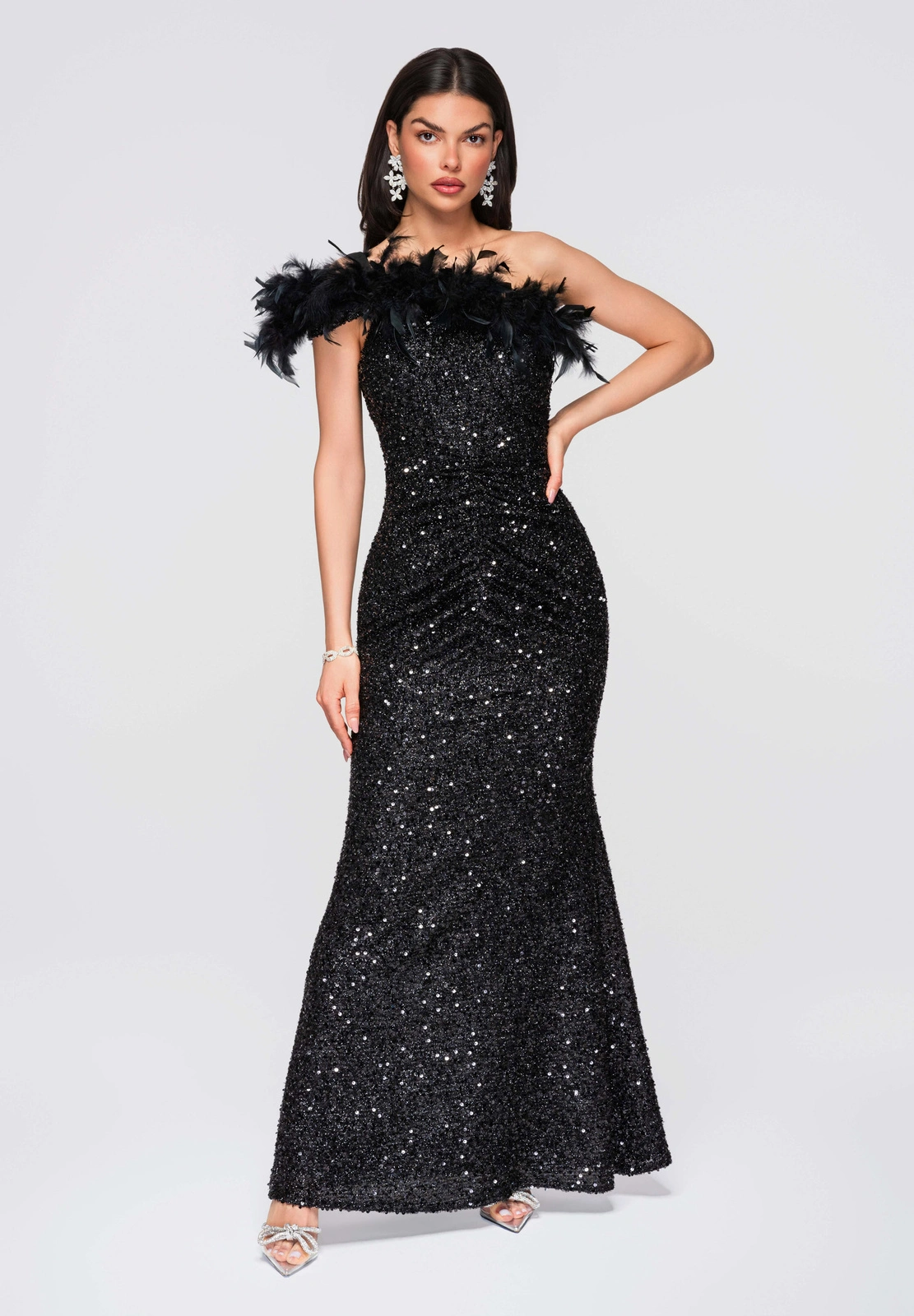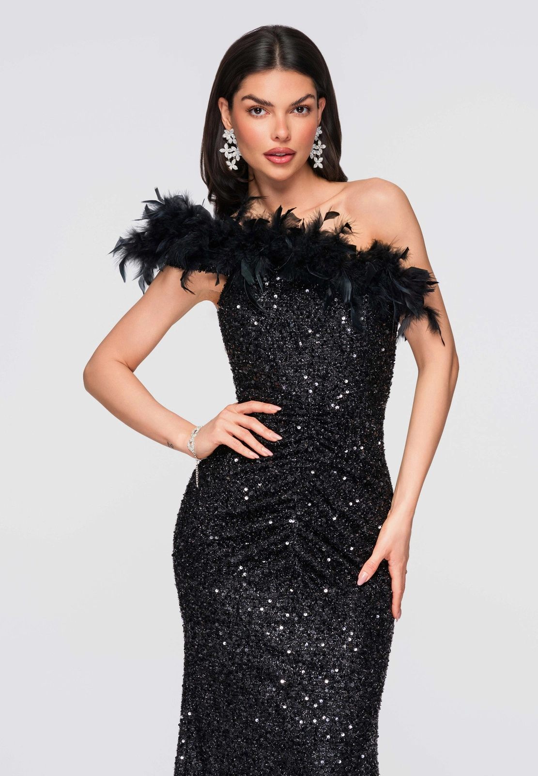 A fitted maxi evening dress, designed with an asymmetrical neckline and a one-shoulder construction with an overlapping shoulder strap. The model has a pronounced fit in the upper and middle part of the silhouette and draping in the belly area, which is a design element. A zipper closure located on the back provides stability and an aesthetic finish. The outer layer is made of knitted fabric richly decorated with sequins and feathers in the neckline area, the inner material slightly stretchy, increasing the comfort of wearing.