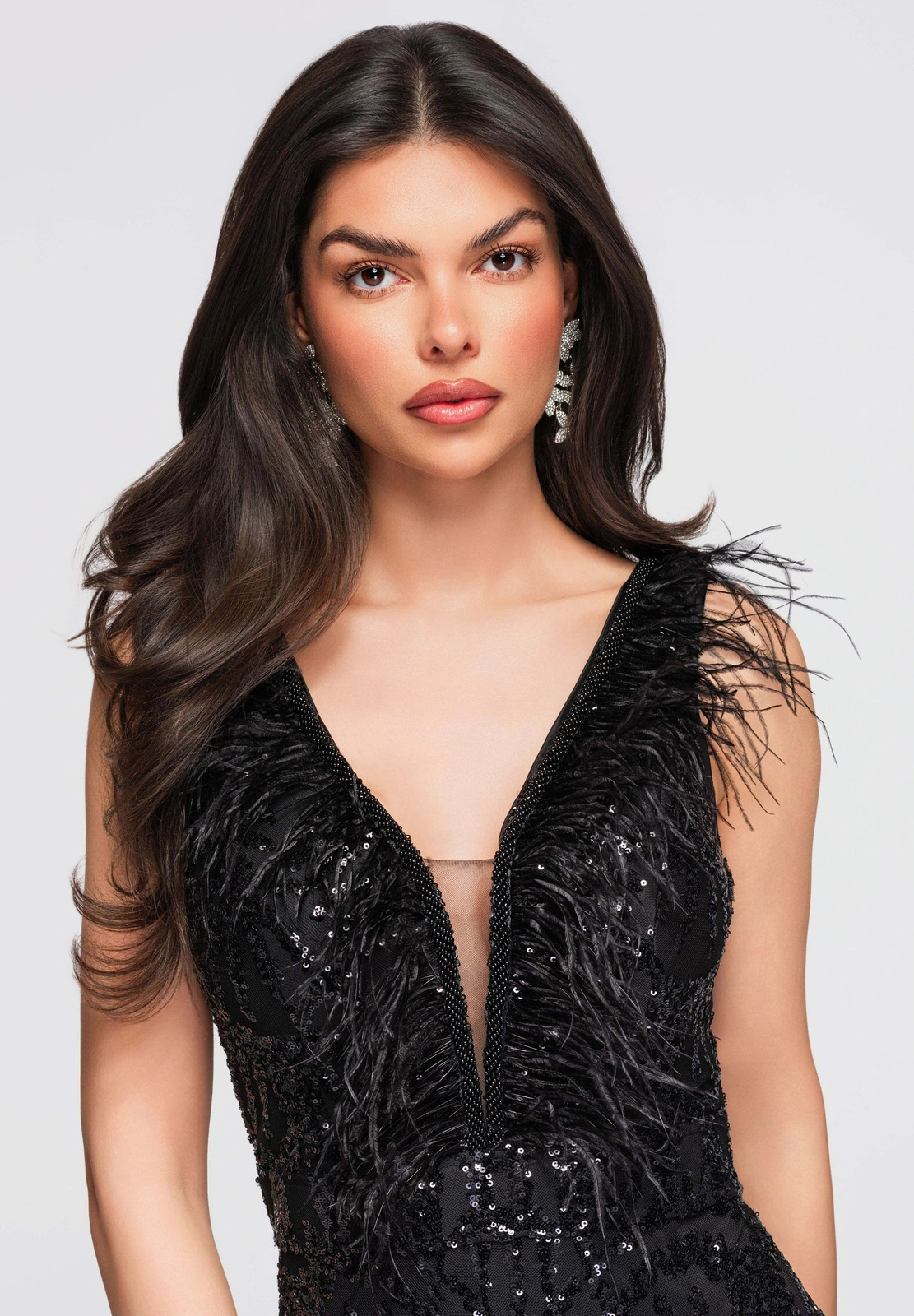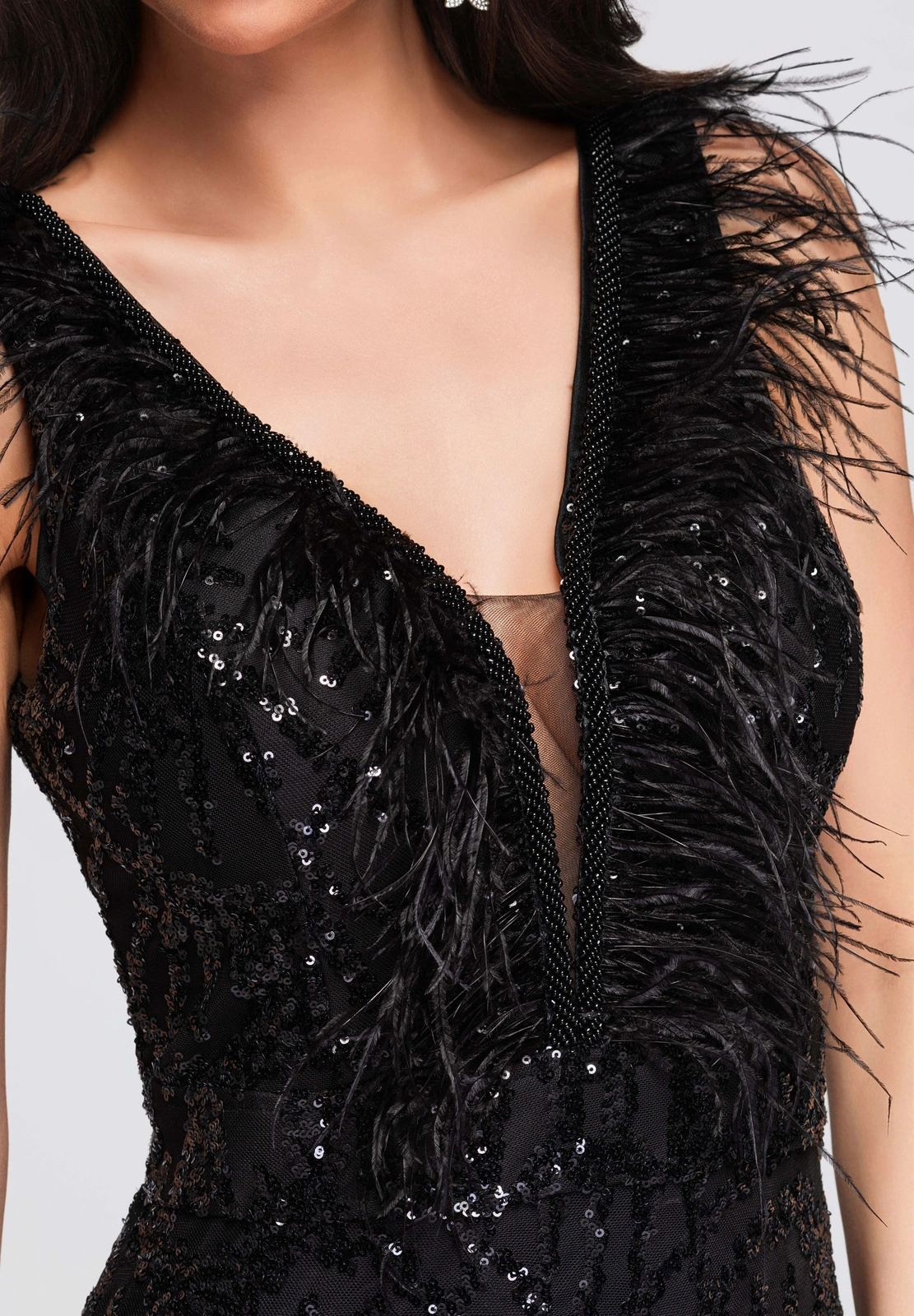 Evening maxi dress with a fitted mermaid cut, emphasizing the silhouette line. Model on a thicker strap with a deep envelope neckline, finished with a transparent insert to stabilize the bust line. Design with a slit at the front on the leg and a concealed zipper at the back. Entirely made of stretch knit fabric with decorative sequin patterned lace, complemented with feather and bead appliqués in the neckline area. The outer material is delicately translucent, the interior is opaque, ensuring comfort of wearing and proper fit.