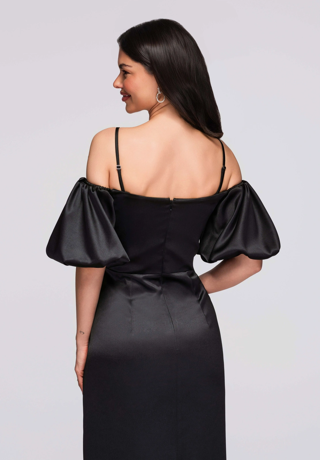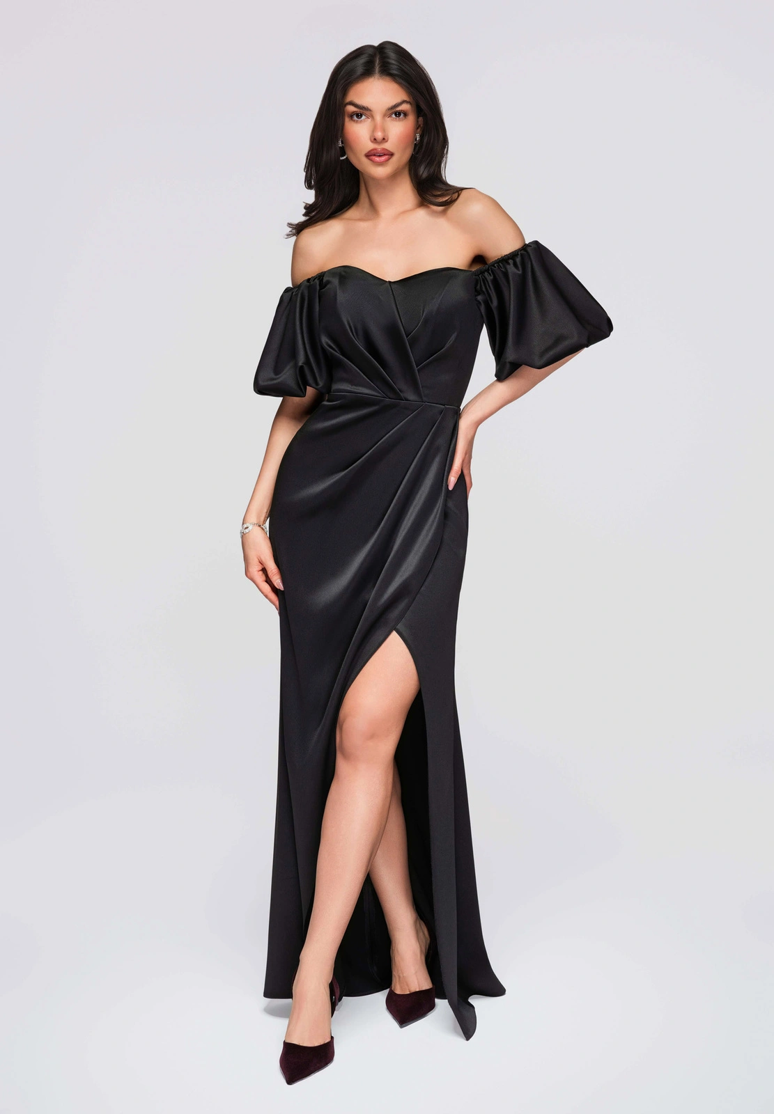 Evening satin maxi dress with an asymmetrical cut. A model with a fitted top, designed with the possibility of attaching thin straps and with buff sleeves falling on the shoulders. The design is enriched with creases in the upper part and around the waist, which organize the arrangement of the fabric and emphasize the silhouette. The bottom is long, with an asymmetrical slit at the front. The dress is fastened with a covered zipper. Made of smooth fabric with a subtle, delicate sheen.