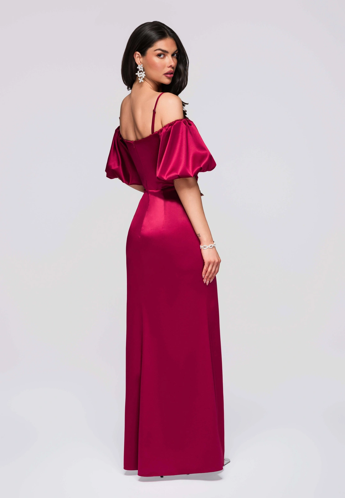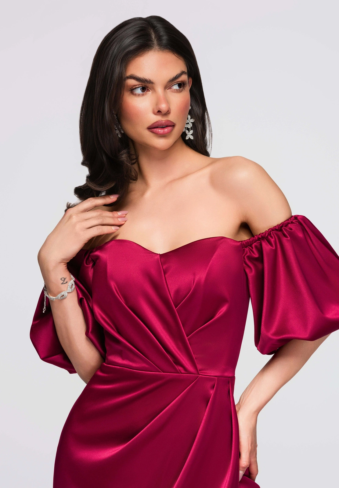 Evening satin maxi dress with an asymmetrical cut. A model with a fitted top, designed with the possibility of attaching thin straps and with buff sleeves falling on the shoulders. The design is enriched with creases in the upper part and around the waist, which organize the arrangement of the fabric and emphasize the silhouette. The bottom is long, with an asymmetrical slit at the front. The dress is fastened with a covered zipper. Made of smooth fabric with a subtle, delicate sheen.