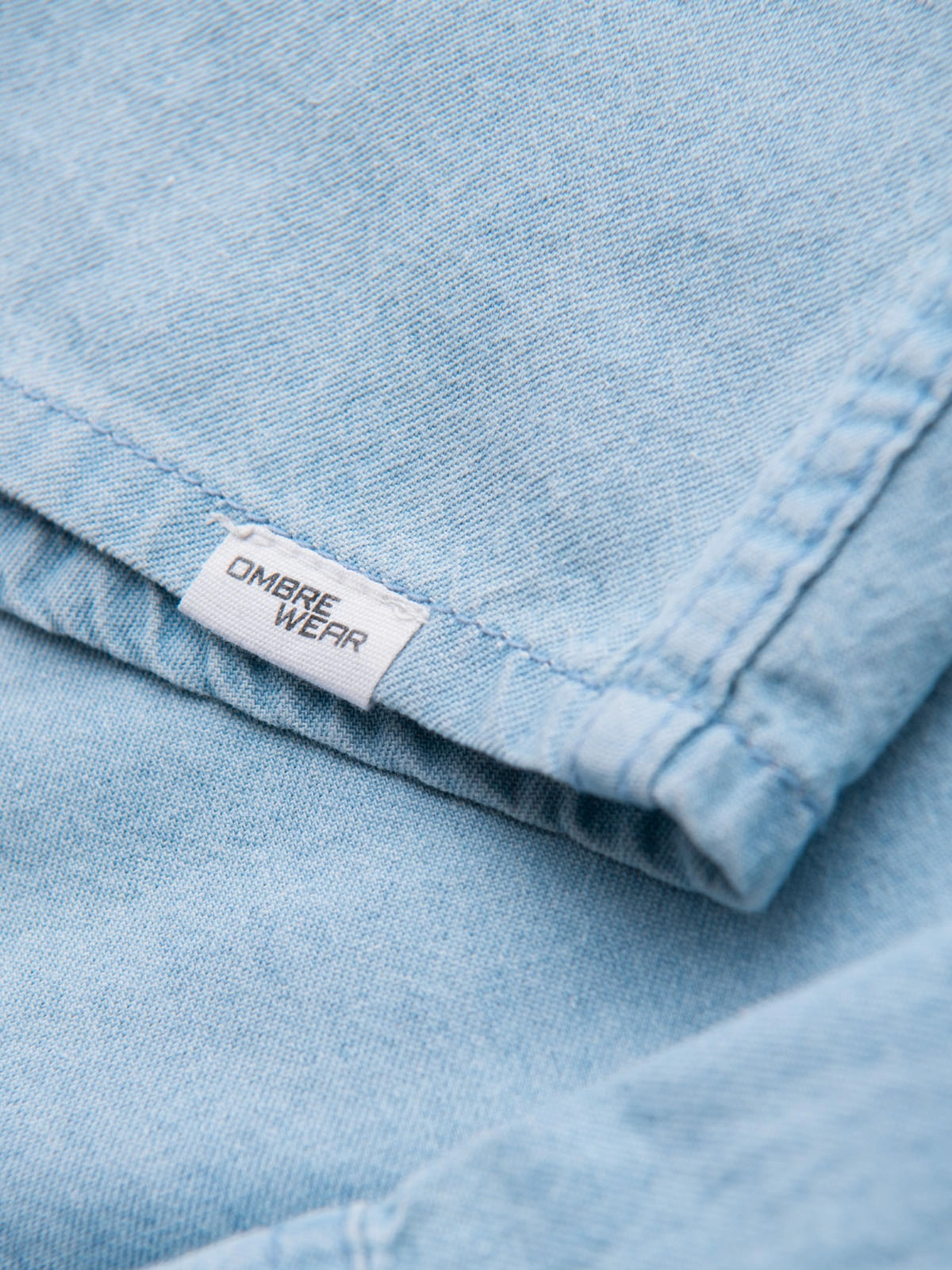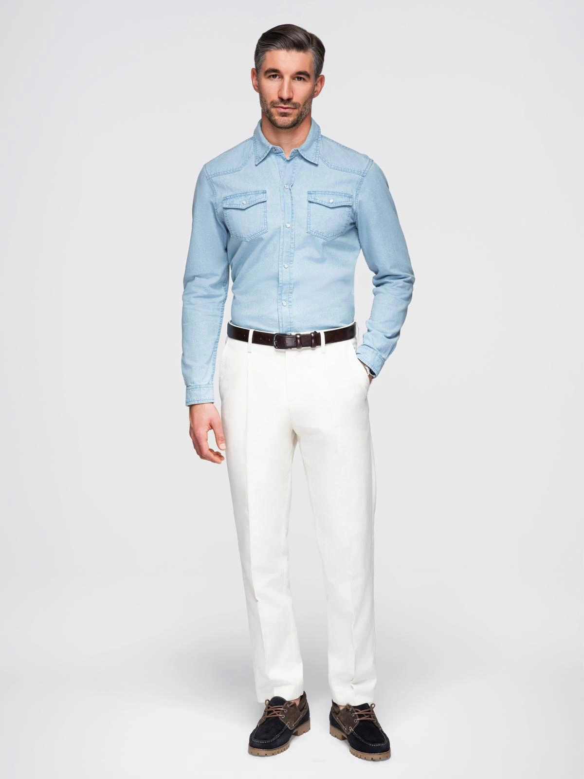 Men's regular cut denim shirt with long sleeves and a classic collar. Made of thin, smooth cotton denim. Equipped with symmetrical patch chest pockets with flaps, fastened with metal press studs along the length and at the cuffs. It features contoured topstitching on the front and back, a rounded hem and a woven label at the bottom edge.