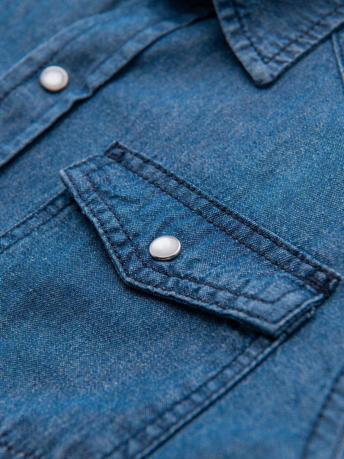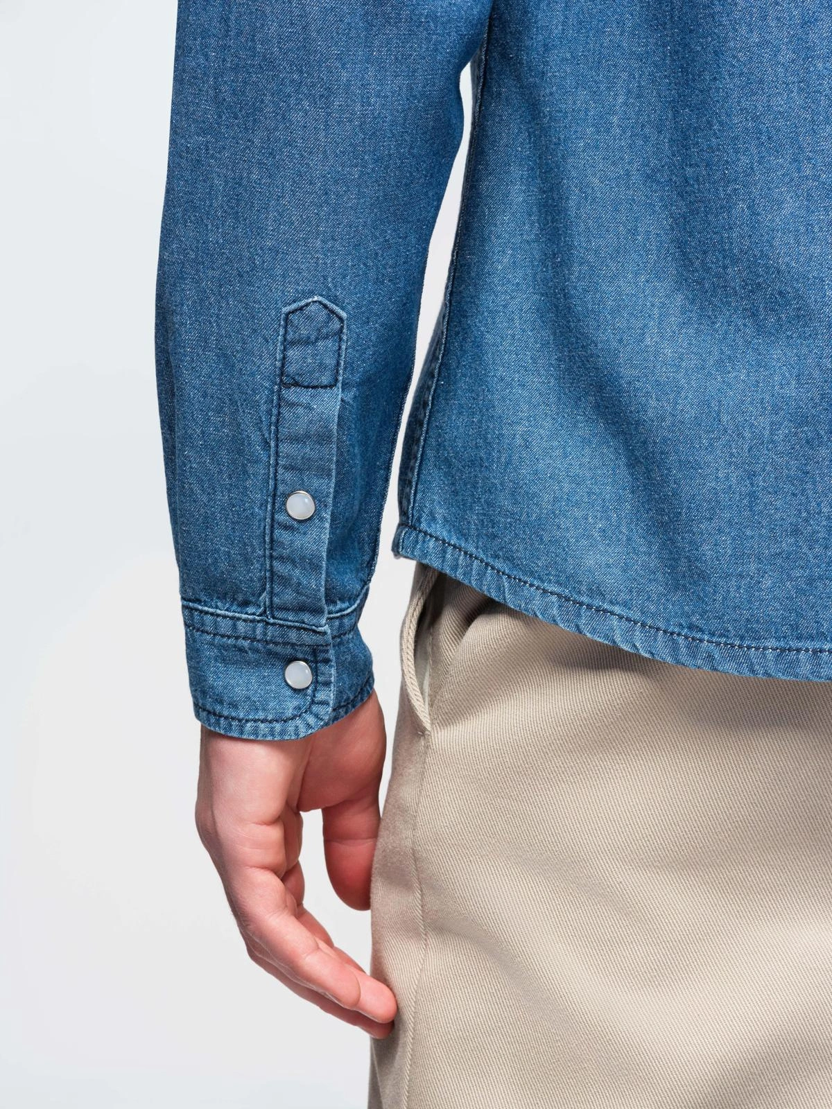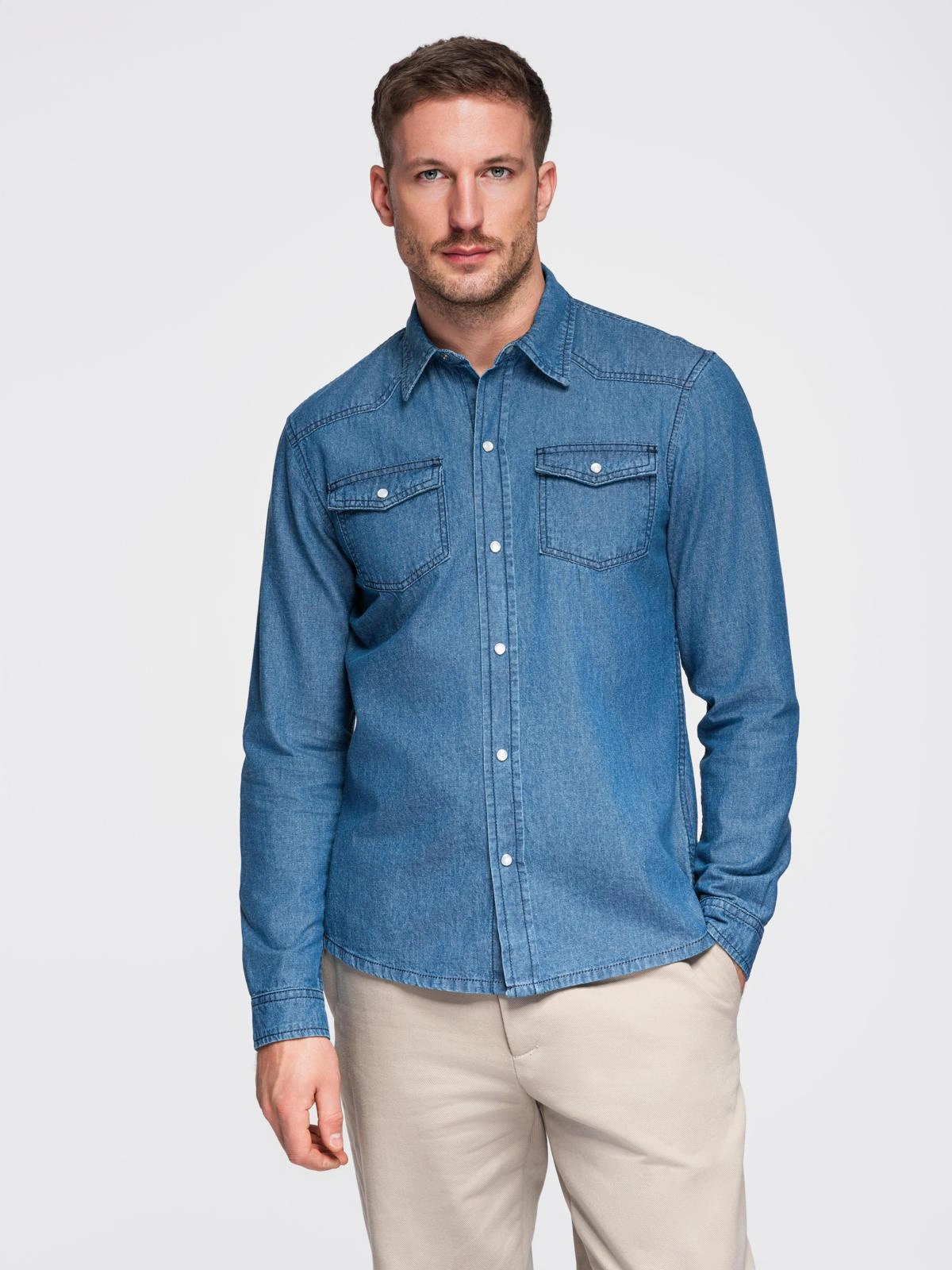Men's regular cut denim shirt with long sleeves and a classic collar. Made of thin, smooth cotton denim. Equipped with symmetrical patch chest pockets with flaps, fastened with metal press studs along the length and at the cuffs. It features contoured topstitching on the front and back, a rounded hem and a woven label at the bottom edge.