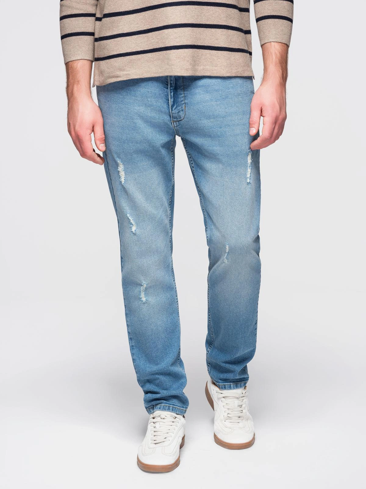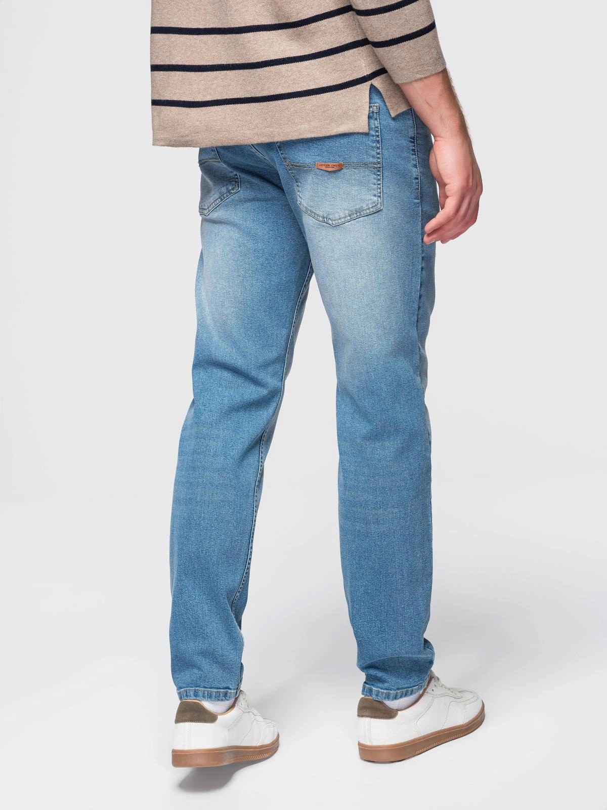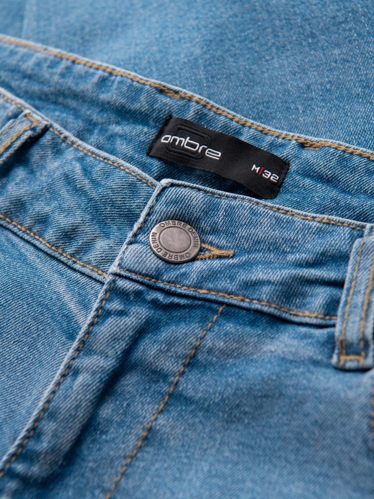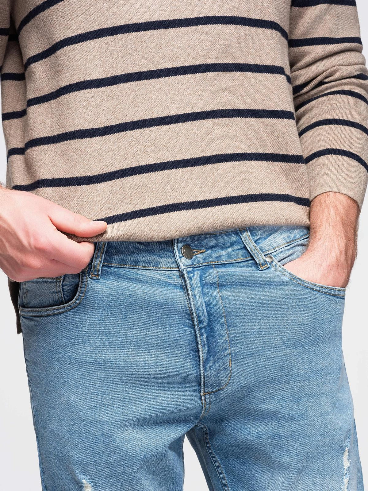 Men's slim fit jeans from the Ombre Denim line, made of denim fabric. Elastic admixture promotes freedom of movement and shape retention after washing. The finishing touches include a washed effect, rubbing and localized rubbing. The model has two front and two back patch pockets, cotton pocket bags improve comfort. The whole is completed with metal accessories and a discreet imitation leather patch.