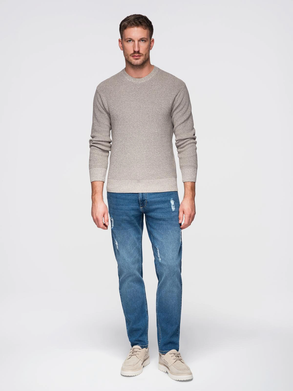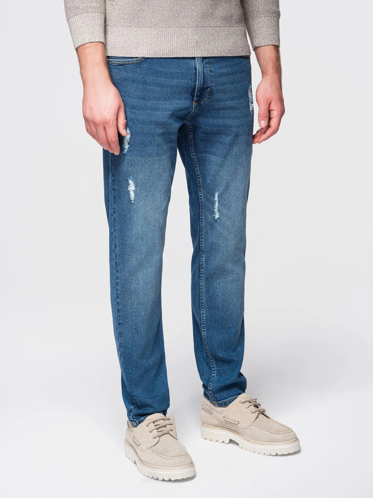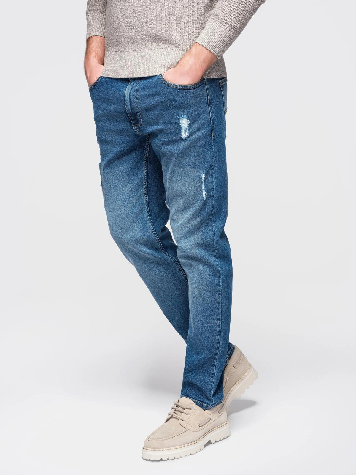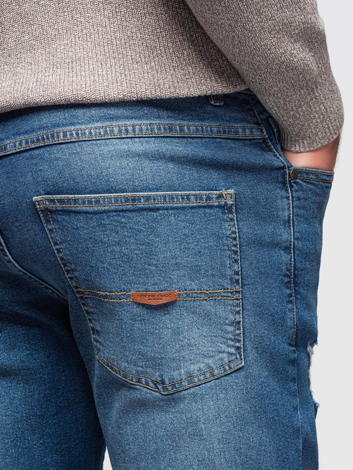 Men's slim fit jeans from the Ombre Denim line, made of denim fabric. Elastic admixture promotes freedom of movement and shape retention after washing. The finishing touches include a washed effect, rubbing and localized rubbing. The model has two front and two back patch pockets, cotton pocket bags improve comfort. The whole is completed with metal accessories and a discreet imitation leather patch.