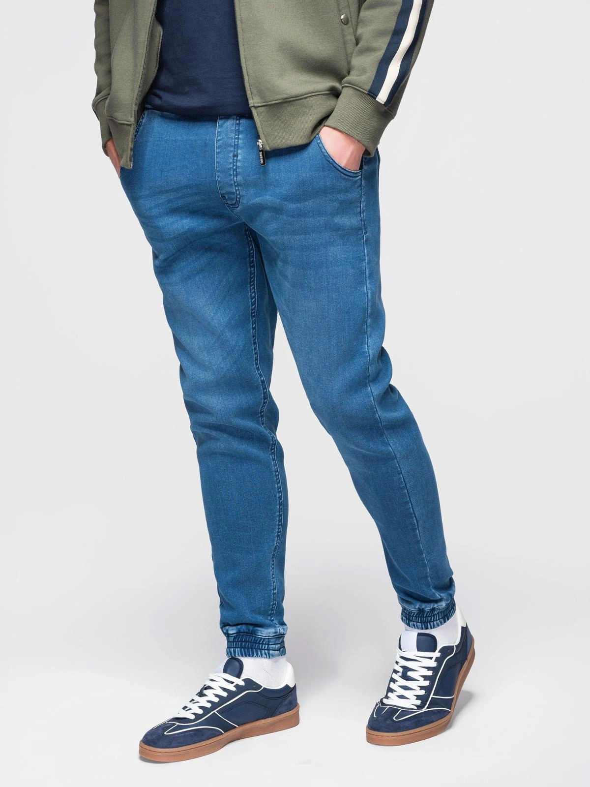Men's denim pants from the Ombre Denim line in jogger cut, sewn from woven denim fabric with an elastic blend. Finished with pronounced rubbing on the thighs, at the pockets and on the knees. The waistband with sewn-in elastic and the legs ending in a tunnel with an elastic band ensure a stable fit. Two inset pockets on the front and two patch pockets on the back; cotton pocket bags add durability. The model is completed with old silver-colored metal rivets and eyelets, branded cord ends and a faux leather patch on the back pocket.