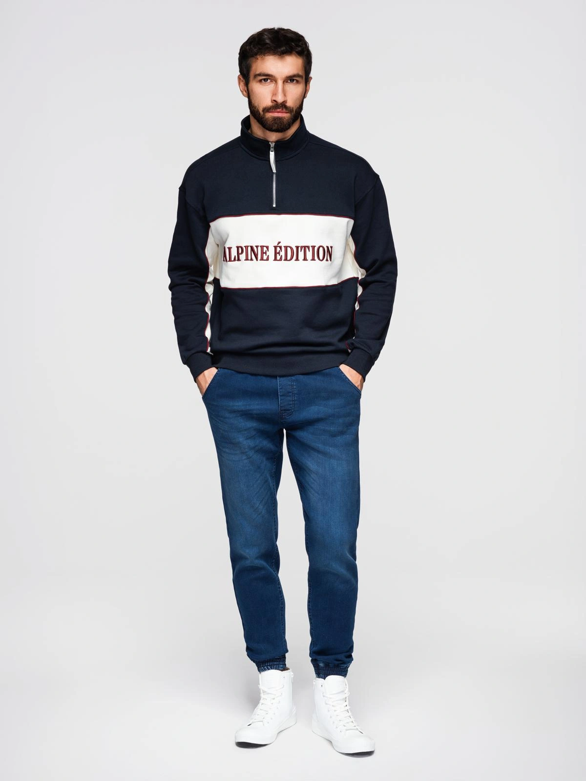 Men's denim pants from the Ombre Denim line in jogger cut, sewn from woven denim fabric with an elastic blend. Finished with pronounced rubbing on the thighs, at the pockets and on the knees. The waistband with sewn-in elastic and the legs ending in a tunnel with an elastic band ensure a stable fit. Two inset pockets on the front and two patch pockets on the back; cotton pocket bags add durability. The model is completed with old silver-colored metal rivets and eyelets, branded cord ends and a faux leather patch on the back pocket.